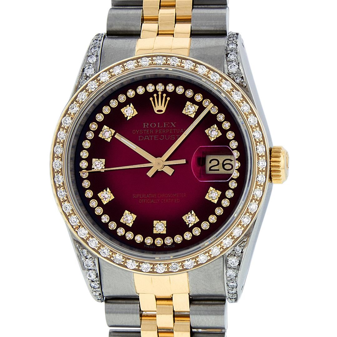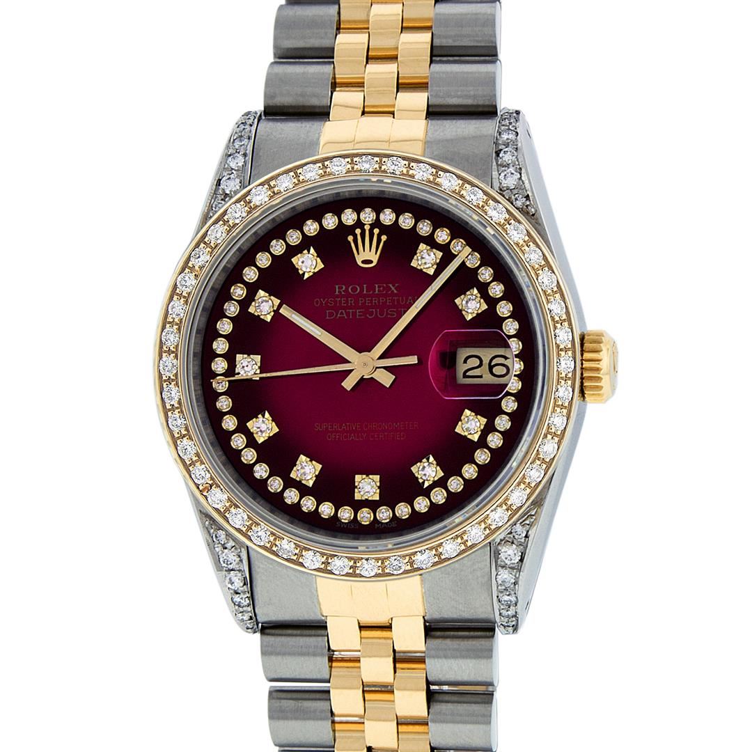 One Mens Yellow Gold Two Tone Rolex Datejust Polished, Serviced & Electronically Tested, Yellow Gold & Stainless Steel Case: 36mm, Custom Diamond Lugs: 28 Diamonds In Lugs, Color: G to H, Clarity: SI-VS, Yellow Gold Crown, Custom Bezel: 18K Yellow Gold Beadset Diamond Bezel, Diamond Count: 44 Diamonds On Bezel, Total Weight 1.00 Carat, Clarity: SI-VS, Color: G to H. New Custom Crystal: Scratch Resistant Synthetic Sapphire Cyclops Lens. Custom Hands: New Luminecent Hands. Movement: Automatic Winding Movement. Custom Dial: Red Vignette VVS Single Cut String Diamond Dial, Diamond Count: 58 Diamonds in Dial G To H In Color, VS In Clarity. Date Window: 3 O'Clock Position Date Display, Quickset, Model: Datejust. Condition: G-6 Extra Fine. Bracelet: Two Tone Yellow Gold & Stainless Steel Jubilee. Bright Polish. 7.0 Inch Length, Adjustable. Standard Clasp, With Rolex Logo. This Watch Has Been Serviced Time Tested And Is In Excellent Condition It Is Free Of All Scratches And Dents.