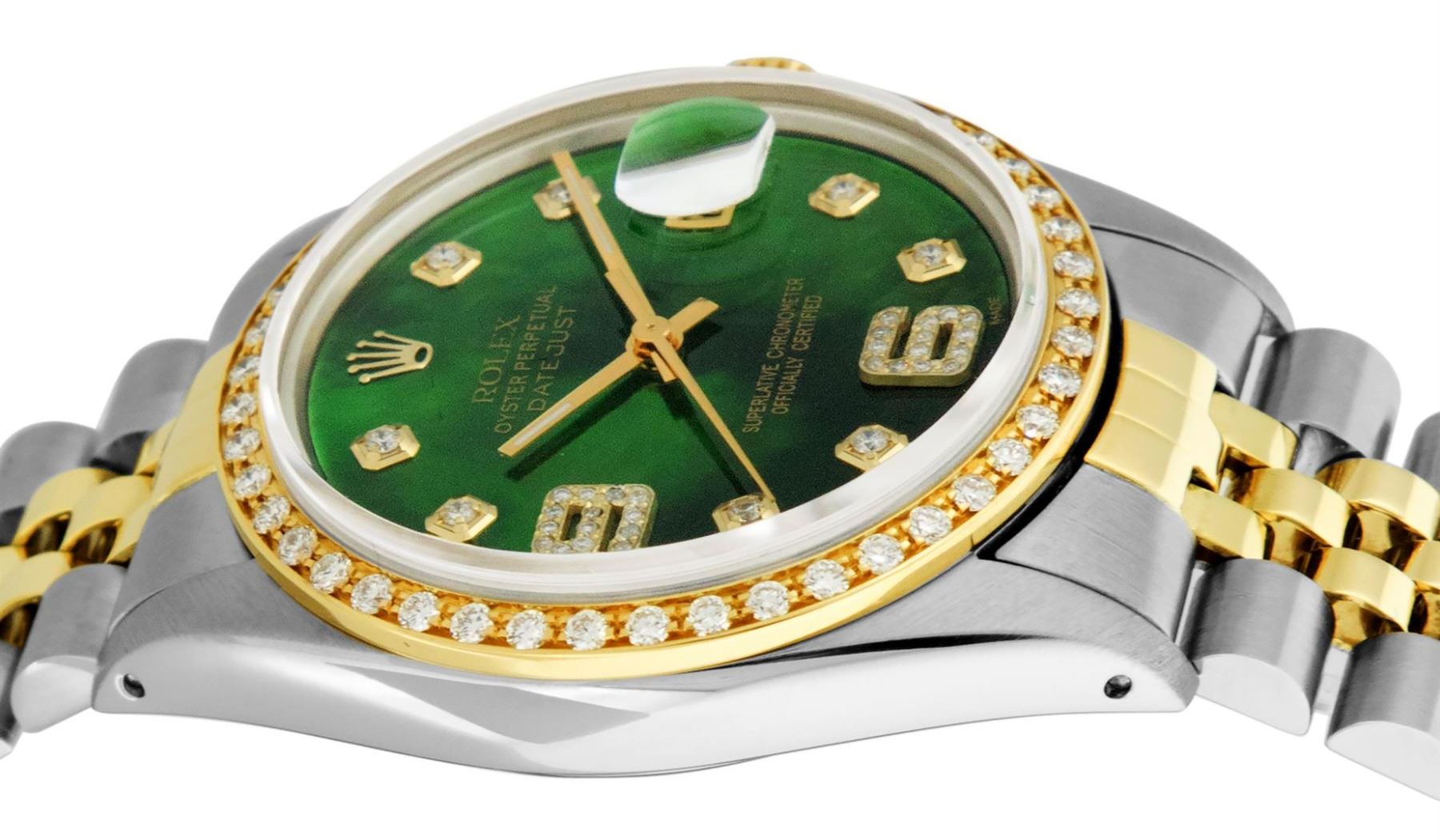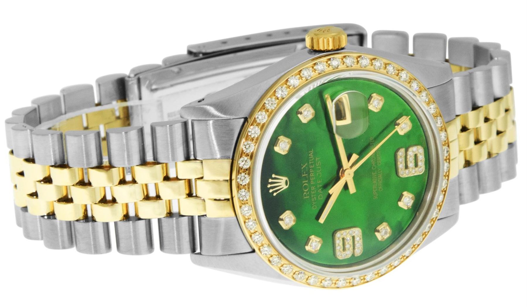 One Mens Pre Owned Yellow Gold Two Tone Rolex Datejust Polished, Serviced & Electronically Tested, Rolex Yellow Gold & Stainless Steel Case: 36mm, Rolex Yellow Gold Crown, Custom Bezel: New 18K Yellow Gold Bead set Diamond Bezel, Diamond Count: 44 Diamond