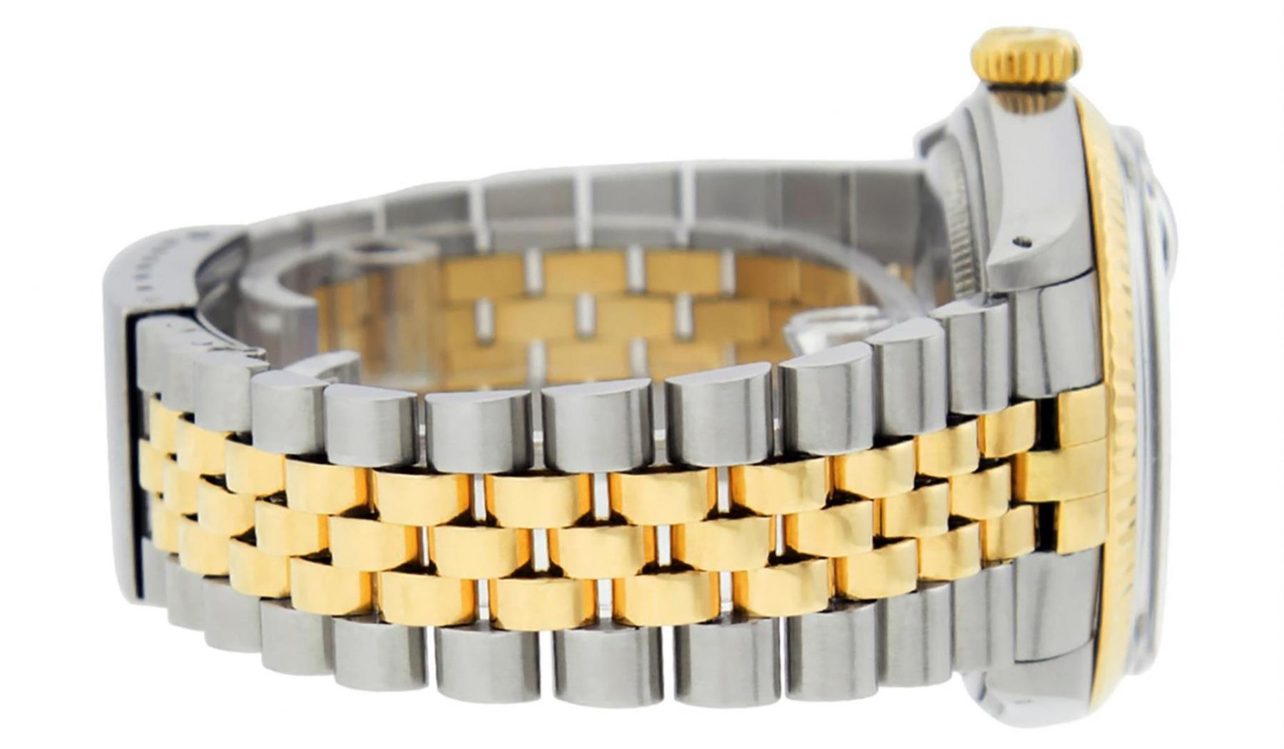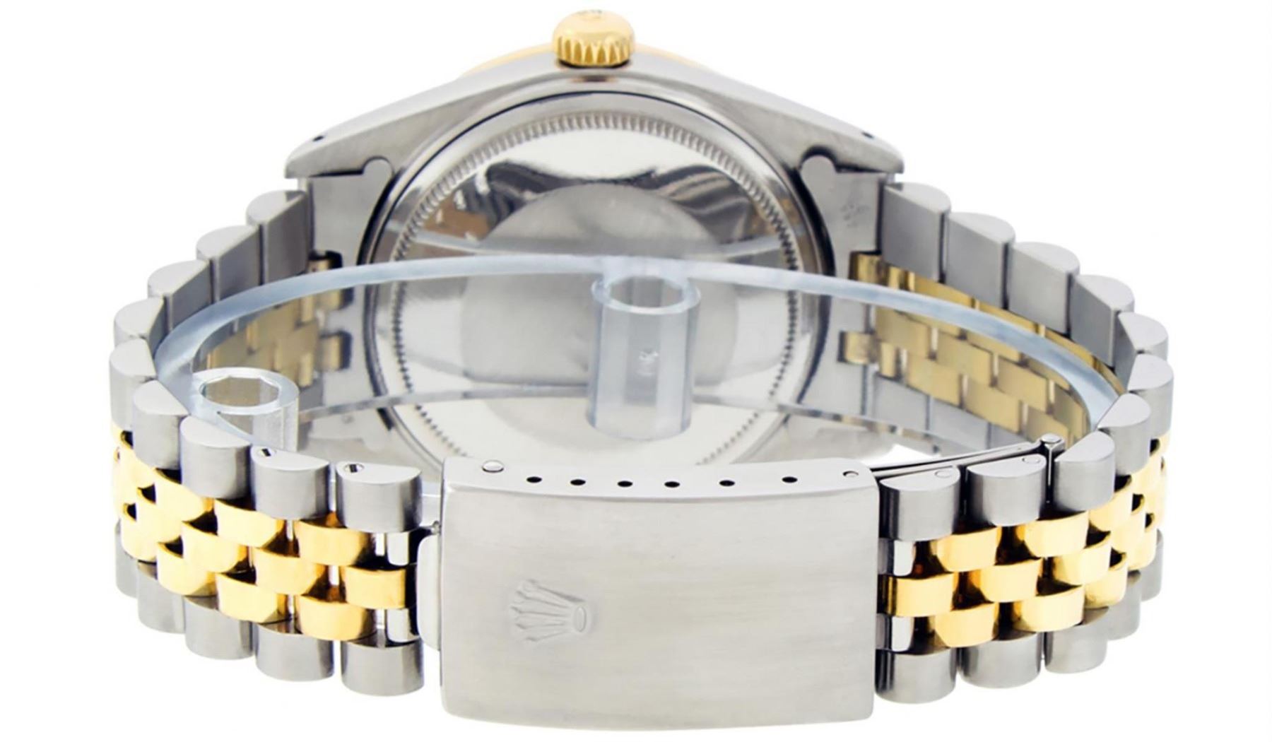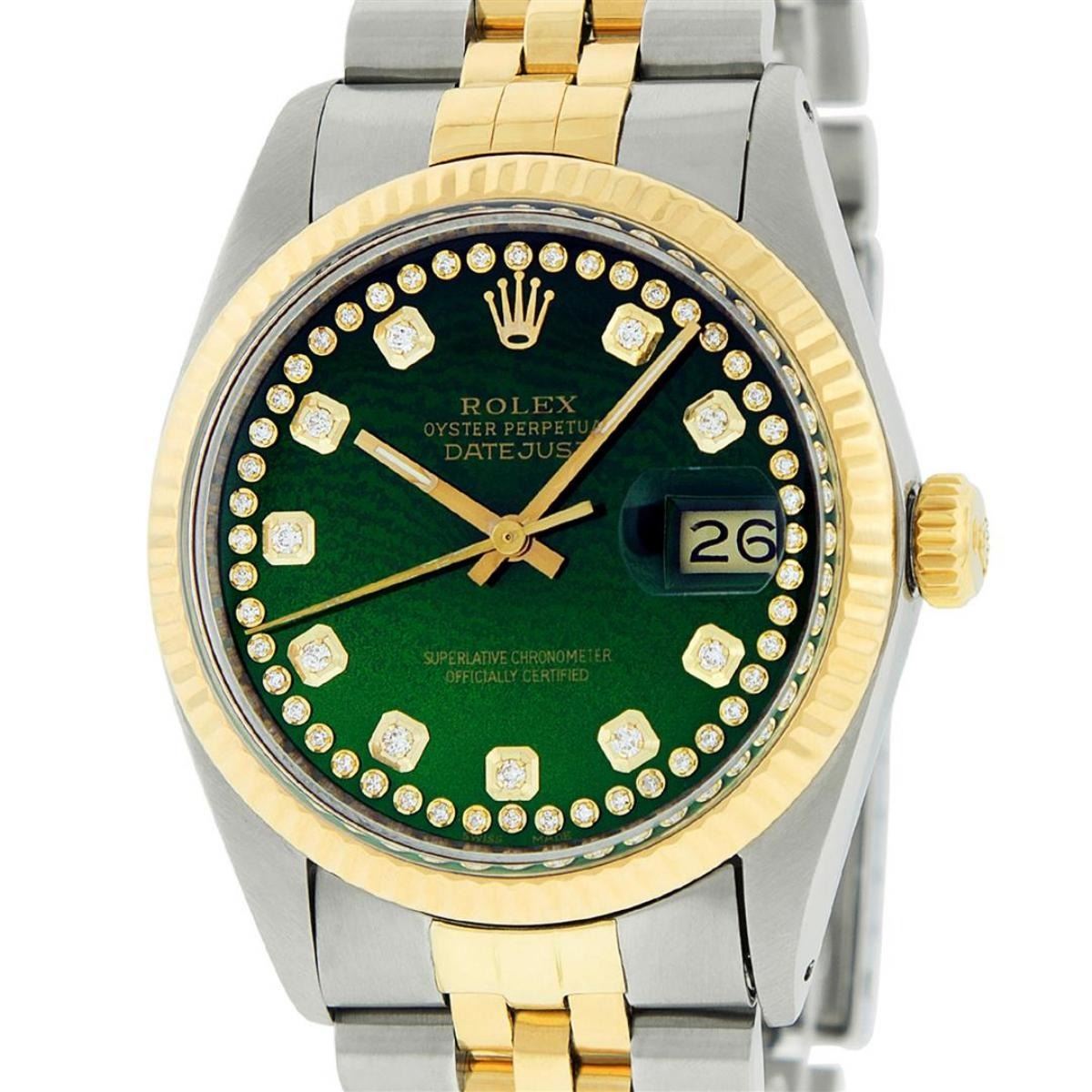 One Mens Pre Owned Yellow Gold Two Tone Rolex Datejust Polished, Serviced & Electronically Tested, Rolex Yellow Gold & Stainless Steel Case: 36mm, Rolex Yellow Gold Crown, Rolex Bezel: Yellow Gold Fluted Bezel. Custom Crystal: New Acrylic Cyclops Lens. Custom Hands: New Luminecent Hands. Rolex Movement: Automatic Winding Movement. Custom Dial: Refinished To Green String With Added Diamond Hour Markers, Diamond Count: 58 Diamonds in Dial, G To H In Color, SI-VS Clarity. Date Window: 3 O'Clock Position Date Display, Quickset, Model: Datejust, Condition: G-6 Extra Fine. Rolex Bracelet: Two Tone Yellow Gold & Stainless Steel Jubilee Band. Bright Polish. 7.0 Inch Length, Adjustable. Standard Clasp, With Rolex Logo. This Watch Has Been Serviced And Polished It Is Free Of All Scratches And Dents.