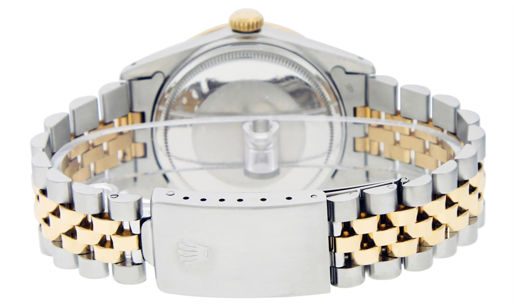 One Mens Pre Owned Yellow Gold Two Tone Rolex Datejust Polished, Serviced & Electronically Tested, Rolex Yellow Gold & Stainless Steel Case: 36mm, Rolex Yellow Gold Crown, Rolex Bezel: Yellow Gold Fluted Bezel. Custom Crystal: New Acrylic Cyclops Lens. Custom Hands: New Luminecent Hands. Rolex Movement: Automatic Winding Movement. Custom Dial: Refinished To Green String With Added Diamond Hour Markers, Diamond Count: 58 Diamonds in Dial, G To H In Color, SI-VS Clarity. Date Window: 3 O'Clock Position Date Display, Quickset, Model: Datejust, Condition: G-6 Extra Fine. Rolex Bracelet: Two Tone Yellow Gold & Stainless Steel Jubilee Band. Bright Polish. 7.0 Inch Length, Adjustable. Standard Clasp, With Rolex Logo. This Watch Has Been Serviced And Polished It Is Free Of All Scratches And Dents.