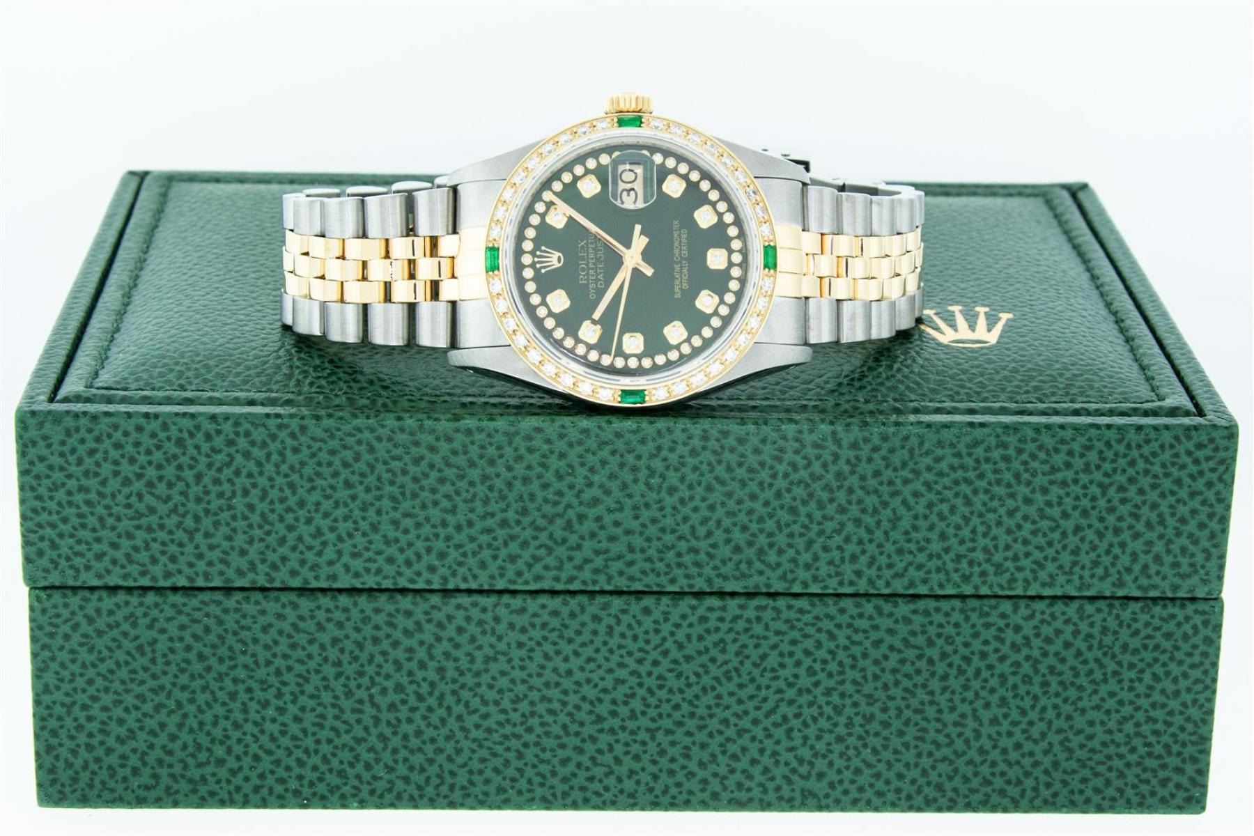 One Mens Yellow Gold Two Tone Rolex Datejust Polished, Serviced & Electronically Tested, Yellow Gold & Stainless Steel Case: 36mm, Yellow Gold Crown, Custom Bezel: New 18K Yellow Gold Emerald Beadset Diamond Bezel, Diamond Count: 36 Diamonds + 4 Emeralds, Total Weight 1.00 Carat, Clarity: SI-VS, Color: G to H. Custom Crystal: New Scratch Resistant Synthetic Sapphire Cyclops Lens. Custom Hands: New Luminecent Hands. Movement: Automatic Winding Movement. Custom Dial: Green String Diamond Dial, Diamond Count: 58 Diamonds in Dial, G To H In Color, SI-VS Clarity. Date Window: 3 O'Clock Position Date Display, Quickset, Model: Datejust. Condition: G-6 Extra Fine. Bracelet: Two Tone Yellow Gold & Stainless Steel Jubilee Band. Bright Polish. 7.0 Inch Length, Adjustable. Standard Clasp, With Rolex Logo. This Watch Has Been Serviced Time Tested And Is In Excellent Condition It Is Free Of All Scratches And Dents.