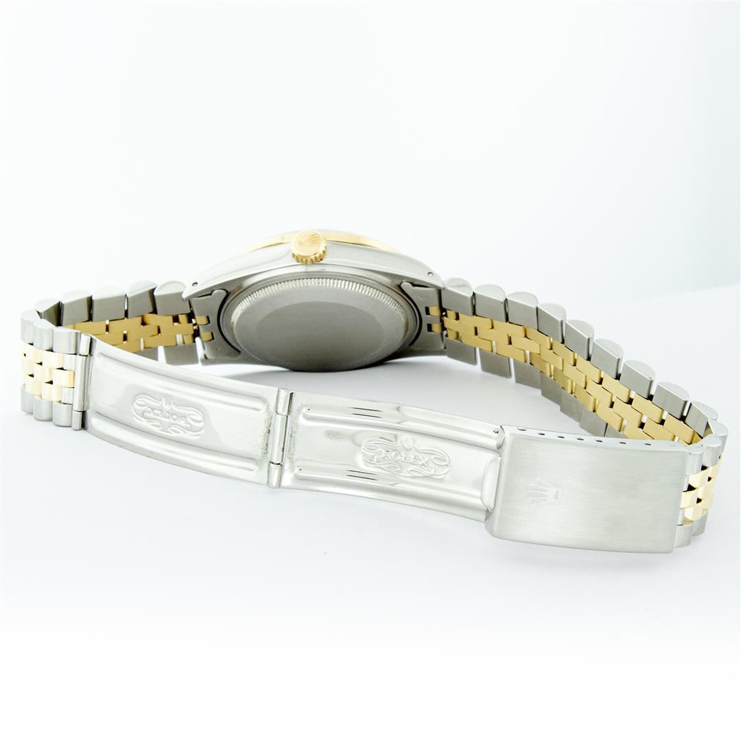 One Mens Yellow Gold Two Tone Rolex Datejust Polished, Serviced & Electronically Tested, Yellow Gold & Stainless Steel Case: 36mm, Yellow Gold Crown, Custom Bezel: New 18K Yellow Gold Emerald Beadset Diamond Bezel, Diamond Count: 36 Diamonds + 4 Emeralds, Total Weight 1.00 Carat, Clarity: SI-VS, Color: G to H. Custom Crystal: New Scratch Resistant Synthetic Sapphire Cyclops Lens. Custom Hands: New Luminecent Hands. Movement: Automatic Winding Movement . Custom Dial: Green String Diamond Dial, Diamond Count: 58 Diamonds in Dial, G To H In Color, SI-VS Clarity. Date Window: 3 O'Clock Position Date Display, Quickset, Model: Datejust. Condition: G-6 Extra Fine. Bracelet: Two Tone Yellow Gold & Stainless Steel Jubilee Band. Bright Polish. 7.0 Inch Length, Adjustable. Standard Clasp, With Rolex Logo. This Watch Has Been Serviced Time Tested And Is In Excellent Condition It Is Free Of All Scratches And Dents.
