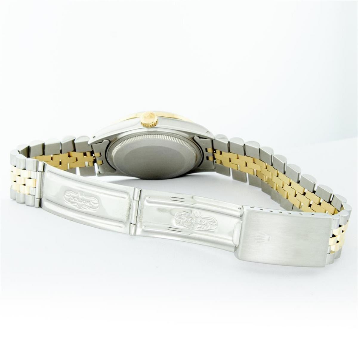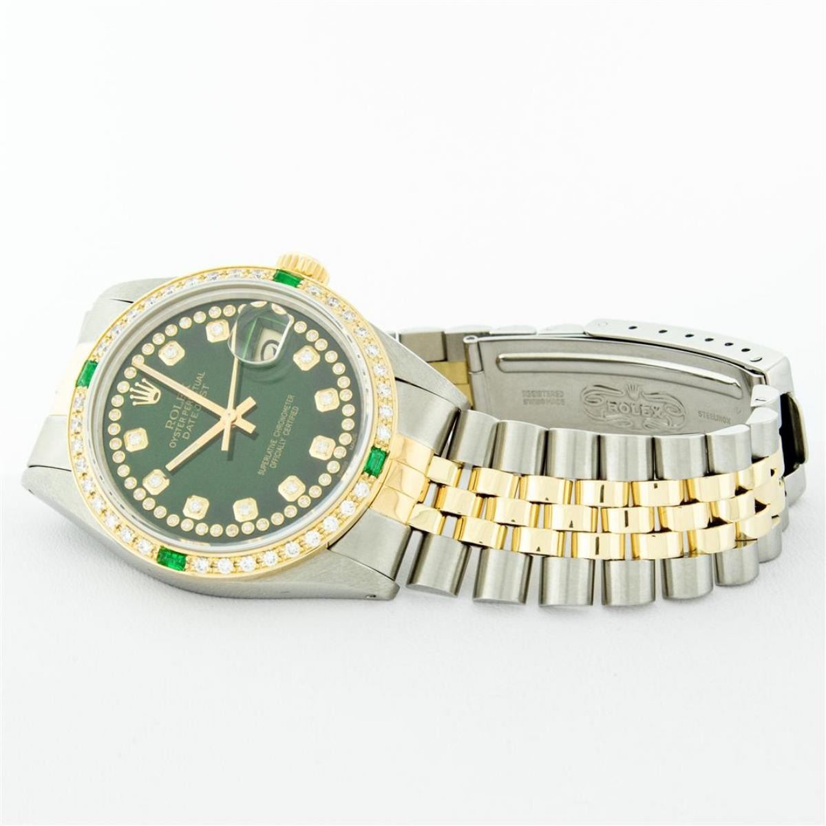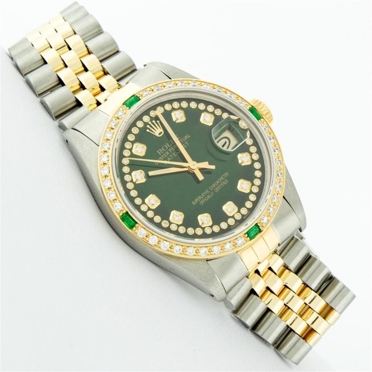 One Mens Yellow Gold Two Tone Rolex Datejust Polished, Serviced & Electronically Tested, Yellow Gold & Stainless Steel Case: 36mm, Yellow Gold Crown, Custom Bezel: New 18K Yellow Gold Emerald Beadset Diamond Bezel, Diamond Count: 36 Diamonds + 4 Emeralds, Total Weight 1.00 Carat, Clarity: SI-VS, Color: G to H. Custom Crystal: New Scratch Resistant Synthetic Sapphire Cyclops Lens. Custom Hands: New Luminecent Hands. Movement: Automatic Winding Movement . Custom Dial: Green String Diamond Dial, Diamond Count: 58 Diamonds in Dial, G To H In Color, SI-VS Clarity. Date Window: 3 O'Clock Position Date Display, Quickset, Model: Datejust. Condition: G-6 Extra Fine. Bracelet: Two Tone Yellow Gold & Stainless Steel Jubilee Band. Bright Polish. 7.0 Inch Length, Adjustable. Standard Clasp, With Rolex Logo. This Watch Has Been Serviced Time Tested And Is In Excellent Condition It Is Free Of All Scratches And Dents.