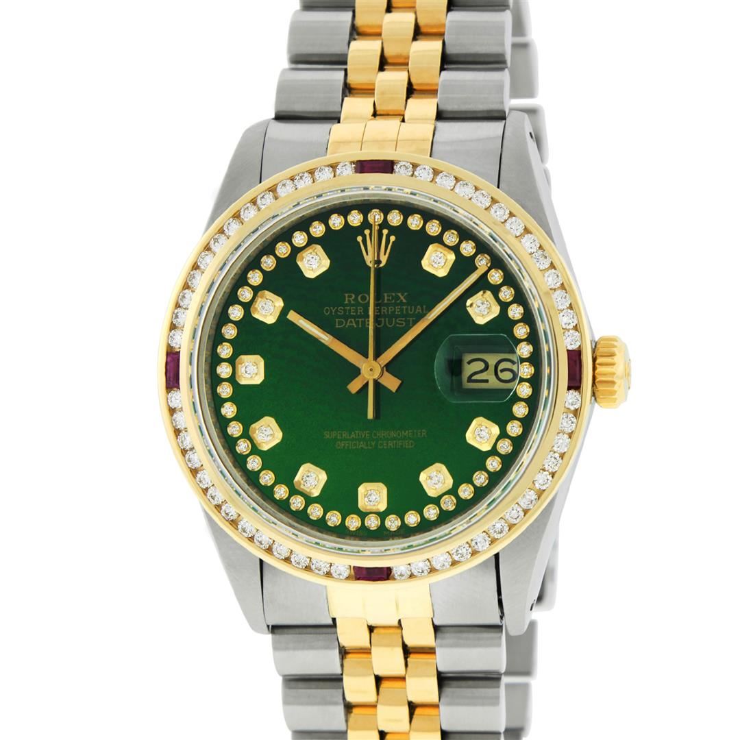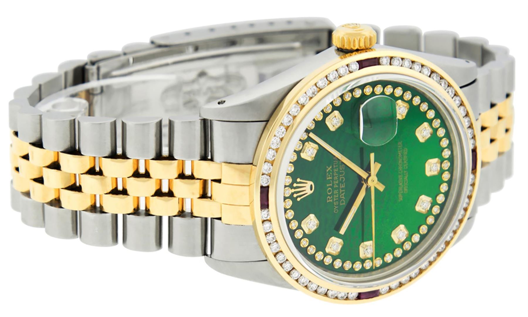 One Mens Yellow Gold Two Tone Rolex Datejust Polished, Serviced & Electronically Tested, Yellow Gold & Stainless Steel Case: 36mm, Yellow Gold Crown, Custom Bezel: 18K Yellow Gold Ruby Channel Set Diamond Bezel, Diamond Count: 52 Diamonds + 4 Rubies, Total Weight 1.30 Carat, Clarity: SI-VS, Color: G to H. Custom Crystal: New Synthetic Sapphire Cyclops Lens. Custom Hands: New Luminecent Hands. Movement: Automatic Winding Movement. Custom Dial: Green String Diamond Dial, Diamond Count: 58 Diamonds in Dial. Date Window: 3 O'Clock Position Date Display, Quickset, Model: Datejust. Condition: G-6 Extra Fine. Bracelet:Two Tone Yellow Gold & Stainless Steel Jubilee. Bright Polish. 7.0 Inch Length, Adjustable. Standard Clasp, With Rolex Logo. This Watch Has Been Serviced Time Tested And Is In Excellent Condition It Is Free Of All Scratches And Dents.
