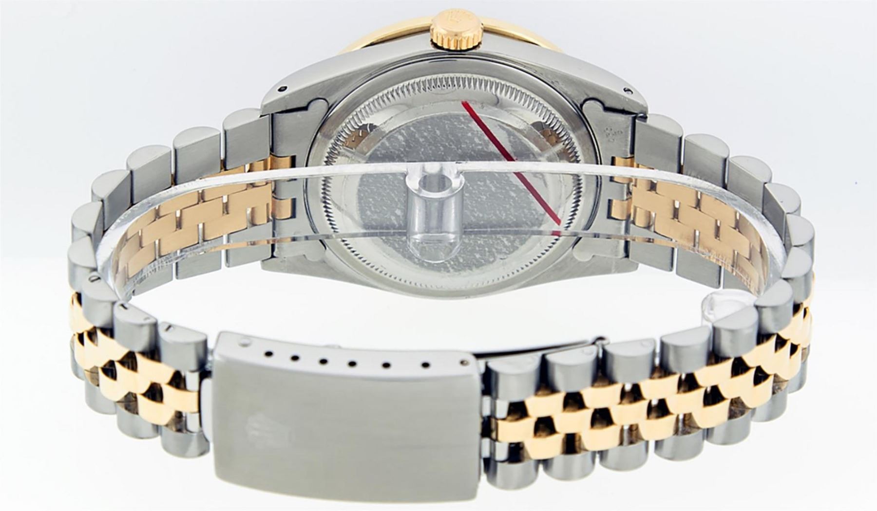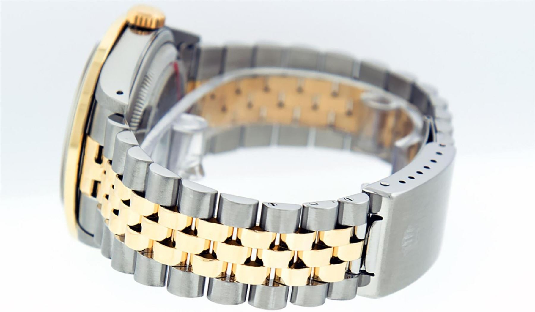 One Mens Yellow Gold Two Tone Rolex Datejust Polished, Serviced & Electronically Tested, Yellow Gold & Stainless Steel Case: 36mm, Yellow Gold Crown, Custom Bezel: 18K Yellow Gold Ruby Channel Set Diamond Bezel, Diamond Count: 52 Diamonds + 4 Rubies, Total Weight 1.30 Carat, Clarity: SI-VS, Color: G to H. Custom Crystal: New Synthetic Sapphire Cyclops Lens. Custom Hands: New Luminecent Hands. Movement: Automatic Winding Movement. Custom Dial: Green String Diamond Dial, Diamond Count: 58 Diamonds in Dial. Date Window: 3 O'Clock Position Date Display, Quickset, Model: Datejust. Condition: G-6 Extra Fine. Bracelet:Two Tone Yellow Gold & Stainless Steel Jubilee. Bright Polish. 7.0 Inch Length, Adjustable. Standard Clasp, With Rolex Logo. This Watch Has Been Serviced Time Tested And Is In Excellent Condition It Is Free Of All Scratches And Dents.