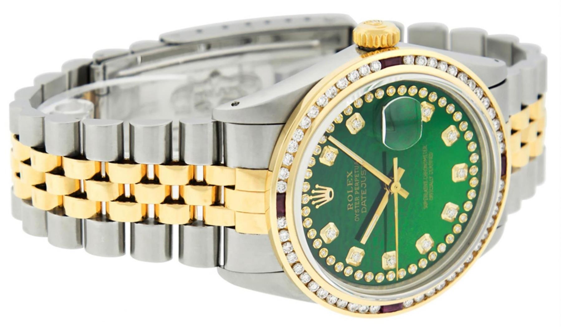 One Mens Yellow Gold Two Tone Rolex Datejust Polished, Serviced & Electronically Tested, Yellow Gold & Stainless Steel Case: 36mm, Yellow Gold Crown, Custom Bezel: 18K Yellow Gold Ruby Channel Set Diamond Bezel, Diamond Count: 52 Diamonds + 4 Rubies, Total Weight 1.30 Carat, Clarity: SI-VS, Color: G to H. Custom Crystal: New Synthetic Sapphire Cyclops Lens. Custom Hands: New Luminecent Hands. Movement: Automatic Winding Movement. Custom Dial: Green String Diamond Dial, Diamond Count: 58 Diamonds in Dial. Date Window: 3 O'Clock Position Date Display, Quickset, Model: Datejust. Condition: G-6 Extra Fine. Bracelet:Two Tone Yellow Gold & Stainless Steel Jubilee. Bright Polish. 7.0 Inch Length, Adjustable. Standard Clasp, With Rolex Logo. This Watch Has Been Serviced Time Tested And Is In Excellent Condition It Is Free Of All Scratches And Dents.