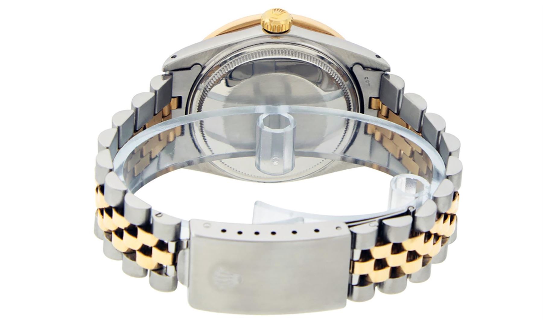 One Mens Pre Owned Yellow Gold Two Tone Rolex Datejust Polished Bright with Satin Finish, Serviced & Electronically Tested, Rolex Yellow Gold And Stainless Steel Case: 36mm, Rolex Yellow Gold Crown, Custom Bezel: New Yellow Gold Princess Cut Diamond Bezel, Diamond Count: 53 Diamonds, Total Weight 2.75 Carat, Clarity: SI-VS, Color: G to H. Custom Crystal: New Sapphire With Date Window. Custom Hands: New Luminescent Hands. Rolex Movement: Automatic Winding Movement. Custom Dial: Refinished To Green With Custom Added Diamonds, Diamond Count: 58 Diamond in Dial, Dial Color: G To H In Color, Clarity: VS2-SI1. Date Window: 3 O'clock Position Date Display, Quickset, Model: Datejust. Condition: G-6 Extra Fine. Rolex Bracelet: Yellow Gold And Stainless Steel Jubilee Band. Bright Polish & Satin Finish. 7.0 Inch Length, Adjustable. Standard Clasp, With Rolex Logo. This Watch Has Been Serviced and Polished And It Is Free Of All Dents And Scratches And Has Been Time Tested.