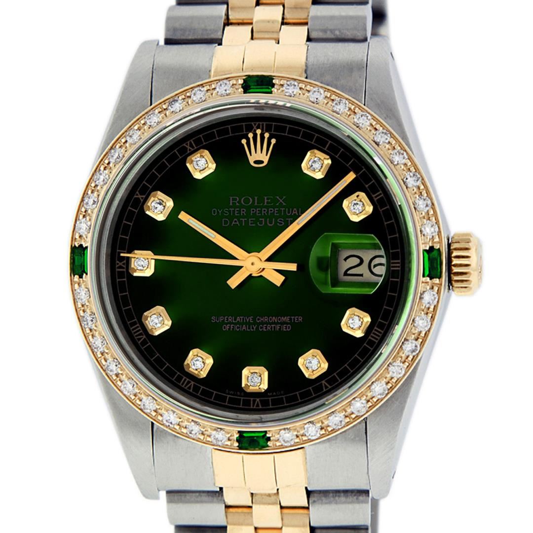 One Mens Pre Owned Yellow Gold Two Tone Rolex Datejust Polished, Serviced And Electronically Tested, Rolex Case: Yellow Gold And Stainless Steel Case: 36mm, Rolex Yellow Gold Crown, Custom Bezel: New 18K Yellow Gold Beadset Bezel + Emerald Baguettes, Diamond Count: 36 Diamonds + 4 Emeralds. Custom Crystal: New Sapphire With Magnified Date Window, Custom Hands: New Luminescent Hands. Rolex Movement: Automatic Winding Movement 3035. Custom Dial: Custom Green Vignette With Added Diamonds, Diamond Count: 58 Diamonds in Dial. Date Window: 3 O'Clock Position Date Display, Quickset, Model: Quickset Datejust, Condition: G-6 Extra Fine. Rolex Bracelet: Two Tone Yellow Gold And Stainless Steel Jubilee Band. Bright Polish. 7.0 Inch Length, Adjustable. Standard Clasp, With Rolex Logo. This Watch Has Been Serviced And Polished It Is Free Of All Scratches And Dents.