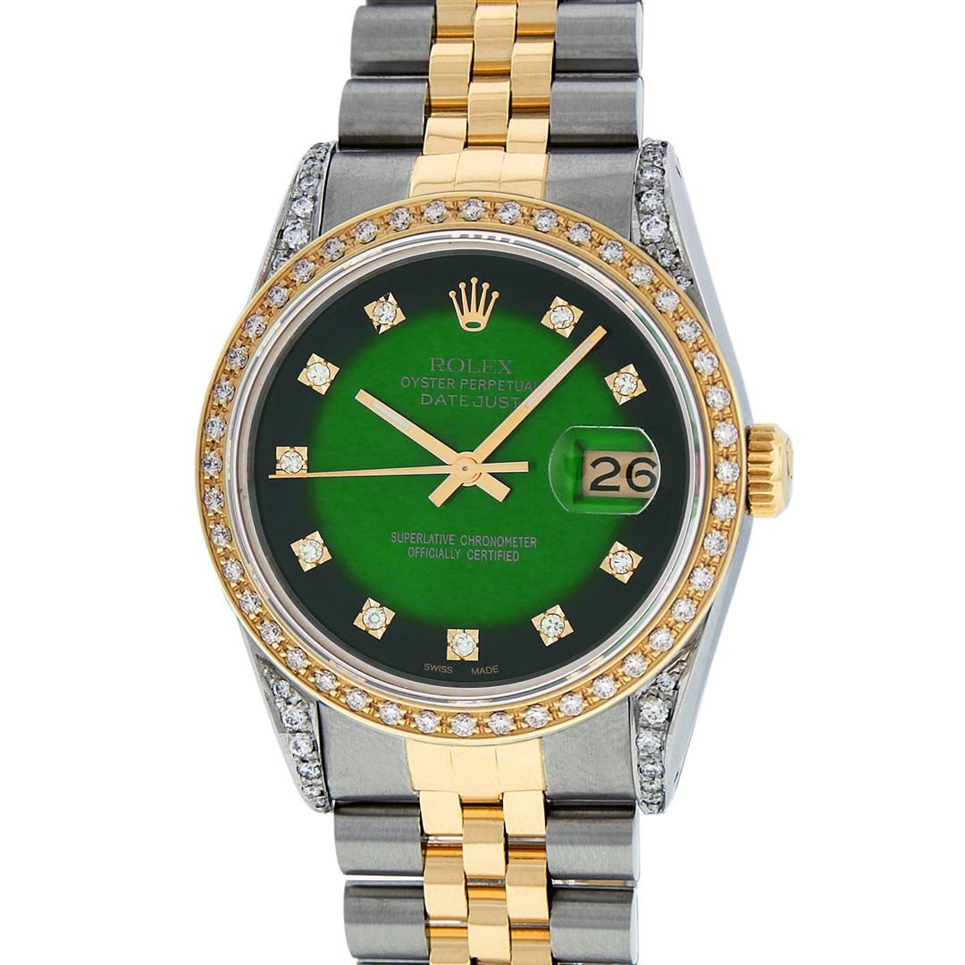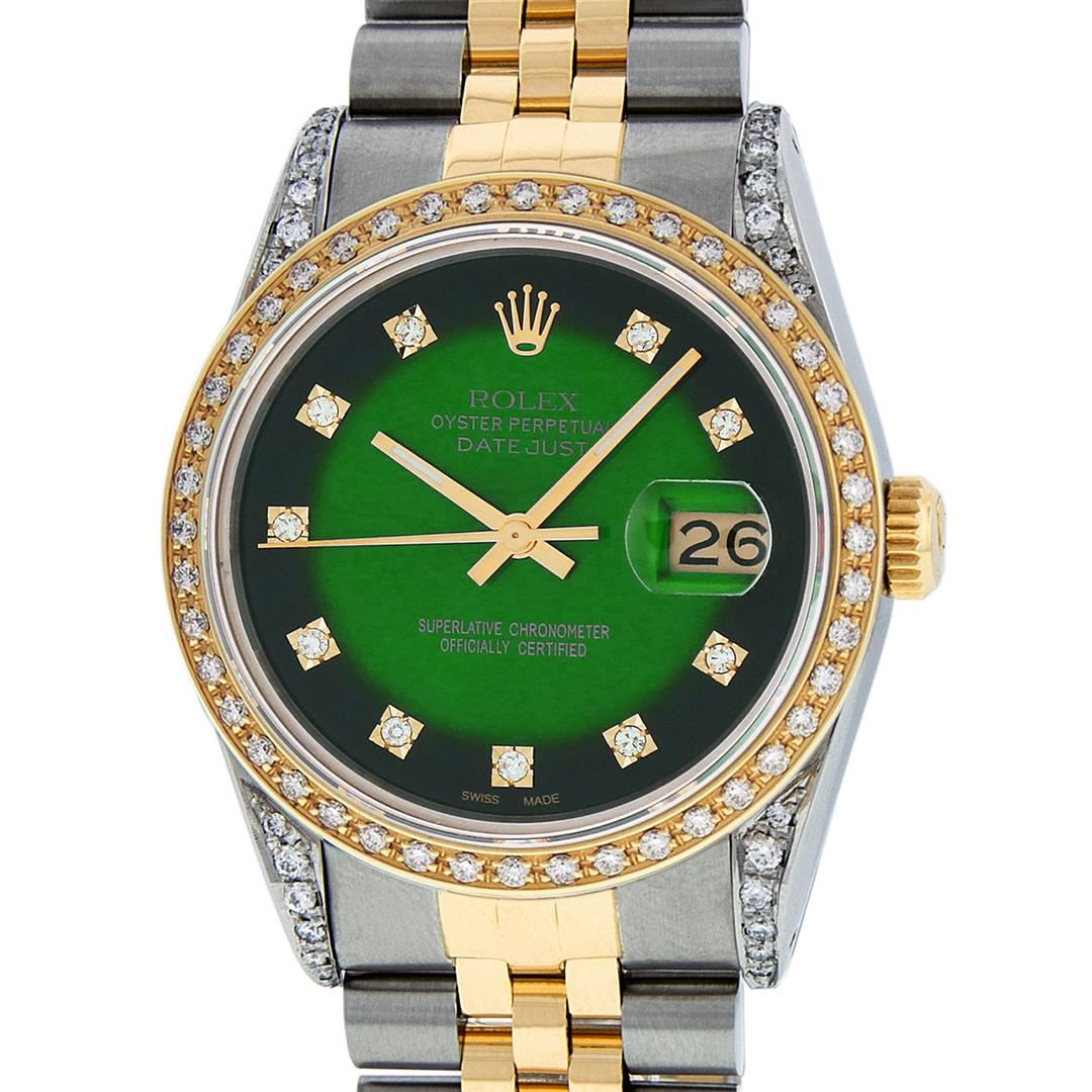 One Mens Yellow Gold Rolex Datejust Polished Bright with Satin Finish, Serviced & Electronically Tested, Stainless Steel Case: 36mm, Custom Diamond Lugs: 28 Diamonds On Lugs, Color: G to H, Clarity: SI-VS. Yellow Gold Crown, Custom Bezel: New 18K Yellow Gold Beadset Diamond Bezel, Diamond Count: 44 Diamonds, Total Weight 1.00 Carat, Clarity: SI-VS, Color: G to H. Custom Crystal: New Scratch Resistant Synthetic Sapphire Cyclops Lens. Custom Hands: New Luminecent Hands. Movement: Automatic Winding Movement . Custom Dial: Green Vignette Diamond Dial, Stone Count: 10 Diamonds On Dial, Color: G to H, Clarity: VS2. Date Window: 3 O'Clock Position Date Display, Quickset, Model: Datejust. Condition: G-6 Extra Fine. Bracelet: Yellow Gold And Stainless Steel Jubilee Band. Bright Polish & Satin Finish. 7.0 Inch Length, Adjustable. Standard Clasp, With Rolex Logo. This Watch Has Been Serviced And Polished It Is Free Of All Scratches And Dents.