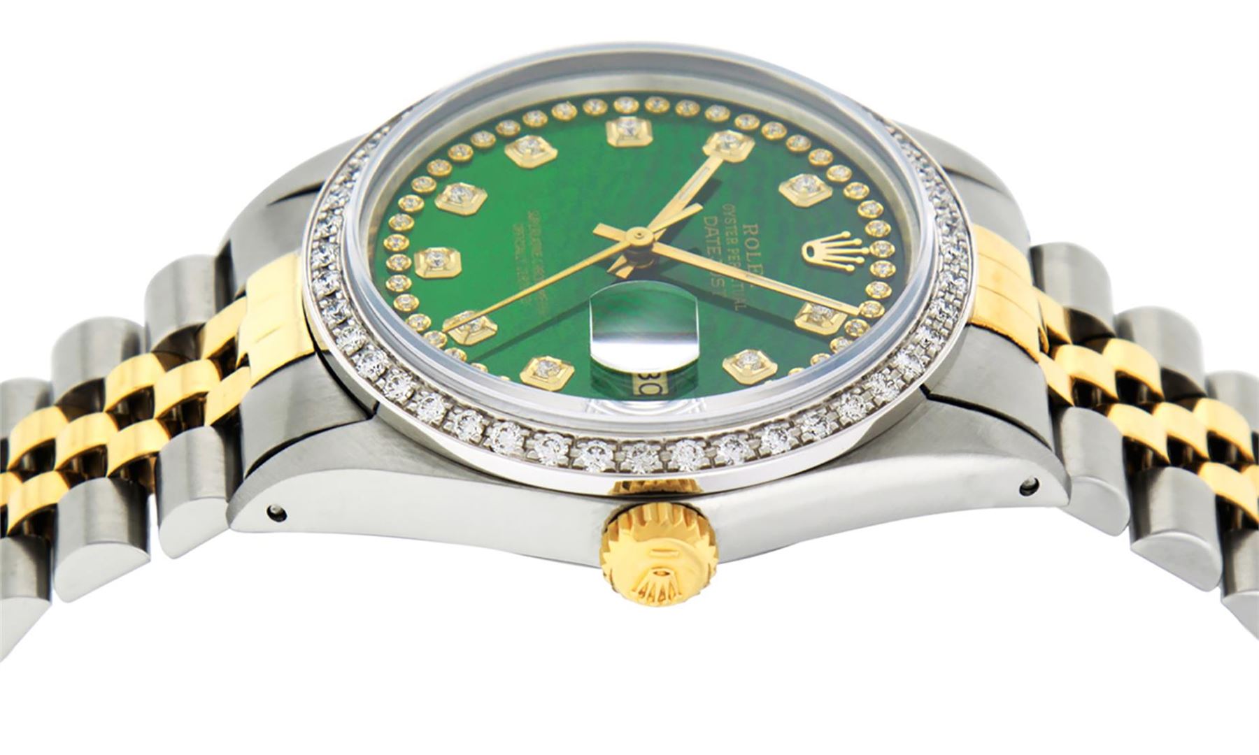 One Mens Yellow Gold Two Tone Rolex Datejust Polished, Serviced & Electronically Tested, Yellow Gold & Stainless Steel Case: 36mm, Yellow Gold Crown, Custom Bezel: New 18K White Gold Beadset Diamond Bezel, Diamond Count: 44 Diamonds, Total Weight 1.00 Carat, Clarity: SI-VS, Color: G to H. Custom Crystal: New Synthetic Sapphire Cyclops Lens. Movement: Automatic Winding Movement . Custom Dial: Green String Diamond Dial, Diamond Count: 58 Diamonds, Color: G To H In Color, Clarity: SI-VS, Date Window: 3 O'Clock Position Date Display, Quickset, Model: Datejust, Condition: G-6 Extra Fine. Bracelet: Two Tone Yellow Gold & Stainless Steel Jubilee. Bright Polish. 7.0 Inch Length, Adjustable. Standard Clasp, With Rolex Logo. This Watch Has Been Serviced Time Tested And Is In Excellent Condition It Is Free Of All Scratches And Dents.