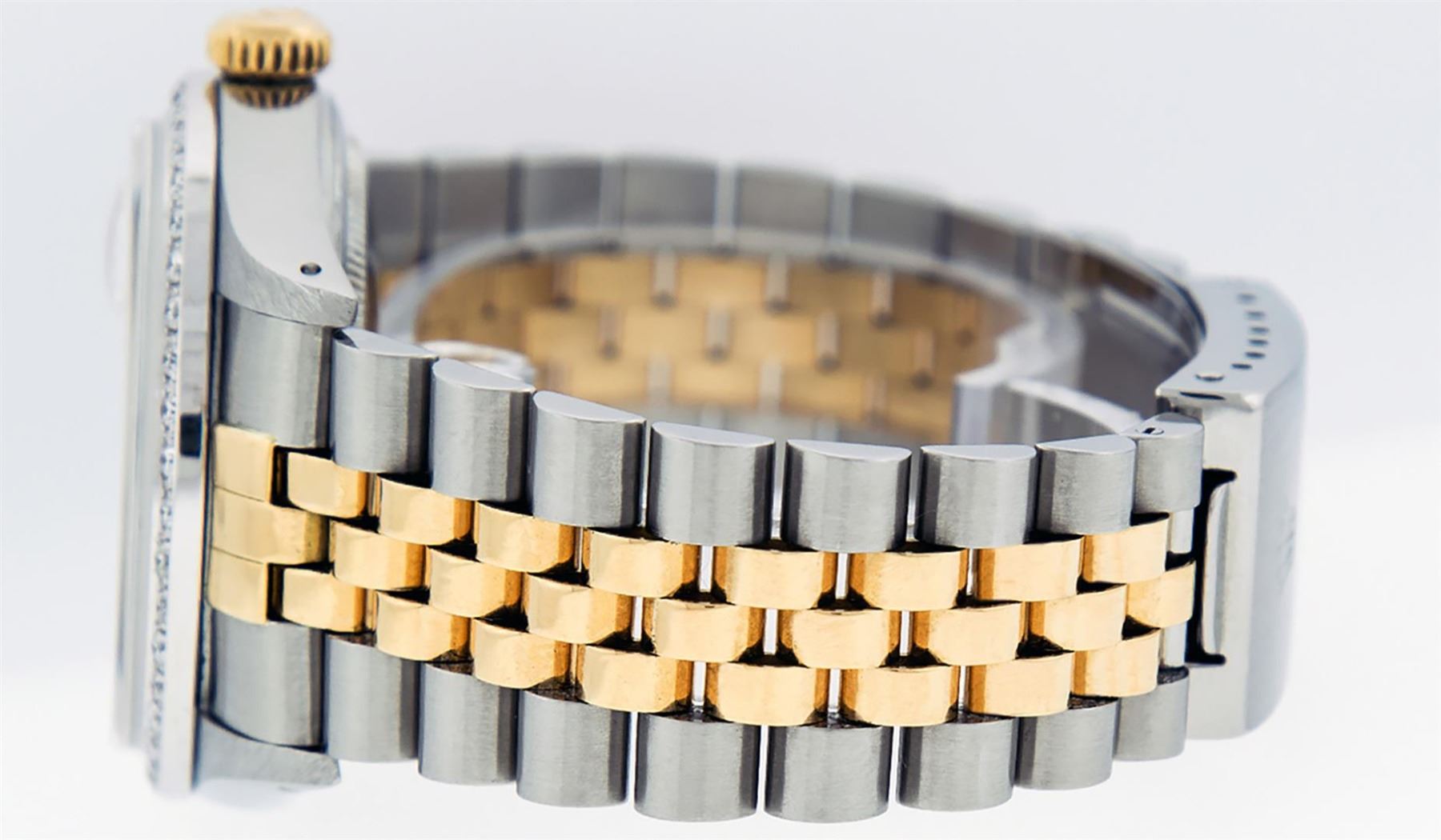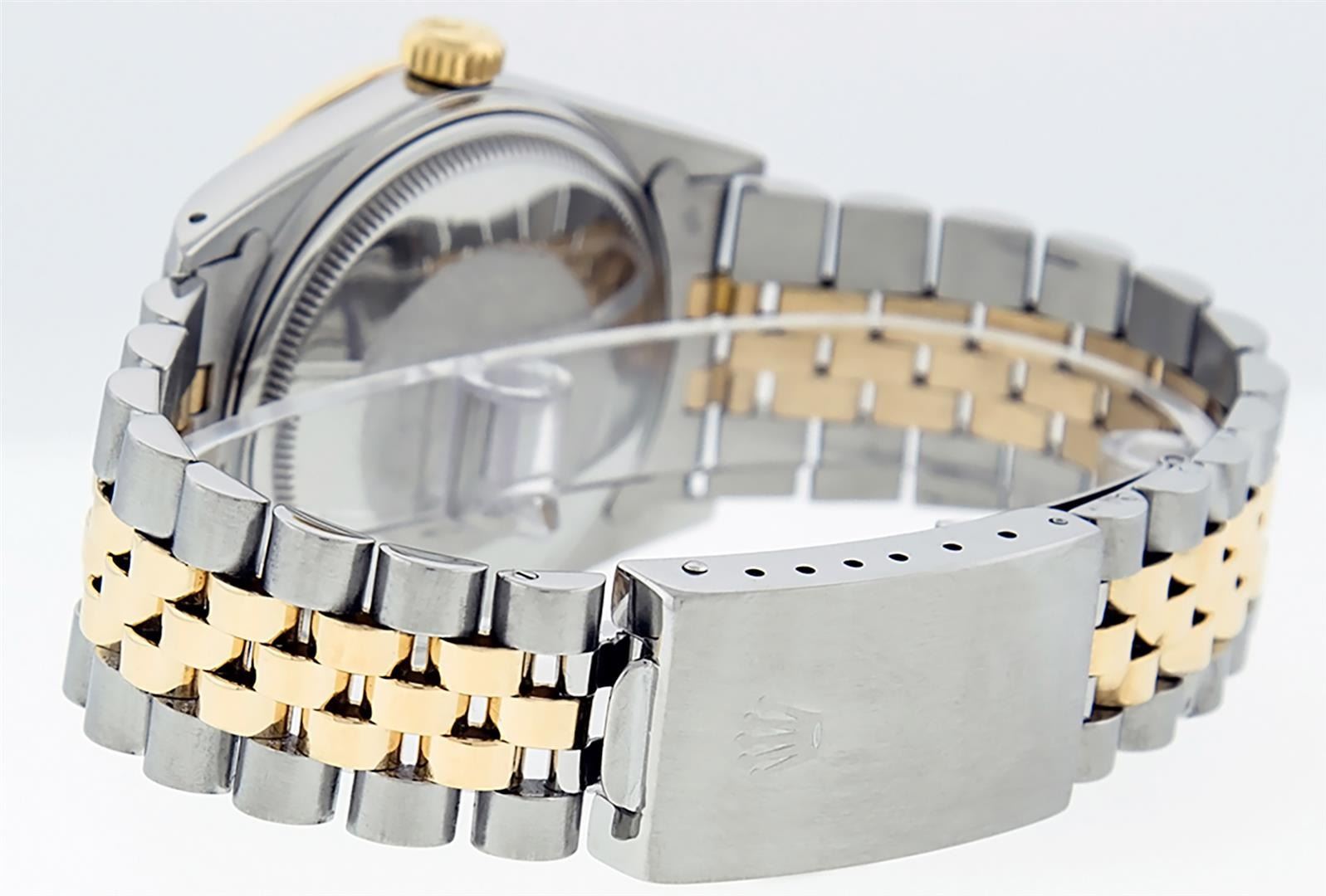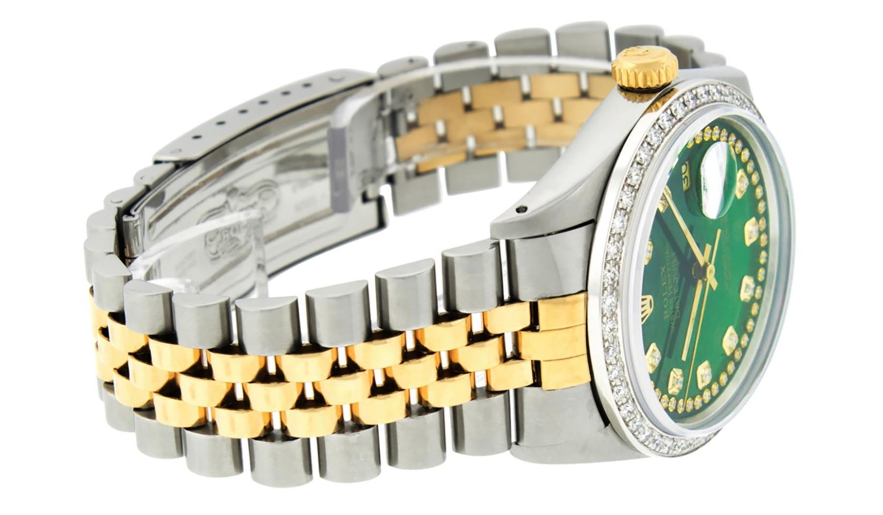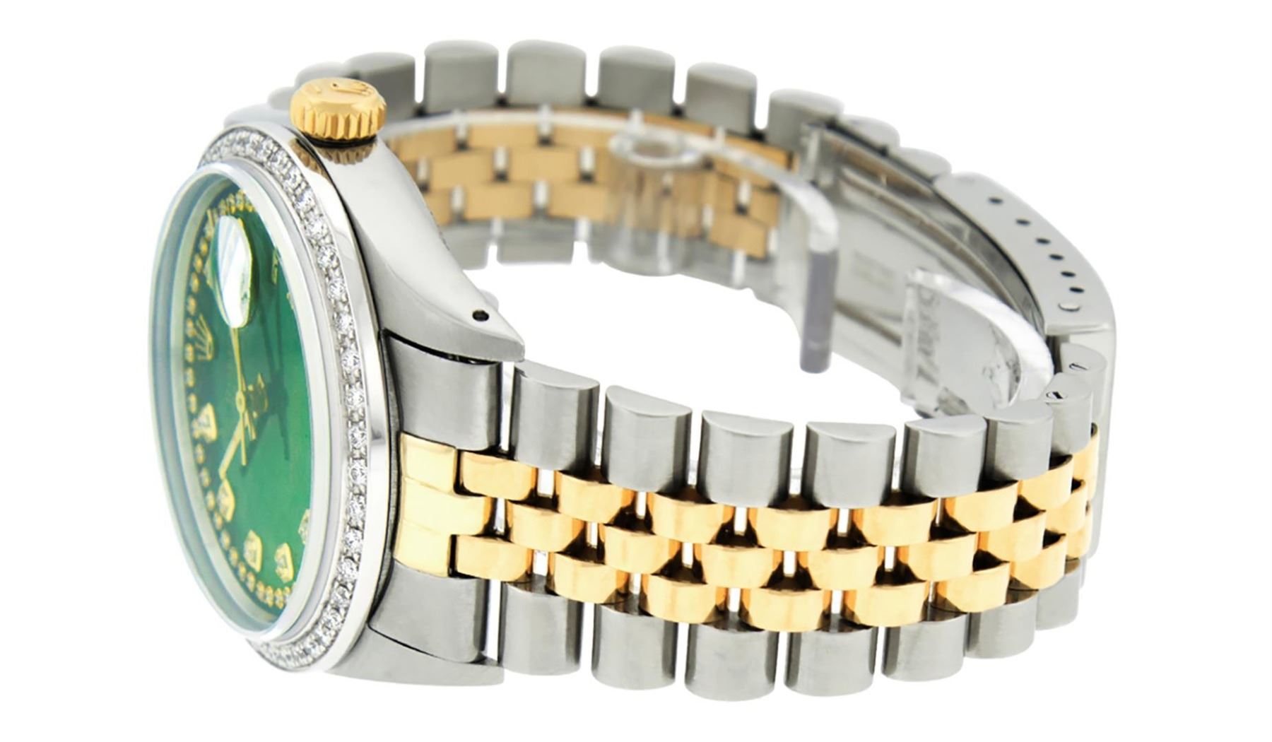 One Mens Pre Owned Yellow Gold Two Tone Rolex Datejust Polished, Serviced & Electronically Tested, Rolex Yellow Gold & Stainless Steel Case: 36mm, Rolex Yellow Gold Crown, Custom Bezel: New 18K White Gold Beadset Diamond Bezel, Diamond Count: 44 Diamonds, Clarity: SI-VS, Color: G to H. Custom Crystal: New Sapphire With Magnified Date Window. Rolex Movement: Automatic Winding Movement. Custom Dial: Refinished Green Custom Added String Diamonds, Diamond Count: 58 Diamonds, Color: G To H In Color, Clarity: SI-VS, Date Window: 3 O'Clock Position Date Display, Quickset, Model: Datejust, Condition: G-6 Extra Fine. Rolex Bracelet: Two Tone Yellow Gold & Stainless Steel Jubilee. Bright Polish. 7.0 Inch Length, Adjustable. Standard Clasp, With Rolex Logo. This Watch Has Been Serviced Time Tested And Is In Excellent Condition It Is Free Of All Scratches And Dents.