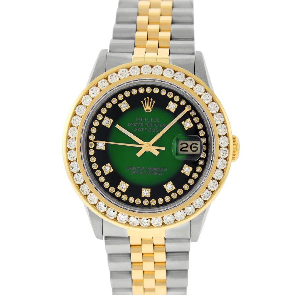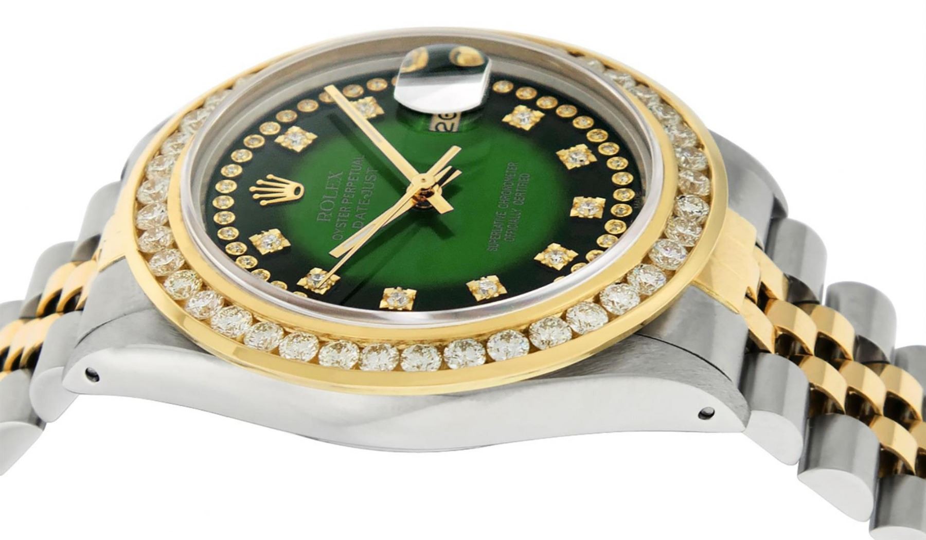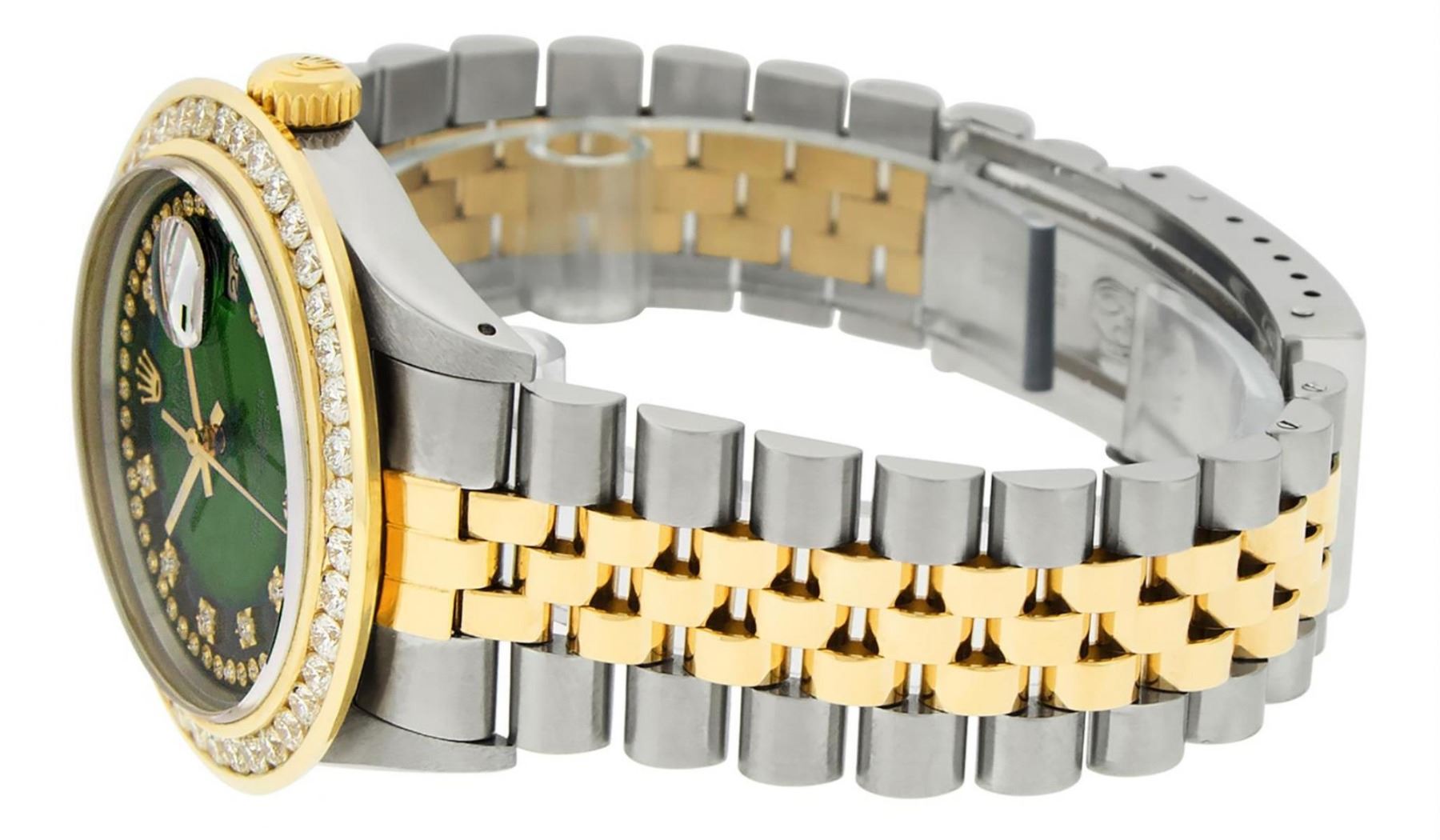 One Mens 14K Yellow Gold Rolex Datejust Polished Bright with Satin Finish, Serviced & Electronically Tested, Stainless Steel Case: 36mm, Yellow Gold Crown, Custom Bezel: New 18K Yellow Gold 3ct Channel Set Diamond Bezel, Diamond Count: 40 Diamonds, Total Weight 3.00 Carat, Clarity: SI-VS, Color: G to H. Custom Crystal: New Scratch Resistent Synthetic Sapphire Cyclops Lens. Custom Hands: New Luminecent Hands. Movement: Automatic Winding Movement Caliber 3035. Custom Dial: Green Vignette String Diamond Dial With Single Cut Diamonds, Diamond Count: 58 Diamonds On Dial, Color: G to H, Clarity: VS. Date Window: 3 O'Clock Position Date Display, Quickset, Model: Datejust. Condition: G-6 Extra Fine. Bracelet: 14K Yellow Gold And Stainless Steel Jubilee Band. Bright Polish & Satin Finish. 7.0 Inch Length, Adjustable. Standard Clasp, With Rolex Logo. This Watch Has Been Serviced And Polished It Is Free Of All Scratches And Dents. This Watch Comes With A Rolex Box.