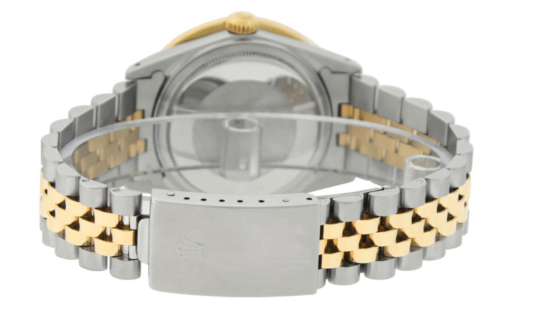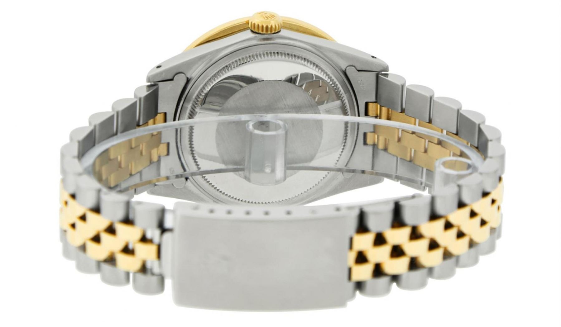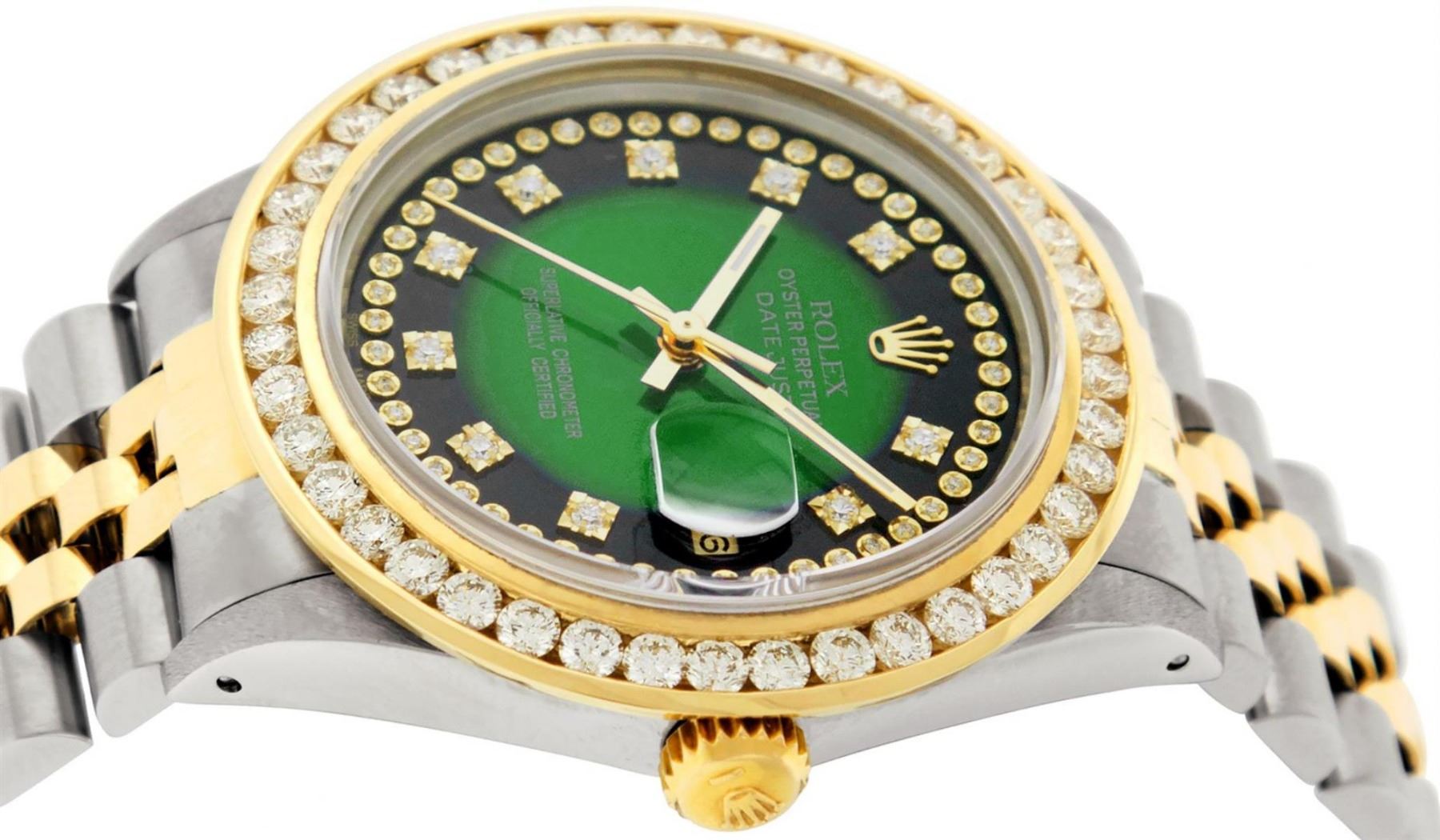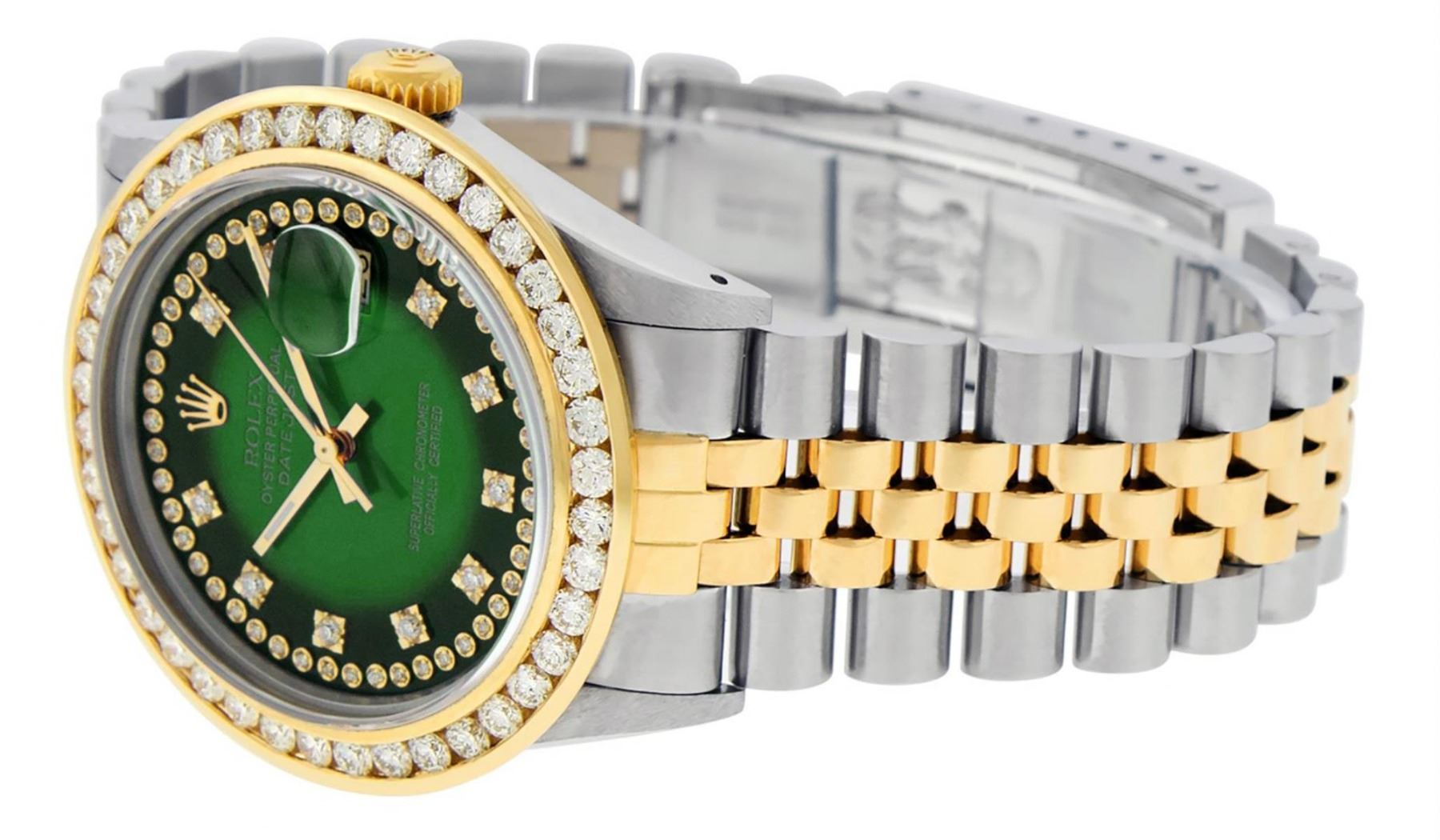 One Mens 14K Yellow Gold Rolex Datejust Polished Bright with Satin Finish, Serviced & Electronically Tested, Stainless Steel Case: 36mm, Yellow Gold Crown, Custom Bezel: New 18K Yellow Gold 3ct Channel Set Diamond Bezel, Diamond Count: 40 Diamonds, Total Weight 3.00 Carat, Clarity: SI-VS, Color: G to H. Custom Crystal: New Scratch Resistent Synthetic Sapphire Cyclops Lens. Custom Hands: New Luminecent Hands. Movement: Automatic Winding Movement Caliber 3035. Custom Dial: Green Vignette String Diamond Dial With Single Cut Diamonds, Diamond Count: 58 Diamonds On Dial, Color: G to H, Clarity: VS. Date Window: 3 O'Clock Position Date Display, Quickset, Model: Datejust. Condition: G-6 Extra Fine. Bracelet: 14K Yellow Gold And Stainless Steel Jubilee Band. Bright Polish & Satin Finish. 7.0 Inch Length, Adjustable. Standard Clasp, With Rolex Logo. This Watch Has Been Serviced And Polished It Is Free Of All Scratches And Dents. This Watch Comes With A Rolex Box.