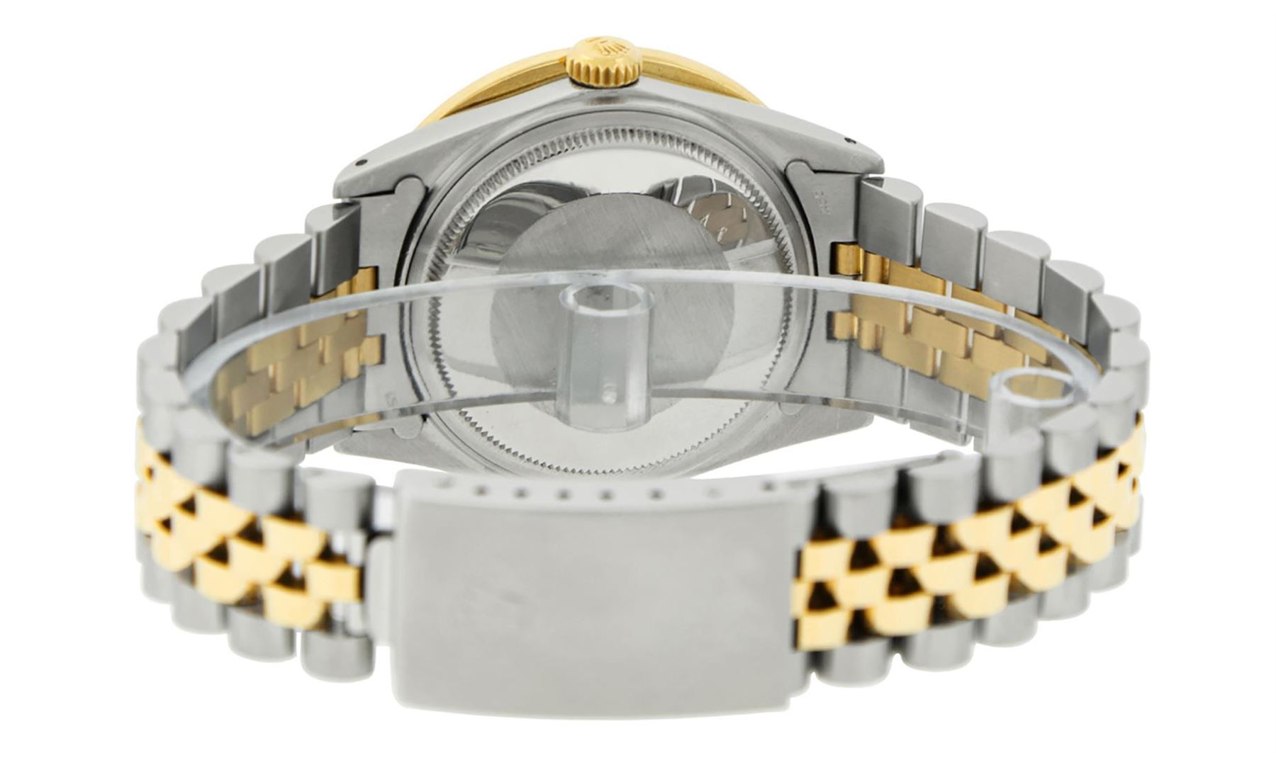 One Mens Pre Owned Yellow Gold Rolex Datejust Polished Bright with Satin Finish, Serviced & Electronically Tested, Stainless Steel Case: 36mm, Yellow Gold Crown, Custom Bezel: New 18K Yellow Gold 3ct Channel Set Diamond Bezel, Diamond Count: 40 Diamonds,