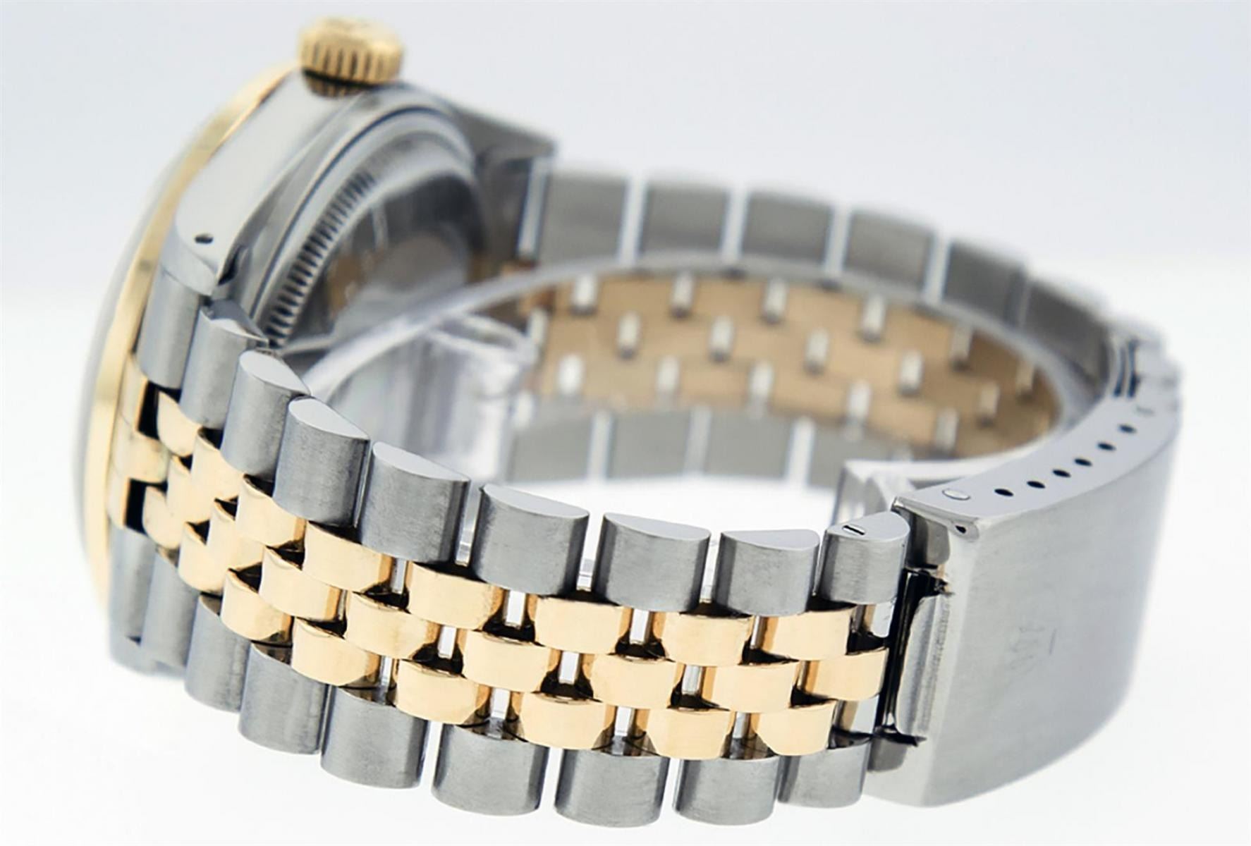 One Mens Yellow Gold Two Tone Rolex Datejust Polished, Serviced & Electronically Tested, Yellow Gold & Stainless Steel Case: 36mm, Yellow Gold Crown, Bezel: Yellow Gold Fluted Bezel. Custom Crystal: New Acrylic Cyclops Lens. Custom Hands: New Luminecent Hands. Movement: Automatic Winding Movement . Custom Dial: Green Vignette String Dial Set With VS Diamond Hour Markers, Diamond Count: 58 Diamonds in Dial, G To H In Color, SI-VS Clarity. Date Window: 3 O'Clock Position Date Display, Quickset, Model: Datejust, Condition: G-6 Extra Fine. Bracelet: Two Tone Yellow Gold & Stainless Steel Jubilee Band. Bright Polish. 7.0 Inch Length, Adjustable. Standard Clasp, With Rolex Logo. This Watch Has Been Serviced And Polished It Is Free Of All Scratches And Dents.
