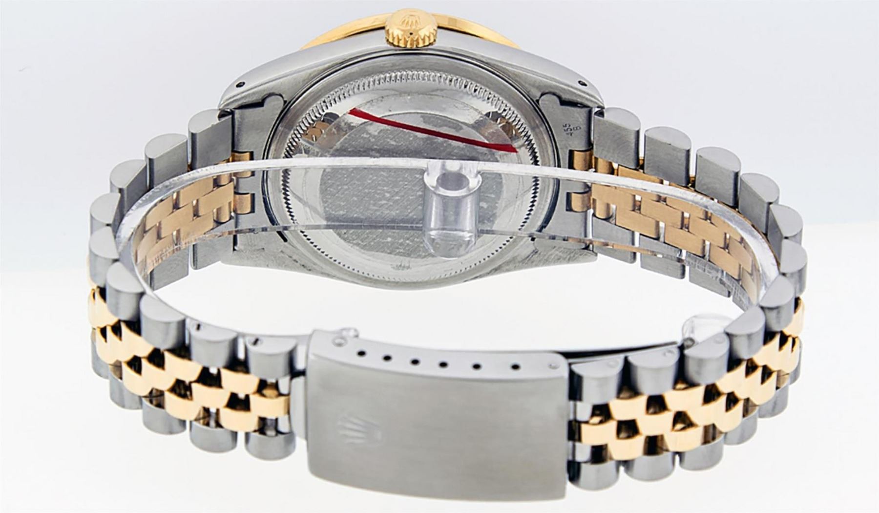 One Mens Yellow Gold Rolex Datejust Polished Bright with Satin Finish, Serviced & Electronically Tested, Stainless Steel Case: 36mm, Custom Diamond Lugs: 28 Diamonds On Lugs, Color: G to H, Clarity: SI-VS. Yellow Gold Crown, Custom Bezel: New 18K Yellow Gold Beadset Diamond + Sapphire Bezel, Diamond + Stone Count: 36Diamonds + 4 Sapphires, Total Weight 1.00 Carat, Clarity: SI-VS, Color: G to H. Custom Crystal: New Scratch Resistant Synthetic Sapphire Cyclops Lens. Custom Hands: New Luminecent Hands. Movement: Automatic Winding Movement . Custom Dial: Blue Vignette Single Cut String Diamond Dial, Stone Count: 58 Diamonds In Dial, Color: G to H, Clarity: VS2. Date Window: 3 O'Clock Position Date Display, Quickset, Model: Datejust. Condition: G-6 Extra Fine. Bracelet: Yellow Gold And Stainless Steel Jubilee Band. Bright Polish & Satin Finish. 7.0 Inch Length, Adjustable. Standard Clasp, With Rolex Logo. This Watch Has Been Serviced And Polished It Is Free Of All Scratches And Dents.