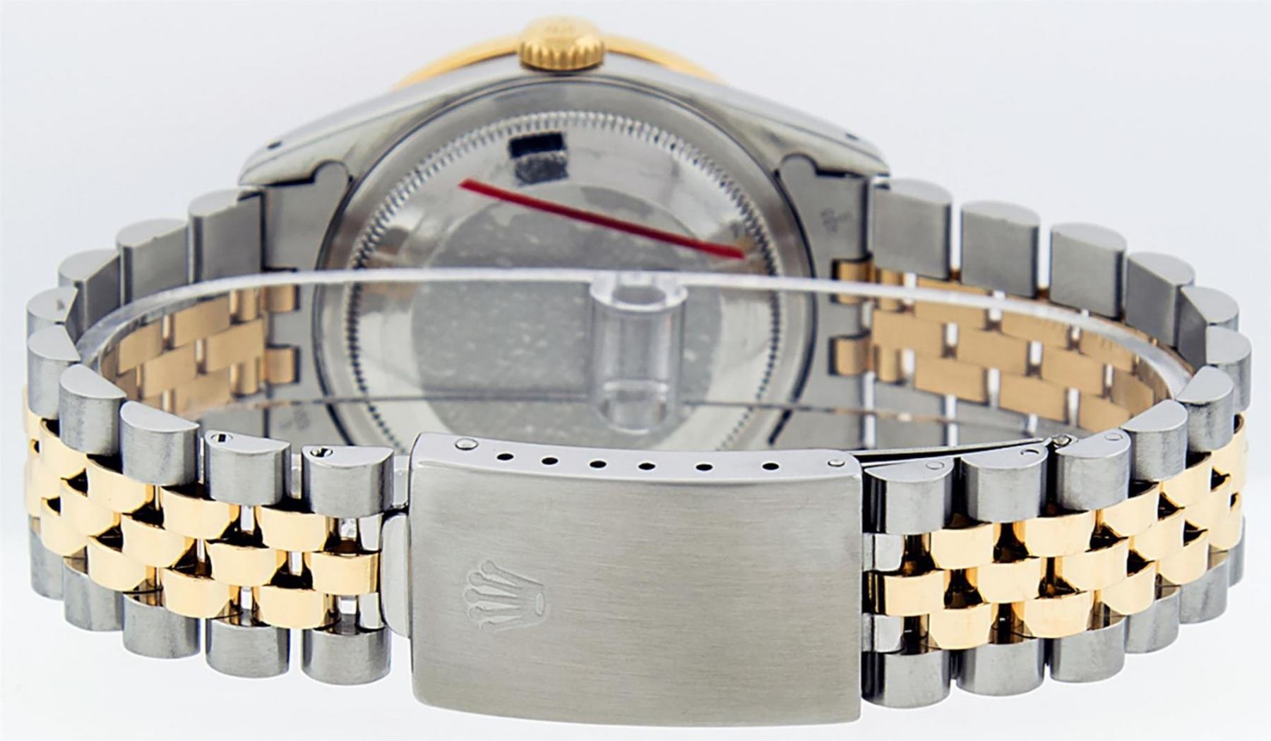 One Mens Yellow Gold Rolex Datejust Polished Bright with Satin Finish, Serviced & Electronically Tested, Stainless Steel Case: 36mm, Custom Diamond Lugs: 28 Diamonds On Lugs, Color: G to H, Clarity: SI-VS. Yellow Gold Crown, Custom Bezel: New 18K Yellow Gold Beadset Diamond + Sapphire Bezel, Diamond + Stone Count: 36Diamonds + 4 Sapphires, Total Weight 1.00 Carat, Clarity: SI-VS, Color: G to H. Custom Crystal: New Scratch Resistant Synthetic Sapphire Cyclops Lens. Custom Hands: New Luminecent Hands. Movement: Automatic Winding Movement . Custom Dial: Blue Vignette Single Cut String Diamond Dial, Stone Count: 58 Diamonds In Dial, Color: G to H, Clarity: VS2. Date Window: 3 O'Clock Position Date Display, Quickset, Model: Datejust. Condition: G-6 Extra Fine. Bracelet: Yellow Gold And Stainless Steel Jubilee Band. Bright Polish & Satin Finish. 7.0 Inch Length, Adjustable. Standard Clasp, With Rolex Logo. This Watch Has Been Serviced And Polished It Is Free Of All Scratches And Dents.