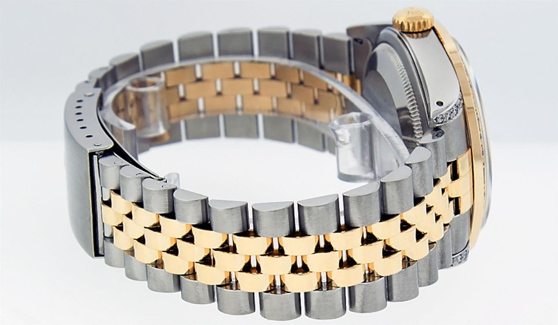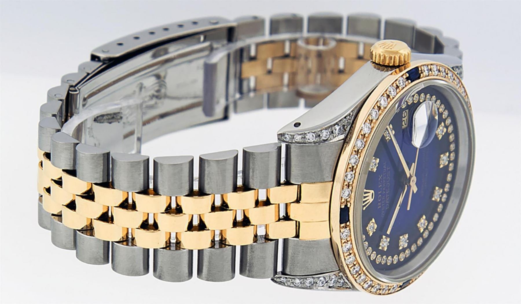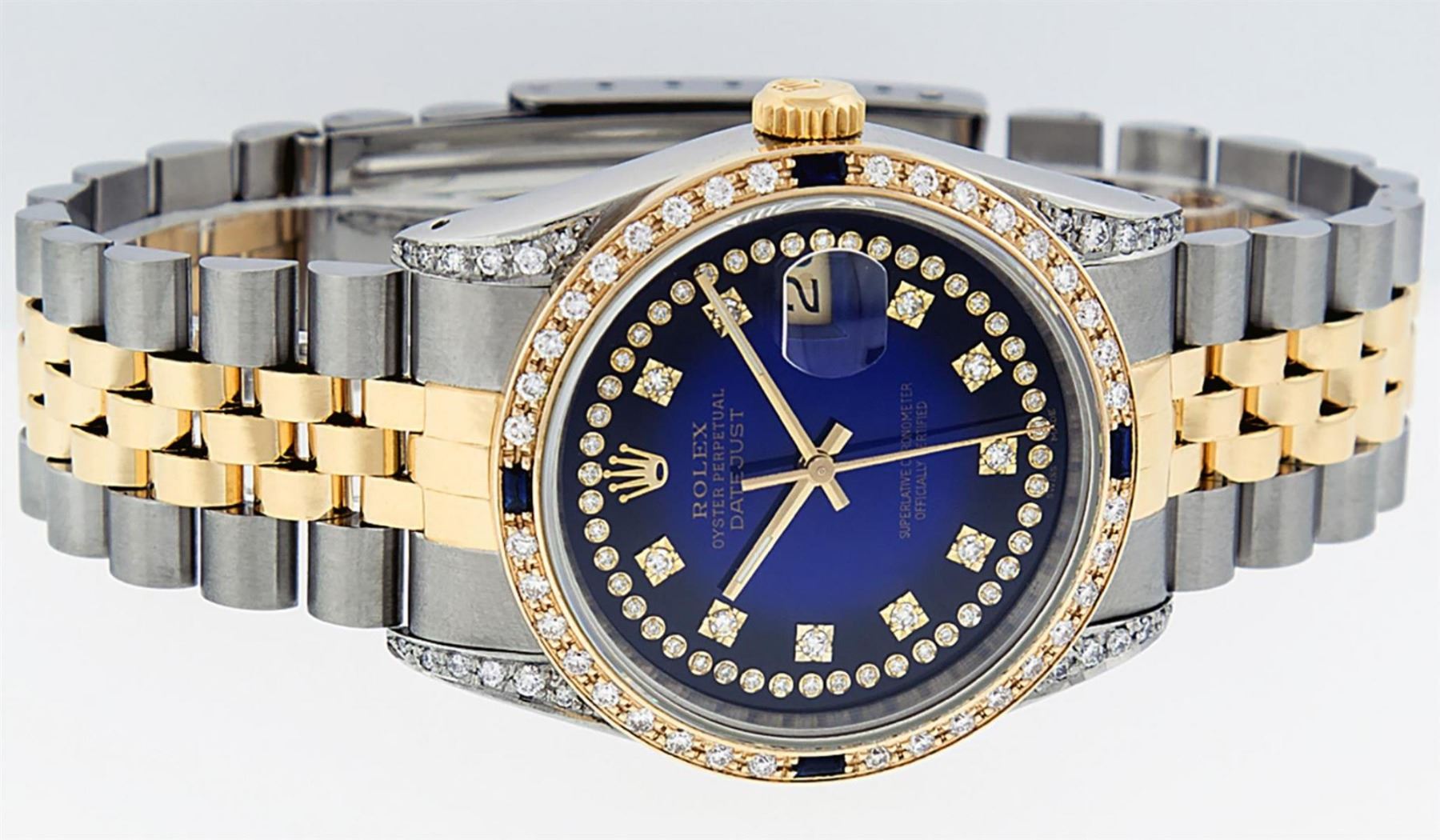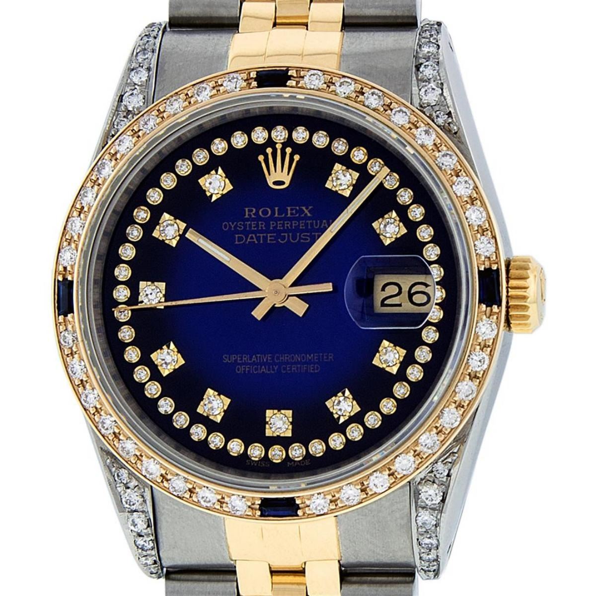One Mens Yellow Gold Rolex Datejust Polished Bright with Satin Finish, Serviced & Electronically Tested, Stainless Steel Case: 36mm, Custom Diamond Lugs: 28 Diamonds On Lugs, Color: G to H, Clarity: SI-VS. Yellow Gold Crown, Custom Bezel: New 18K Yellow Gold Beadset Diamond + Sapphire Bezel, Diamond + Stone Count: 36Diamonds + 4 Sapphires, Total Weight 1.00 Carat, Clarity: SI-VS, Color: G to H. Custom Crystal: New Scratch Resistant Synthetic Sapphire Cyclops Lens. Custom Hands: New Luminecent Hands. Movement: Automatic Winding Movement . Custom Dial: Blue Vignette Single Cut String Diamond Dial, Stone Count: 58 Diamonds In Dial, Color: G to H, Clarity: VS2. Date Window: 3 O'Clock Position Date Display, Quickset, Model: Datejust. Condition: G-6 Extra Fine. Bracelet: Yellow Gold And Stainless Steel Jubilee Band. Bright Polish & Satin Finish. 7.0 Inch Length, Adjustable. Standard Clasp, With Rolex Logo. This Watch Has Been Serviced And Polished It Is Free Of All Scratches And Dents.