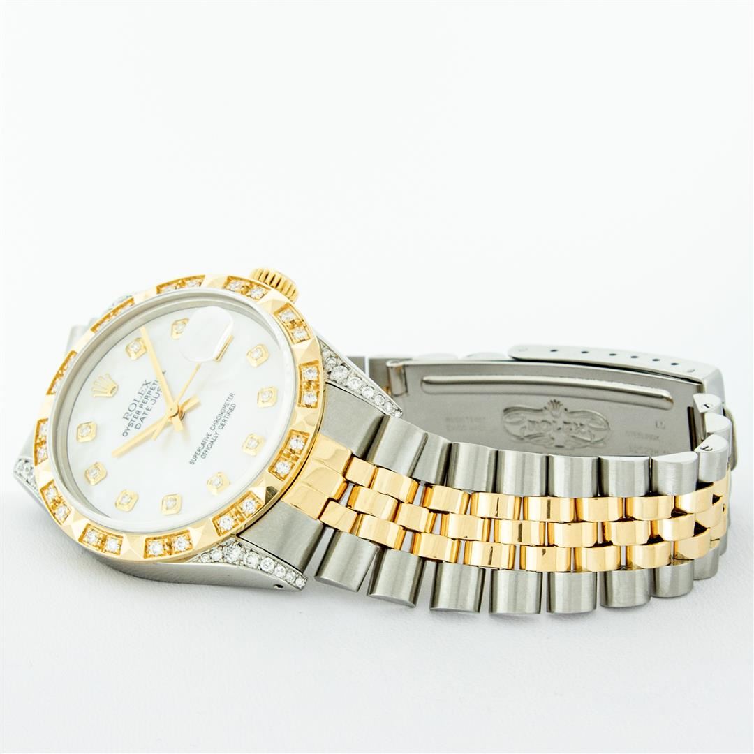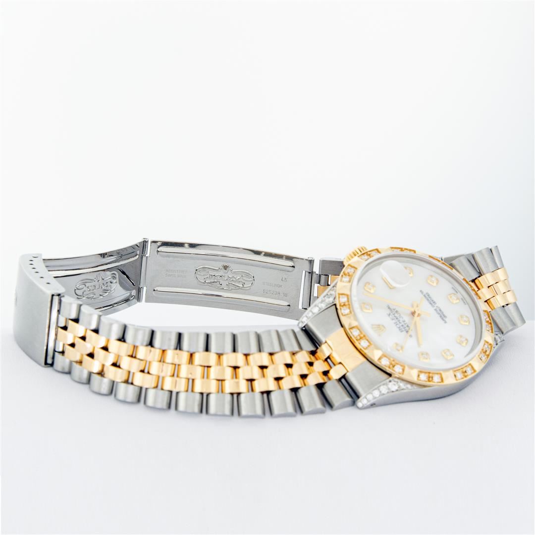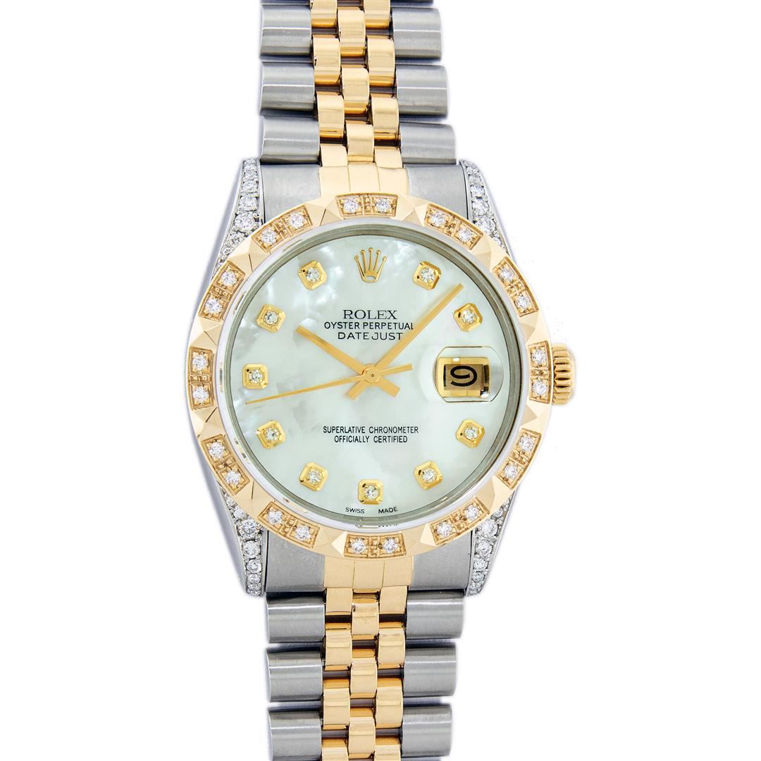 One Mens Yellow Gold & Stainless Steel Datejust Polished Bright with Satin Finish, Serviced & Electronically Tested, Stainless Steel Case: 36mm, Custom Diamond Lugs: 28 Diamonds In Lugs, Color: G to H, Clarity: SI-VS. Yellow Gold Crown, Custom Bezel: New 18K Yellow Gold Pyramid Diamond Bezel, Diamond Count: 24 Diamonds, Total Weight .75 Carat, Clarity: SI-VS, Color: G to H. Custom Crystal: New Scratch Resistant Synthetic Sapphire Cyclops Lens. Custom Hands: New Luminecent Hands. Movement: Automatic Winding Movement. Custom Dial: Mother Of Pearl Diamond, Stone Count: 10 Diamonds On Dial, Color: G to H, Clarity: VS. Date Window: 3 O'Clock Position Date Display, Quickset, Model: Datejust. Condition: G-6 Extra Fine. Bracelet: Yellow Gold And Stainless Steel Jubilee Band. Bright Polish & Satin Finish. 7.0 Inch Length, Adjustable. Standard Clasp, With Rolex Logo. This Watch Has Been Serviced And Polished It Is Free Of All Scratches And Dents.