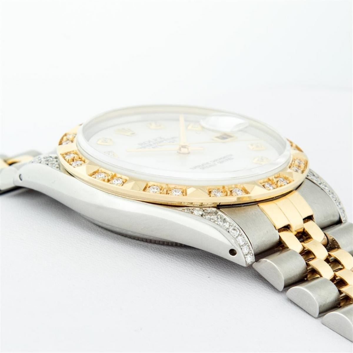 One Mens Yellow Gold & Stainless Steel Datejust Polished Bright with Satin Finish, Serviced & Electronically Tested, Stainless Steel Case: 36mm, Custom Diamond Lugs: 28 Diamonds In Lugs, Color: G to H, Clarity: SI-VS. Yellow Gold Crown, Custom Bezel: New 18K Yellow Gold Pyramid Diamond Bezel, Diamond Count: 24 Diamonds, Total Weight .75 Carat, Clarity: SI-VS, Color: G to H. Custom Crystal: New Scratch Resistant Synthetic Sapphire Cyclops Lens. Custom Hands: New Luminecent Hands. Movement: Automatic Winding Movement. Custom Dial: Mother Of Pearl Diamond, Stone Count: 10 Diamonds On Dial, Color: G to H, Clarity: VS. Date Window: 3 O'Clock Position Date Display, Quickset, Model: Datejust. Condition: G-6 Extra Fine. Bracelet: Yellow Gold And Stainless Steel Jubilee Band. Bright Polish & Satin Finish. 7.0 Inch Length, Adjustable. Standard Clasp, With Rolex Logo. This Watch Has Been Serviced And Polished It Is Free Of All Scratches And Dents.