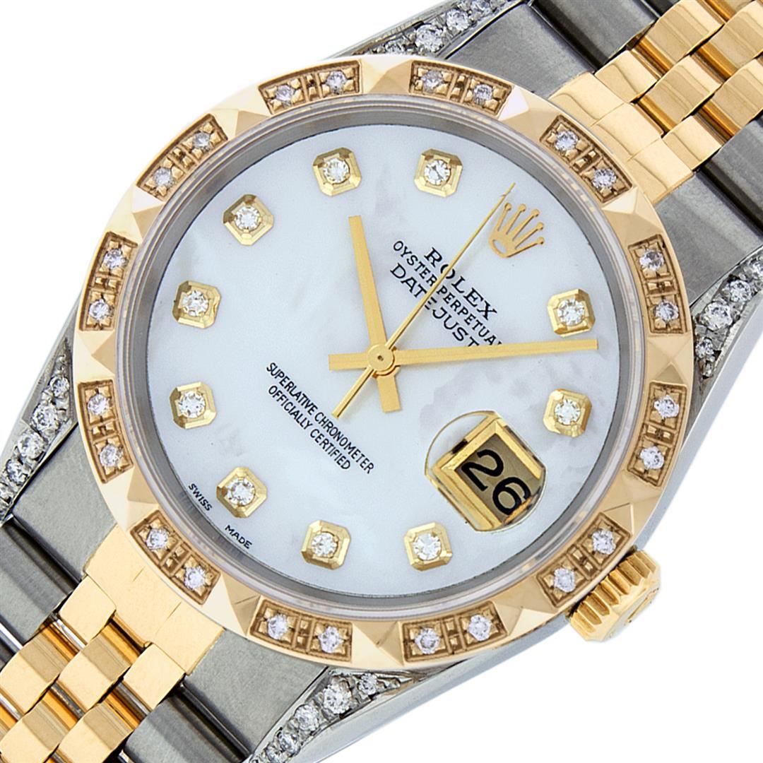 One Mens Pre Owned Yellow Gold Rolex Datejust Polished Bright with Satin Finish, Serviced & Electronically Tested, Stainless Steel Case: 36mm, Custom Diamond Lugs: 28 Diamonds In Lugs, Color: G to H, Clarity: SI-VS. Yellow Gold Crown, Custom Bezel: New 18