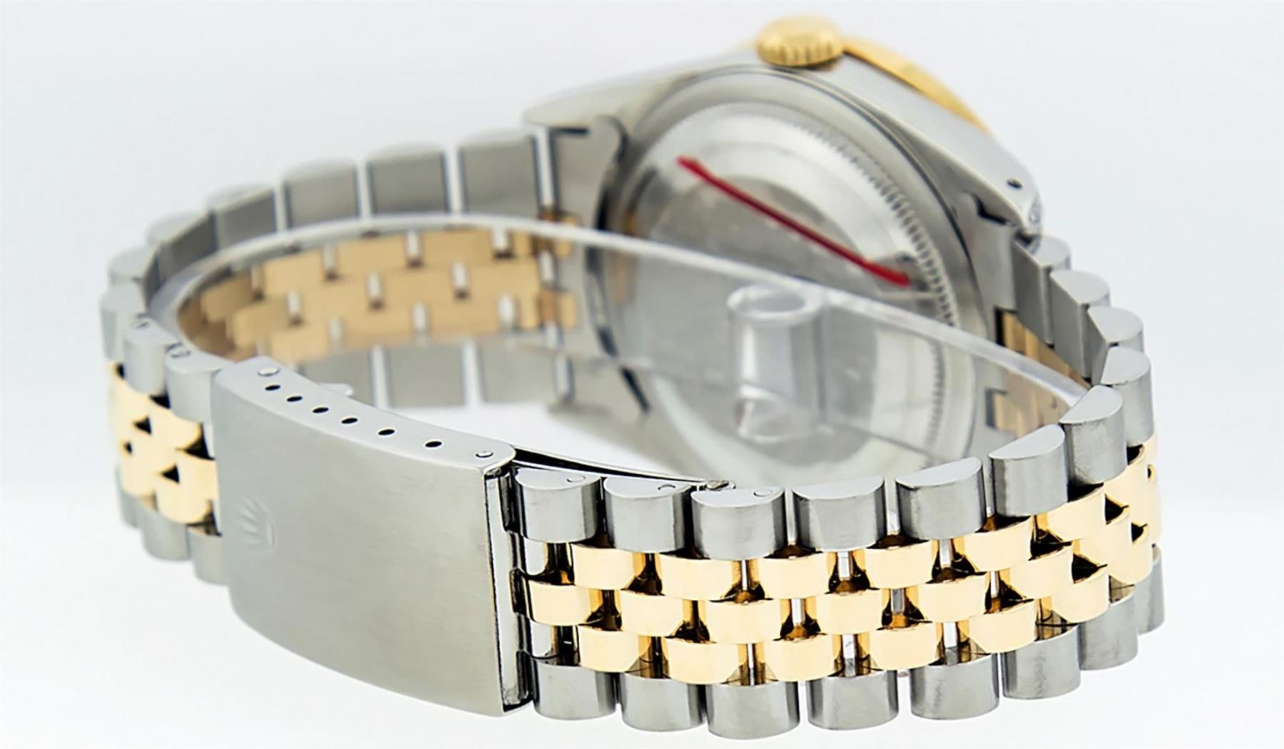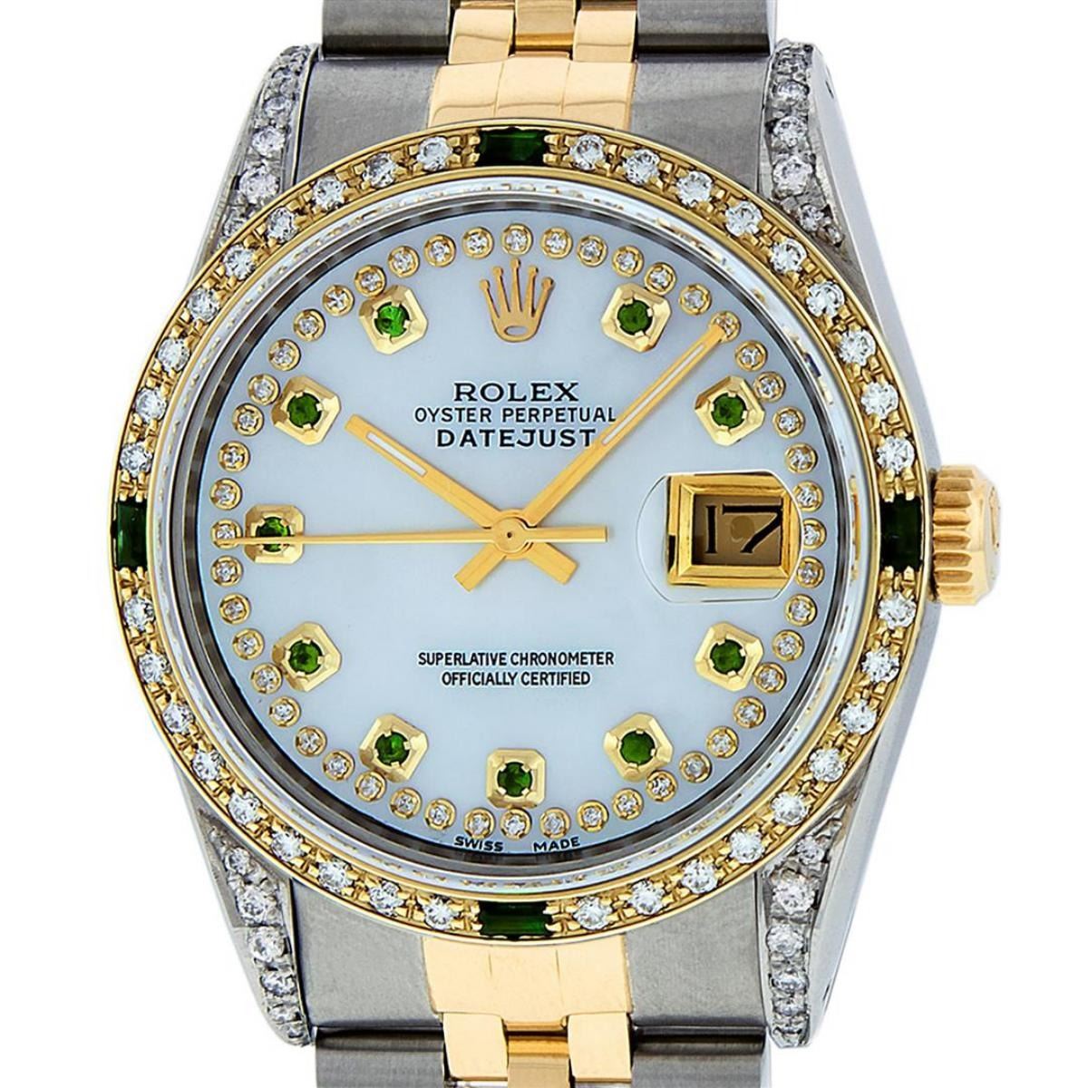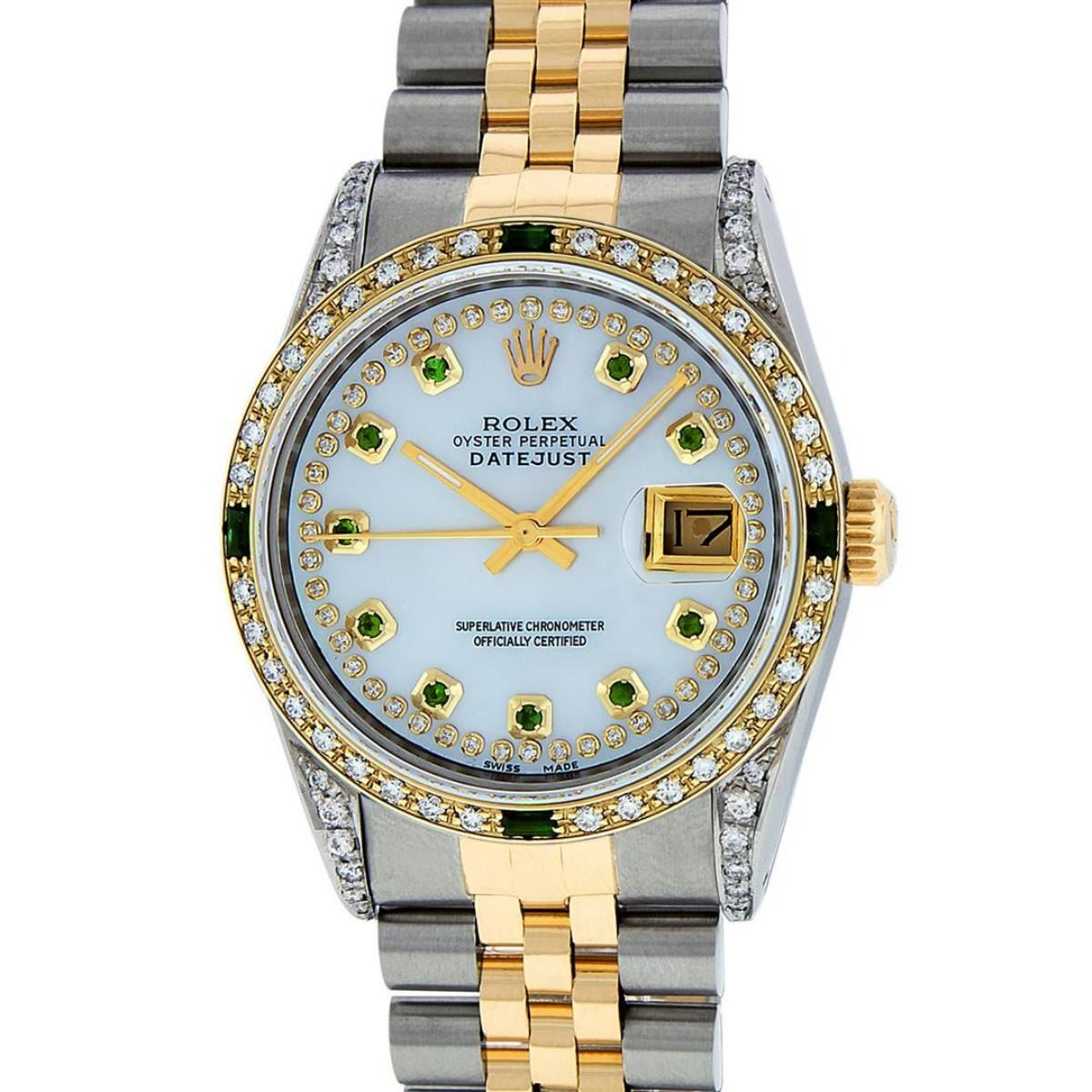 One Mens Yellow Gold Rolex Datejust Polished Bright with Satin Finish, Serviced & Electronically Tested, Stainless Steel Case: 36mm, Custom Diamond Lugs: 28 Diamonds In Lugs, Color: G to H, Clarity: SI-VS. Yellow Gold Crown, Custom Bezel: New 18K Yellow Gold Beadset + Emerald Diamond Bezel, Stone Count: 36 Diamonds + 4 Emerlads, Total Weight 1.00 Carat, Clarity: SI-VS, Color: G to H. Custom Crystal: New Scratch Resistant Synthetic Sapphire Cyclops Lens. Custom Hands: New Luminecent Hands. Movement: Automatic Winding Movement . Custom Dial: Mother Of Pearl Emerald String Diamond, Stone Count: 48 Diamonds + 10 Emeralds In Dial, Color: G to H, Clarity: VS. Date Window: 3 O'Clock Position Date Display, Quickset, Model: Datejust. Condition: G-6 Extra Fine. Bracelet: Yellow Gold And Stainless Steel Jubilee Band. Bright Polish & Satin Finish. 7.0 Inch Length, Adjustable. Standard Clasp, With Rolex Logo. This Watch Has Been Serviced And Polished It Is Free Of All Scratches And Dents.