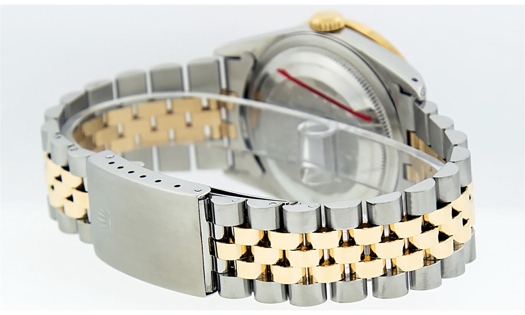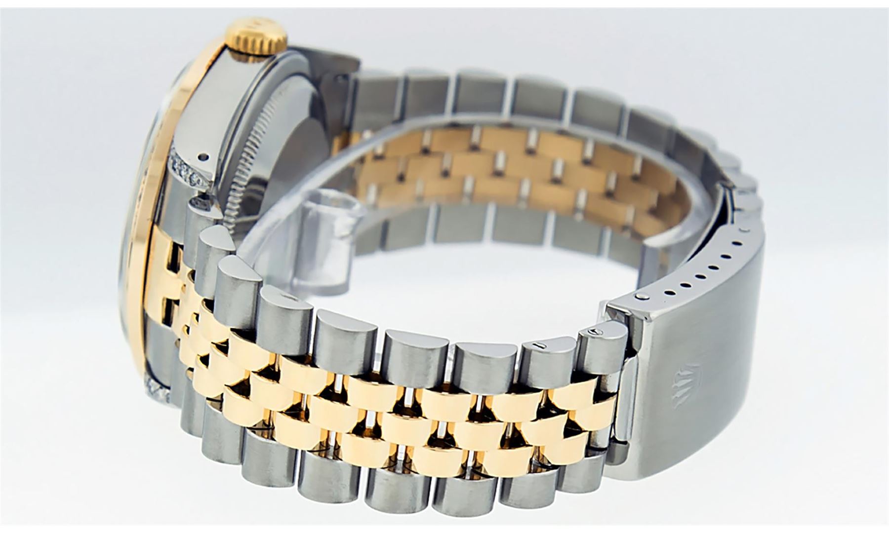 One Mens Pre Owned Yellow Gold Rolex Datejust Polished Bright with Satin Finish, Serviced & Electronically Tested, Stainless Steel Case: 36mm, Custom Diamond Lugs: 28 Diamonds In Lugs, Color: G to H, Clarity: SI-VS. Yellow Gold Crown, Custom Bezel: New 18
