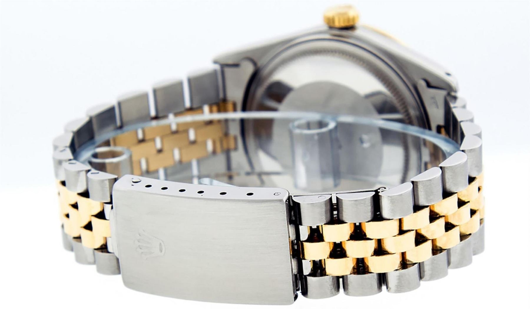 One Mens Yellow Gold Rolex Datejust Polished Bright with Satin Finish, Serviced & Electronically Tested, Stainless Steel Case: 36mm, Custom Diamond Lugs: 28 Diamonds In Lugs, Color: G to H, Clarity: SI-VS. Yellow Gold Crown, Custom Bezel: New 18K Yellow Gold Beadset + Ruby Diamond Bezel, Stone Count: 36 Diamonds + 4 Rubies, Total Weight 1.00 Carat, Clarity: SI-VS, Color: G to H. Custom Crystal: New Scratch Resistant Synthetic Sapphire Cyclops Lens. Custom Hands: New Luminecent Hands. Movement: Automatic Winding Movement . Custom Dial: Mother Of Pearl Ruby String Diamond, Stone Count: 48 Diamonds + 10 Rubies In Dial, Color: G to H, Clarity: VS. Date Window: 3 O'Clock Position Date Display, Quickset, Model: Datejust. Condition: G-6 Extra Fine. Bracelet: Yellow Gold And Stainless Steel Jubilee Band. Bright Polish & Satin Finish. 7.0 Inch Length, Adjustable. Standard Clasp, With Rolex Logo. This Watch Has Been Serviced And Polished It Is Free Of All Scratches And Dents.