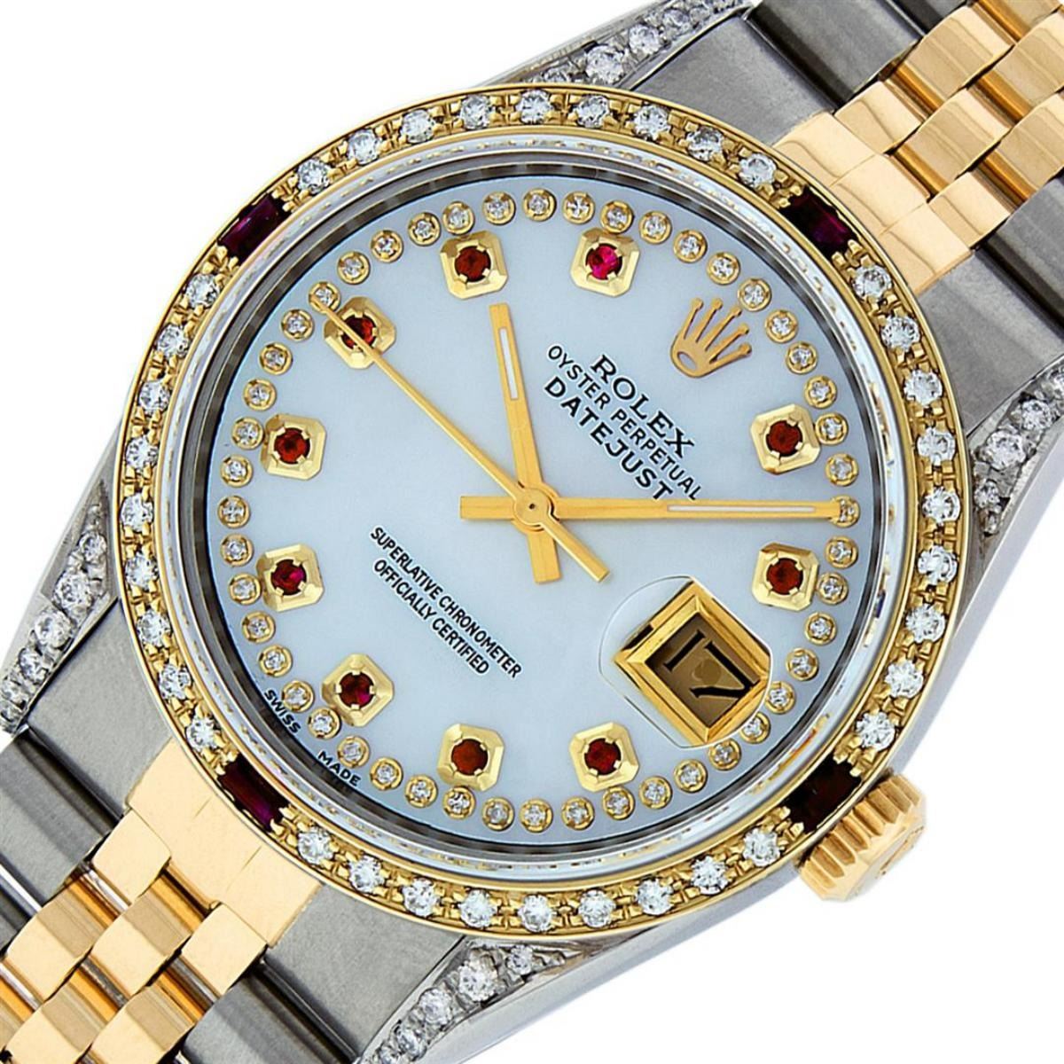One Mens Yellow Gold Rolex Datejust Polished Bright with Satin Finish, Serviced & Electronically Tested, Stainless Steel Case: 36mm, Custom Diamond Lugs: 28 Diamonds In Lugs, Color: G to H, Clarity: SI-VS. Yellow Gold Crown, Custom Bezel: New 18K Yellow Gold Beadset + Ruby Diamond Bezel, Stone Count: 36 Diamonds + 4 Rubies, Total Weight 1.00 Carat, Clarity: SI-VS, Color: G to H. Custom Crystal: New Scratch Resistant Synthetic Sapphire Cyclops Lens. Custom Hands: New Luminecent Hands. Movement: Automatic Winding Movement . Custom Dial: Mother Of Pearl Ruby String Diamond, Stone Count: 48 Diamonds + 10 Rubies In Dial, Color: G to H, Clarity: VS. Date Window: 3 O'Clock Position Date Display, Quickset, Model: Datejust. Condition: G-6 Extra Fine. Bracelet: Yellow Gold And Stainless Steel Jubilee Band. Bright Polish & Satin Finish. 7.0 Inch Length, Adjustable. Standard Clasp, With Rolex Logo. This Watch Has Been Serviced And Polished It Is Free Of All Scratches And Dents.