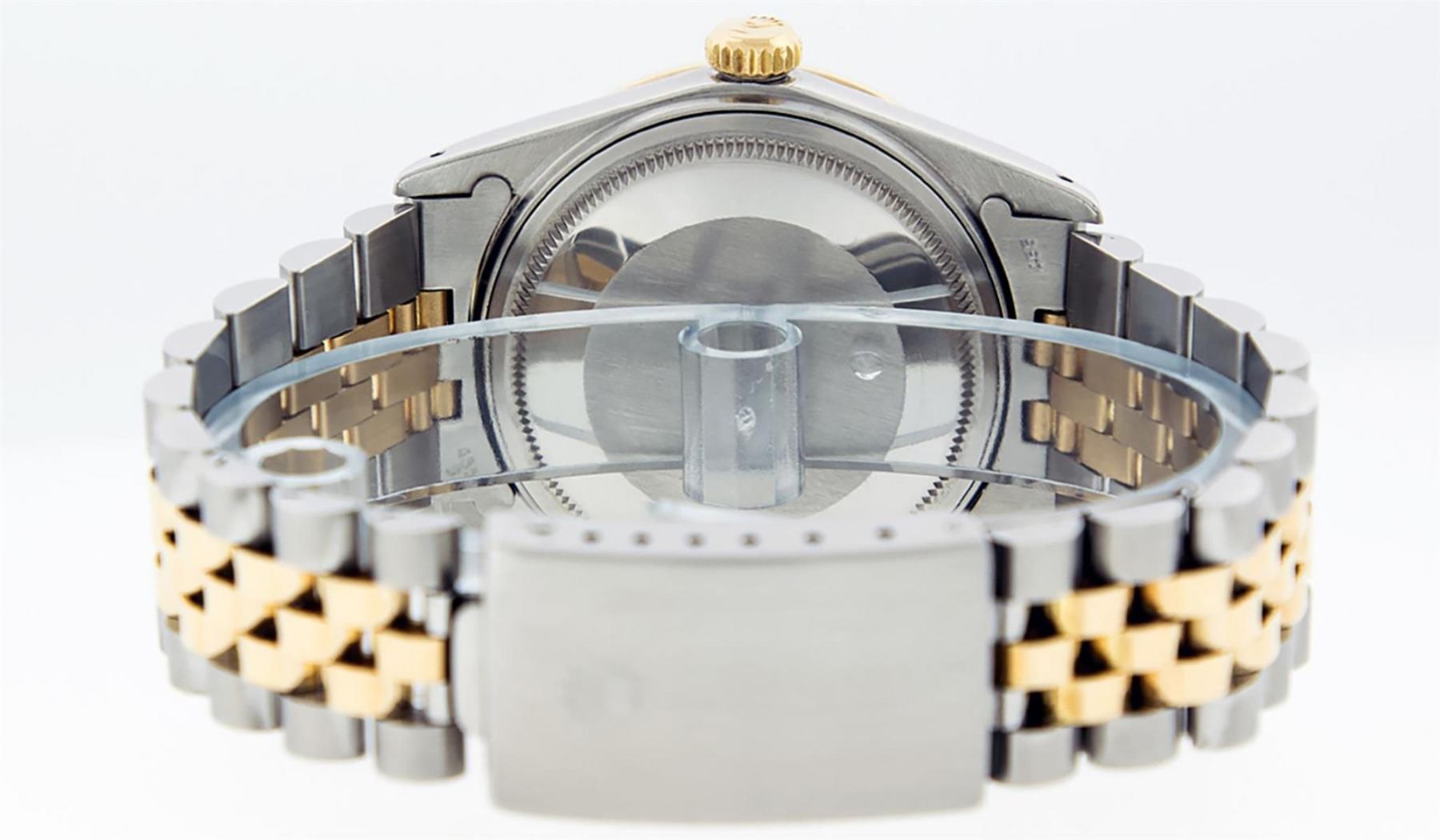 One Mens Yellow Gold Rolex Datejust Polished Bright with Satin Finish, Serviced & Electronically Tested, Stainless Steel Case: 36mm, Custom Diamond Lugs: 28 Diamonds In Lugs, Color: G to H, Clarity: SI-VS. Yellow Gold Crown, Custom Bezel: New 18K Yellow Gold Beadset + Ruby Diamond Bezel, Stone Count: 36 Diamonds + 4 Rubies, Total Weight 1.00 Carat, Clarity: SI-VS, Color: G to H. Custom Crystal: New Scratch Resistant Synthetic Sapphire Cyclops Lens. Custom Hands: New Luminecent Hands. Movement: Automatic Winding Movement . Custom Dial: Mother Of Pearl Ruby String Diamond, Stone Count: 48 Diamonds + 10 Rubies In Dial, Color: G to H, Clarity: VS. Date Window: 3 O'Clock Position Date Display, Quickset, Model: Datejust. Condition: G-6 Extra Fine. Bracelet: Yellow Gold And Stainless Steel Jubilee Band. Bright Polish & Satin Finish. 7.0 Inch Length, Adjustable. Standard Clasp, With Rolex Logo. This Watch Has Been Serviced And Polished It Is Free Of All Scratches And Dents.