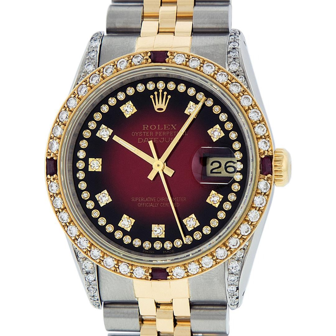 One Mens Yellow Gold & Stainless Steel Datejust Polished Bright with Satin Finish, Serviced & Electronically Tested, Stainless Steel Case: 36mm, Custom Diamond Lugs: 28 Diamonds On Lugs, Color: G to H, Clarity: SI-VS. Yellow Gold Crown, Custom Bezel: New 18K Yellow Gold Beadset Diamond + Ruby Bezel, Diamond + Stone Count: 36 Diamonds + 4 Rubies, Total Weight 1.00 Carat, Clarity: SI-VS, Color: G to H. Custom Crystal: New Scratch Resistant Synthetic Sapphire Cyclops Lens. Custom Hands: New Luminecent Hands. Movement: Automatic Winding Movement. Custom Dial: Red Vignette Single Cut String Diamond Dial, Stone Count: 58 Diamonds In Dial, Color: G to H, Clarity: VS2. Date Window: 3 O'Clock Position Date Display, Quickset, Model: 16013 Datejust. Condition: G-6 Extra Fine. Bracelet: Yellow Gold And Stainless Steel Jubilee Band. Bright Polish & Satin Finish. 7.0 Inch Length, Adjustable. Standard Clasp, With Rolex Logo. This Watch Has Been Serviced And Polished It Is Free Of All Scratches And Dents.