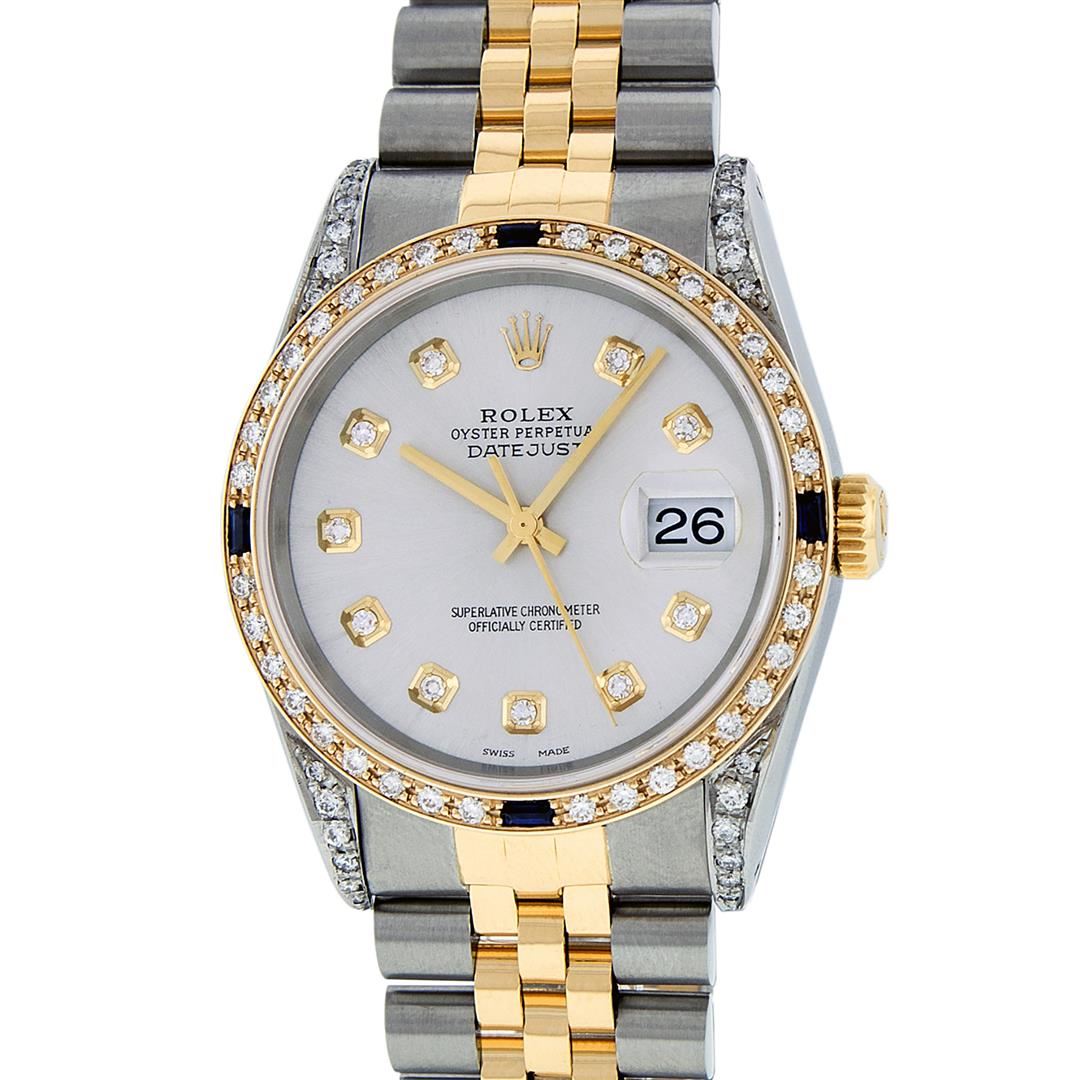 One Mens Yellow Gold & Stainless Steel Datejust Polished Bright with Satin Finish, Serviced & Electronically Tested, Stainless Steel Case: 36mm, Custom Diamond Lugs: 28 Diamonds In Lugs, Color: G to H, Clarity: SI-VS. Yellow Gold Crown, Custom Bezel: New 18K Yellow Gold Sapphire + Diamond Bezel, Stone Count: 36 Diamonds + 4 Sapphires, Total Weight 1.00 Carat, Clarity: SI-VS, Color: G to H. Custom Crystal: New Scratch Resistant Synthetic Sapphire Cyclops Lens. Custom Hands: New Luminecent Hands. Movement: Automatic Winding Movement. Custom Dial: Silver Diamond Dial, Stone Count: 10 Diamonds In Dial, Color: G to H, Clarity: VS. Date Window: 3 O'Clock Position Date Display, Quickset, Model: Datejust. Condition: G-6 Extra Fine. Bracelet: Yellow Gold And Stainless Steel Jubilee Band. Bright Polish & Satin Finish. 7.0 Inch Length, Adjustable. Standard Clasp, With Rolex Logo. This Watch Has Been Serviced And Polished It Is Free Of All Scratches And Dents.