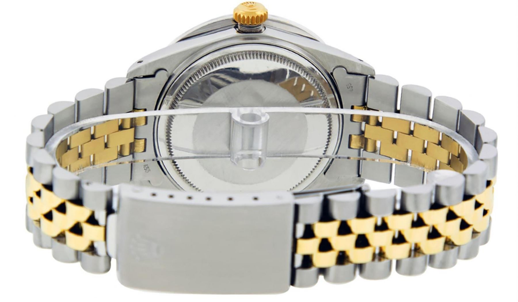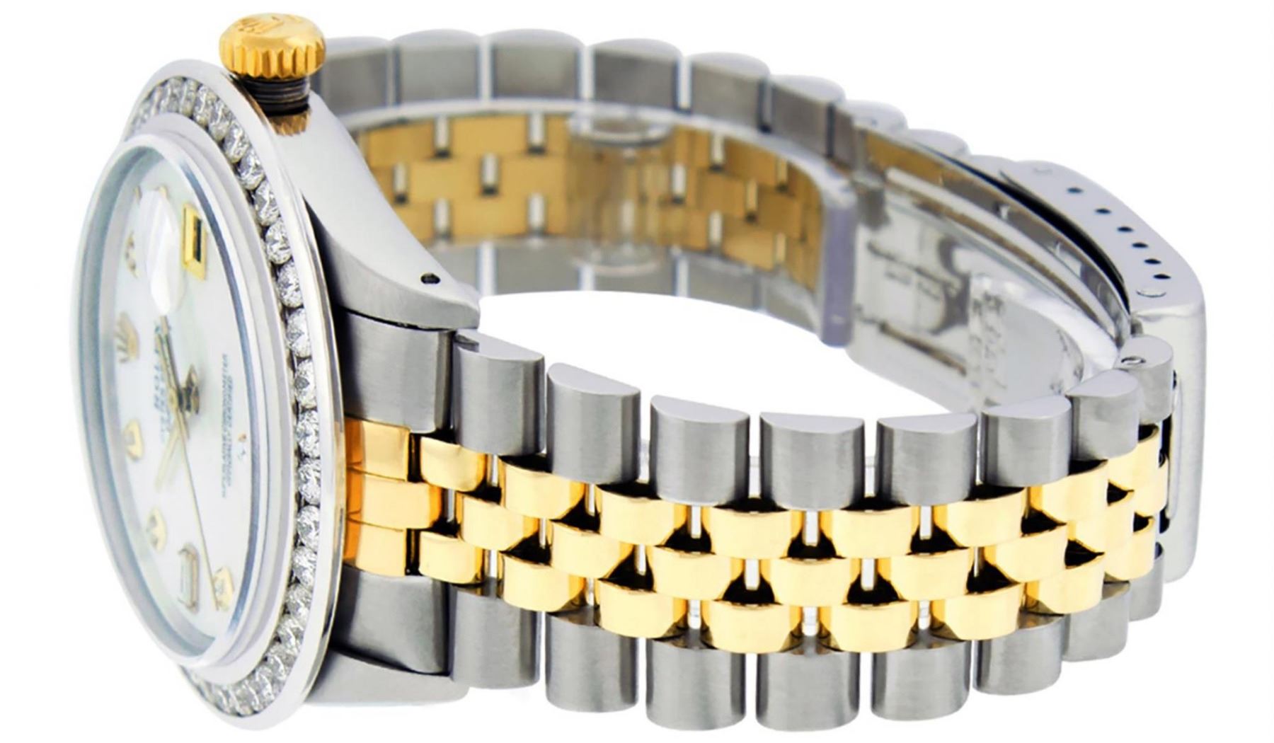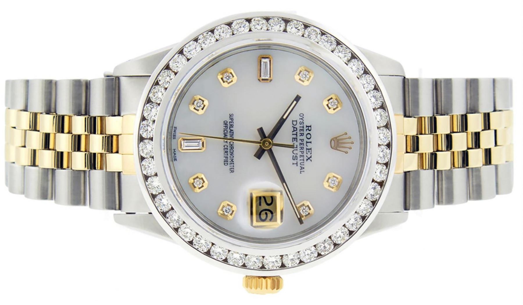 One Mens Yellow Gold & Stainless Steel Rolex Datejust Polished Bright with Satin Finish, Serviced & Electronically Tested, Stainless Steel Case: 36mm, Yellow Gold Crown, Custom Bezel: New 18K White Gold 3ct Channel Set Diamond Bezel, Diamond Count: 40 Diamonds, Total Weight 3.00 Carat, Clarity: SI-VS, Color: G to H. Custom Crystal: New Scratch Resistant Synthetic Sapphire Cyclops Lens. Custom Hands: New Luminecent Hands. Movement: Automatic Winding Movement. Custom Dial: Mother Of Pearl Diamond Dial, Diamond Count: 8 Diamonds + 2 Baguette Diamonds In Dial, Color: G to H, Clarity: SI-VS. Date Window: 3 O'Clock Position Date Display, Quickset, Model: Datejust. Condition: G-6 Extra Fine. Bracelet: Yellow Gold And Stainless Steel Jubilee Band. Bright Polish & Satin Finish. 7.0 Inch Length, Adjustable. Standard Clasp, With Rolex Logo. This Watch Has Been Serviced And Polished It Is Free Of All Scratches And Dents.