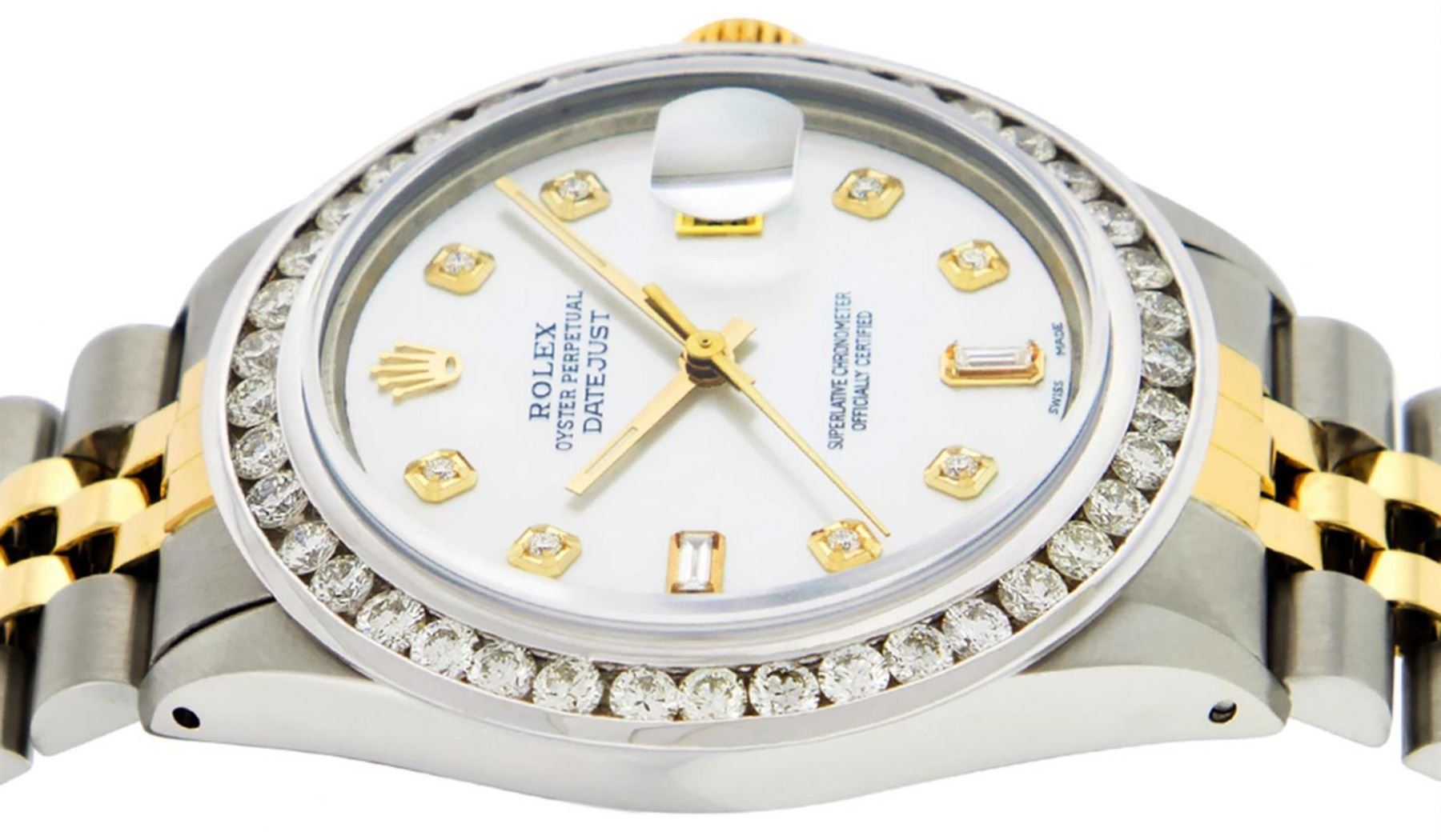 One Mens Yellow Gold & Stainless Steel Rolex Datejust Polished Bright with Satin Finish, Serviced & Electronically Tested, Stainless Steel Case: 36mm, Yellow Gold Crown, Custom Bezel: New 18K White Gold 3ct Channel Set Diamond Bezel, Diamond Count: 40 Diamonds, Total Weight 3.00 Carat, Clarity: SI-VS, Color: G to H. Custom Crystal: New Scratch Resistant Synthetic Sapphire Cyclops Lens. Custom Hands: New Luminecent Hands. Movement: Automatic Winding Movement. Custom Dial: Mother Of Pearl Diamond Dial, Diamond Count: 8 Diamonds + 2 Baguette Diamonds In Dial, Color: G to H, Clarity: SI-VS. Date Window: 3 O'Clock Position Date Display, Quickset, Model: Datejust. Condition: G-6 Extra Fine. Bracelet: Yellow Gold And Stainless Steel Jubilee Band. Bright Polish & Satin Finish. 7.0 Inch Length, Adjustable. Standard Clasp, With Rolex Logo. This Watch Has Been Serviced And Polished It Is Free Of All Scratches And Dents.