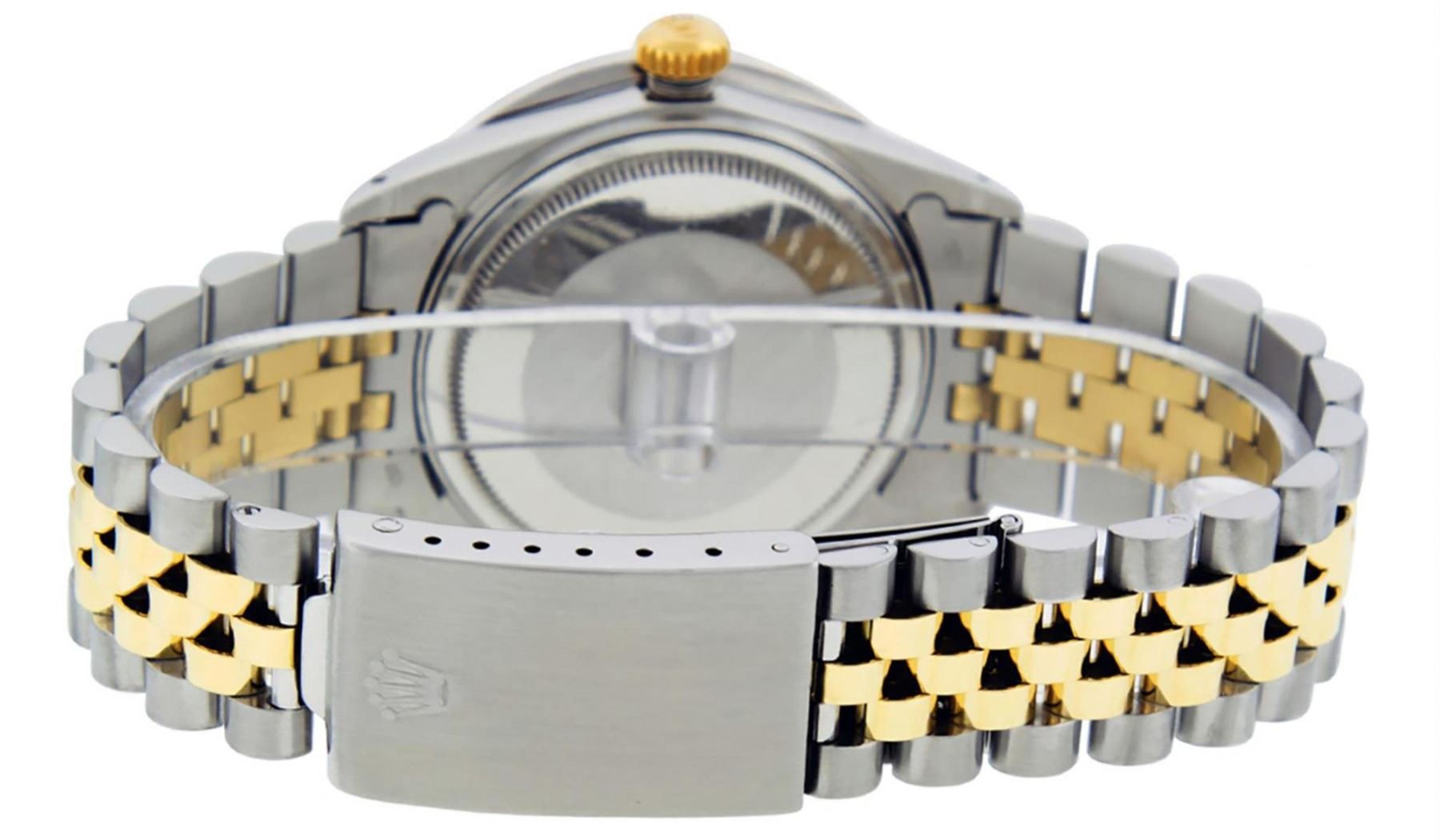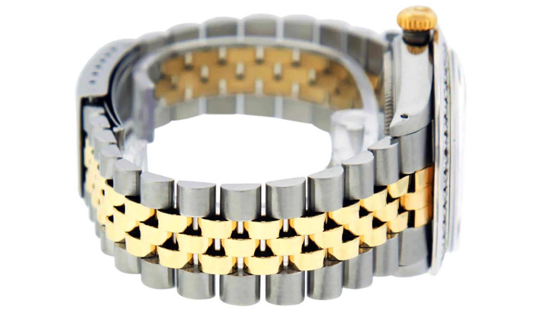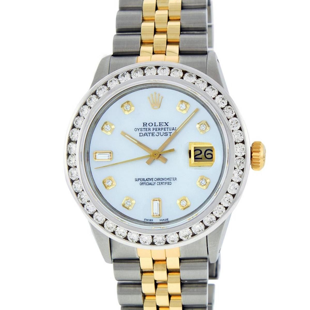 One Mens Pre Owned Yellow Gold & Stainless Steel Rolex Datejust Polished Bright with Satin Finish, Serviced & Electronically Tested, Rolex Stainless Steel Case: 36mm, Yellow Gold Crown, Custom Bezel: New 18K White Gold 3ct Channel Set Diamond Bezel, Diamond Count: 40 Diamonds, Total Weight 3.00 Carat, Clarity: SI-VS, Color: G to H. Custom Crystal: New Sapphire With Magnified Date Window. Custom Hands: New Luminescent Hands. Rolex Movement: Automatic Winding Movement. Custom Dial: Mother Of Pearl Diamond Dial, Diamond Count: 8 Diamonds + 2 Baguette Diamonds In Dial, Color: G to H, Clarity: SI-VS. Date Window: 3 O'Clock Position Date Display, Quickset, Model: Datejust. Condition: G-6 Extra Fine. Rolex Bracelet: Yellow Gold And Stainless Steel Jubilee Band. Bright Polish & Satin Finish. 7.0 Inch Length, Adjustable. Standard Clasp, With Rolex Logo. This Watch Has Been Serviced And Polished It Is Free Of All Scratches And Dents.