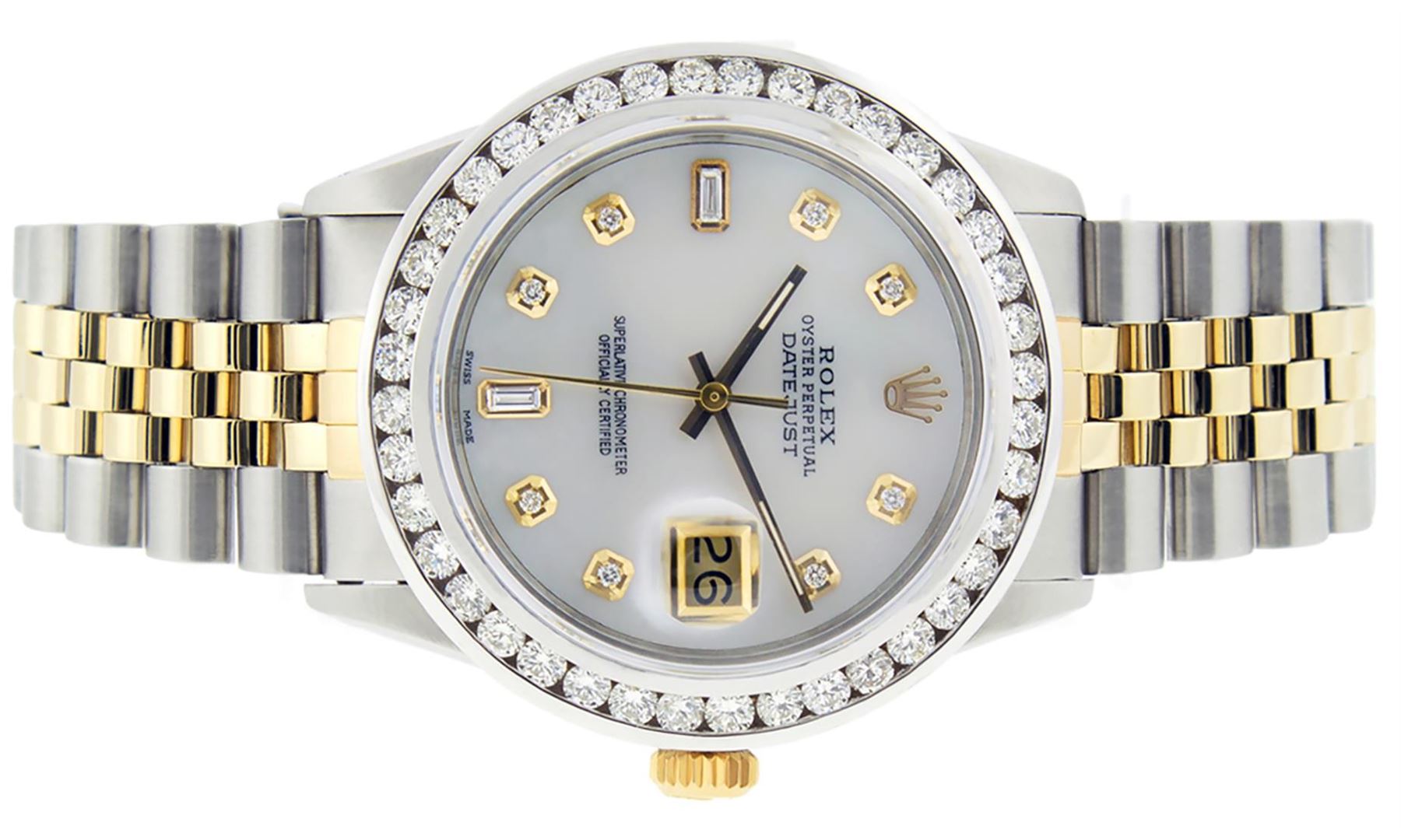 One Mens Pre Owned Yellow Gold & Stainless Steel Rolex Datejust Polished Bright with Satin Finish, Serviced & Electronically Tested, Rolex Stainless Steel Case: 36mm, Yellow Gold Crown, Custom Bezel: New 18K White Gold 3ct Channel Set Diamond Bezel, Diamond Count: 40 Diamonds, Total Weight 3.00 Carat, Clarity: SI-VS, Color: G to H. Custom Crystal: New Sapphire With Magnified Date Window. Custom Hands: New Luminescent Hands. Rolex Movement: Automatic Winding Movement. Custom Dial: Mother Of Pearl Diamond Dial, Diamond Count: 8 Diamonds + 2 Baguette Diamonds In Dial, Color: G to H, Clarity: SI-VS. Date Window: 3 O'Clock Position Date Display, Quickset, Model: Datejust. Condition: G-6 Extra Fine. Rolex Bracelet: Yellow Gold And Stainless Steel Jubilee Band. Bright Polish & Satin Finish. 7.0 Inch Length, Adjustable. Standard Clasp, With Rolex Logo. This Watch Has Been Serviced And Polished It Is Free Of All Scratches And Dents.