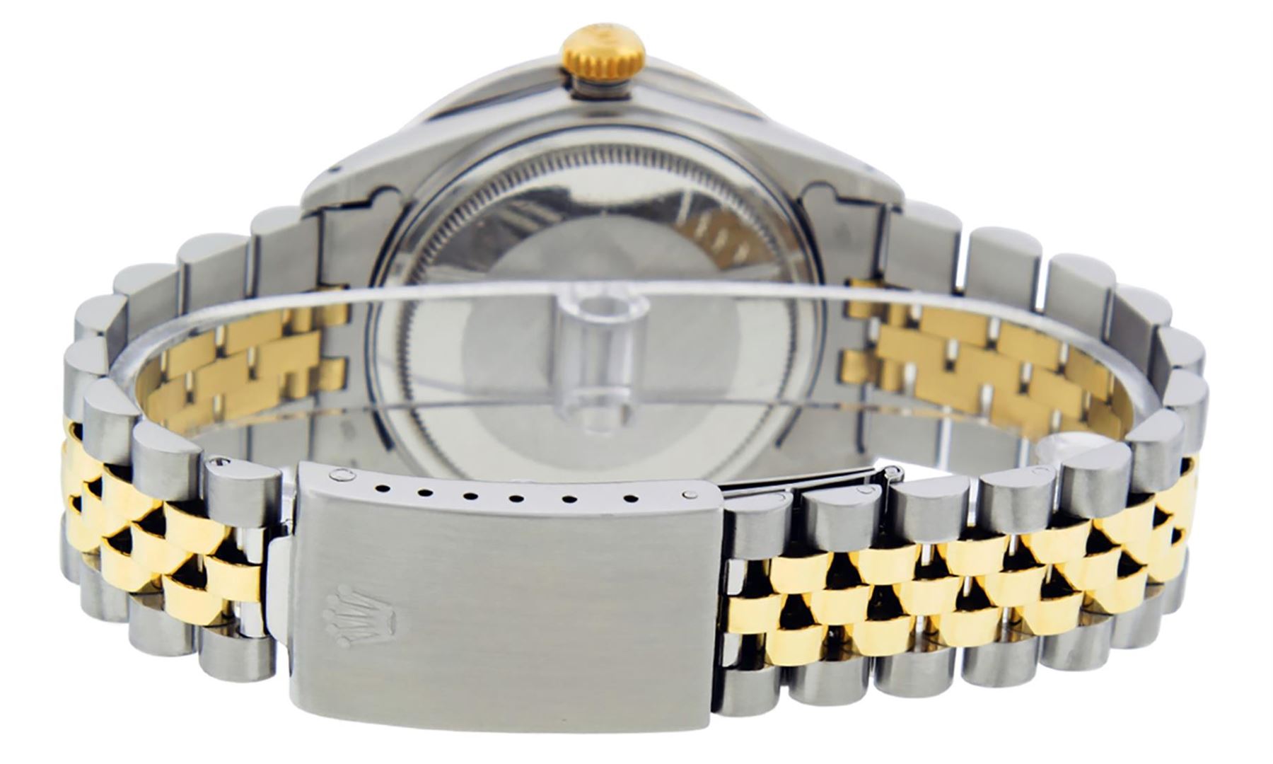 One Mens 14K Yellow Gold Rolex Datejust Polished Bright with Satin Finish, Serviced & Electronically Tested, Stainless Steel Case: 36mm, Yellow Gold Crown, Custom Bezel: New 18K Yellow Gold 3ct Channel Set Diamond Bezel, Diamond Count: 40 Diamonds, Total Weight 3.00 Carat, Clarity: SI-VS, Color: G to H. Custom Crystal: New Scratch Resistant Synthetic Sapphire Cyclops Lens. Custom Hands: New Luminecent Hands. Movement: Automatic Winding Movement Caliber 3035. Custom Dial: Mother Of Pearl Diamond Dial, Diamond Count: 8 Diamonds + 2 Baguette Diamonds In Dial, Color: G to H, Clarity: SI-VS. Date Window: 3 O'Clock Position Date Display, Quickset, Model: 16013 Datejust. Condition: G-6 Extra Fine. Bracelet: 14K Yellow Gold And Stainless Steel Jubilee Band. Bright Polish & Satin Finish. 7.0 Inch Length, Adjustable. Standard Clasp, With Rolex Logo. This Watch Has Been Serviced And Polished It Is Free Of All Scratches And Dents.
