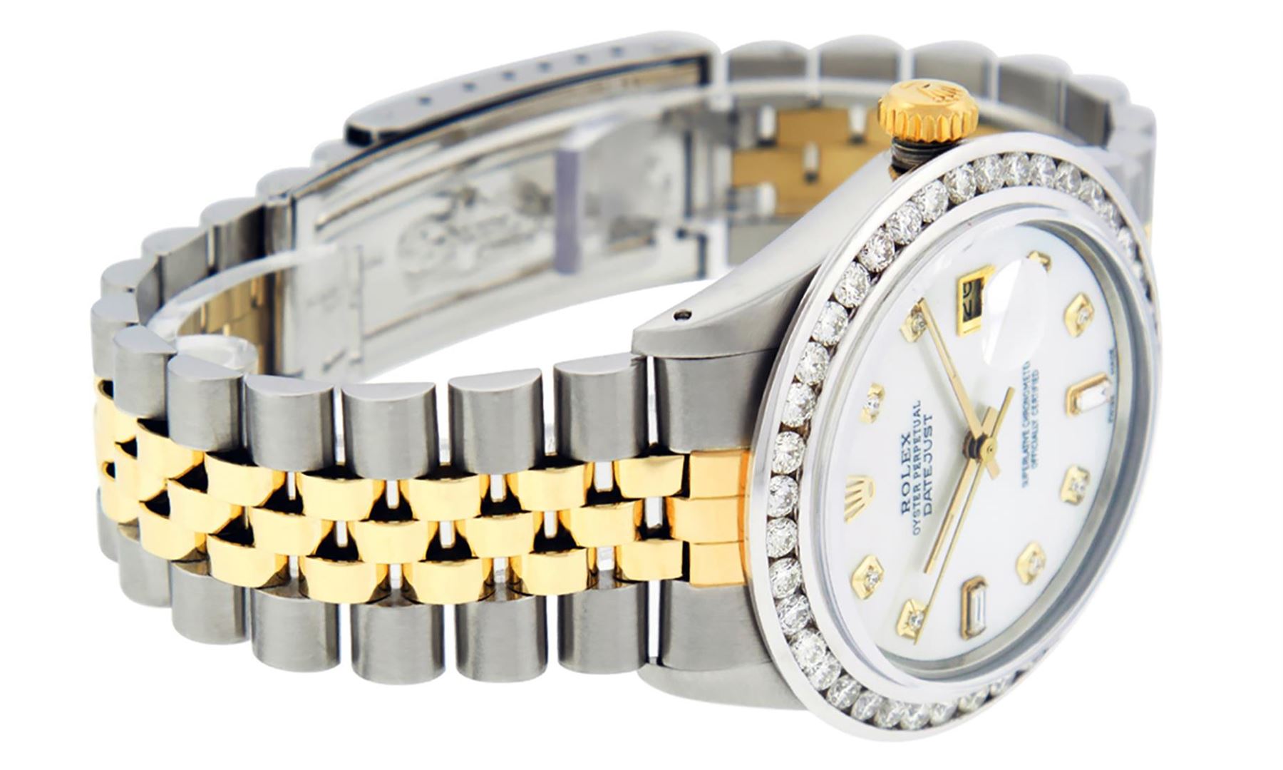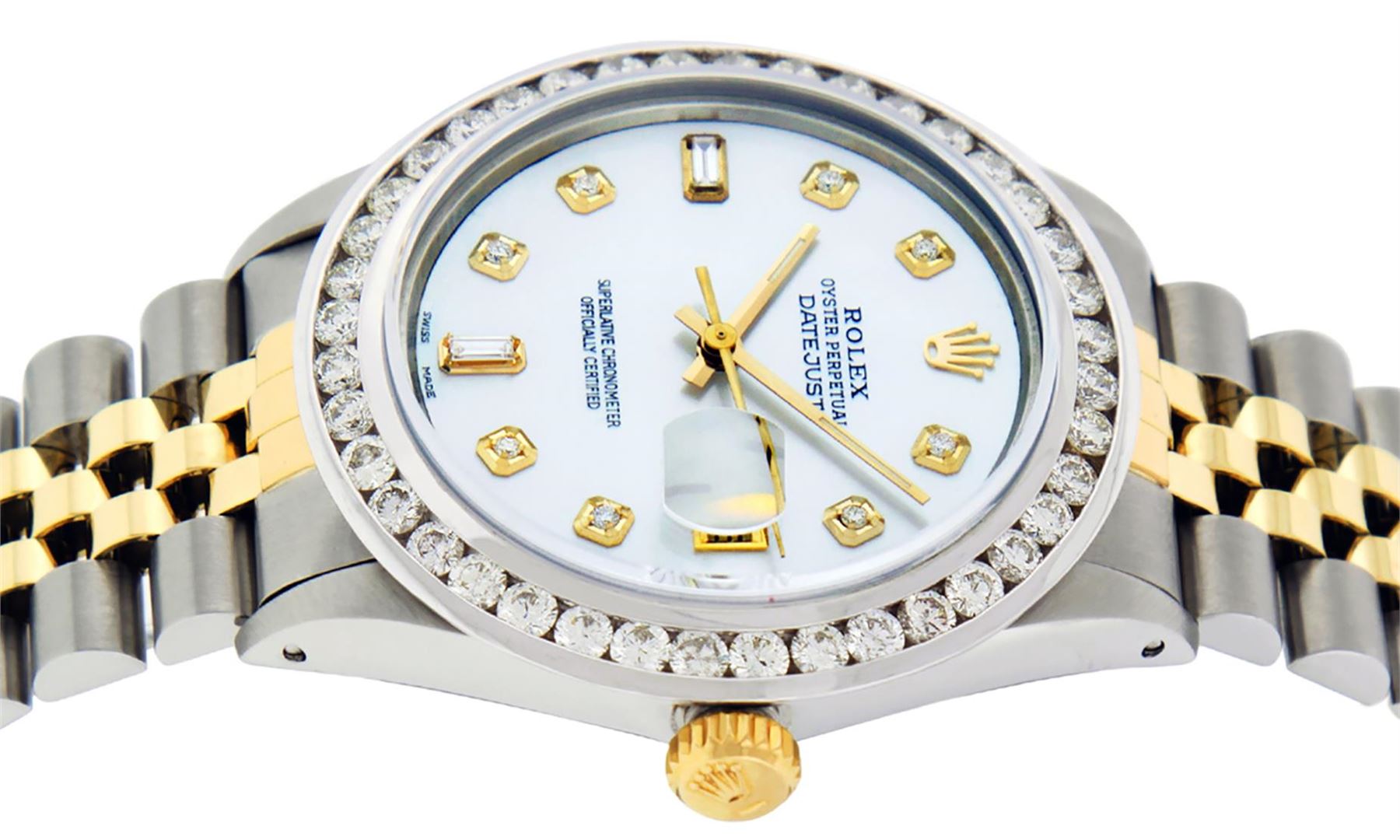 One Mens 14K Yellow Gold Rolex Datejust Polished Bright with Satin Finish, Serviced & Electronically Tested, Stainless Steel Case: 36mm, Yellow Gold Crown, Custom Bezel: New 18K Yellow Gold 3ct Channel Set Diamond Bezel, Diamond Count: 40 Diamonds, Total Weight 3.00 Carat, Clarity: SI-VS, Color: G to H. Custom Crystal: New Scratch Resistant Synthetic Sapphire Cyclops Lens. Custom Hands: New Luminecent Hands. Movement: Automatic Winding Movement Caliber 3035. Custom Dial: Mother Of Pearl Diamond Dial, Diamond Count: 8 Diamonds + 2 Baguette Diamonds In Dial, Color: G to H, Clarity: SI-VS. Date Window: 3 O'Clock Position Date Display, Quickset, Model: 16013 Datejust. Condition: G-6 Extra Fine. Bracelet: 14K Yellow Gold And Stainless Steel Jubilee Band. Bright Polish & Satin Finish. 7.0 Inch Length, Adjustable. Standard Clasp, With Rolex Logo. This Watch Has Been Serviced And Polished It Is Free Of All Scratches And Dents.