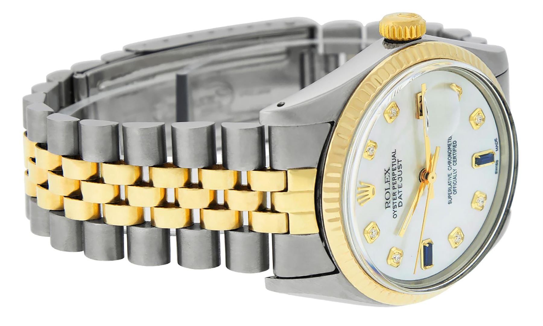 One Mens Yellow Gold Two Tone Rolex Datejust Polished, Serviced & Electronically Tested, Yellow Gold & Stainless Steel Case: 36mm, Yellow Gold Crown, Bezel: Yellow Gold Fluted Bezel. Custom Crystal: New Acrylic Cyclops Lens. Custom Hands: New Luminecent Hands. Movement: Automatic Winding Movement . Custom Dial: Mother Of Pearl Diamond Dial, Stone Count: 8 Diamonds + 2 Synthetic Sapphire Baguettes in Dial, G To H In Color, SI-VS Clarity. Date Window: 3 O'Clock Position Date Display, Quickset, Model: Datejust. Condition: G-6 Extra Fine. Bracelet: Two Tone Yellow Gold & Stainless Steel Jubilee. Bright Polish. 7.0 Inch Length, Adjustable. Standard Clasp, With Rolex Logo. This Watch Has Been Serviced And Polished It Is Free Of All Scratches And Dents.