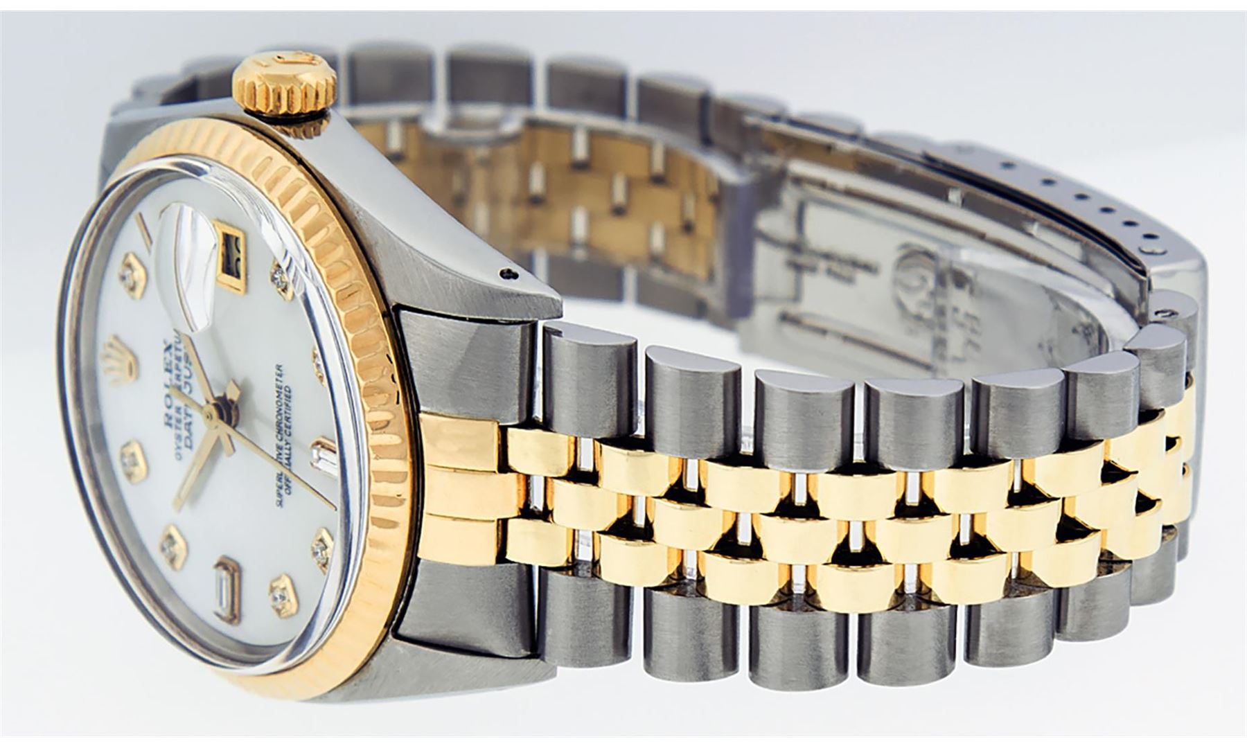 One Mens Pre Owned Yellow Gold Two Tone Rolex Datejust Polished, Serviced & Electronically Tested, Rolex Yellow Gold & Stainless Steel Case: 36mm, Rolex Yellow Gold Crown, Rolex Bezel: Yellow Gold Fluted Bezel. Custom Crystal: New Acrylic Cyclops Lens. Custom Hands: New Luminecent Hands. Rolex Movement: Automatic Winding Movement. Custom Dial: Refinished To Mother Of Pearl With Added Diamonds, Stone Count: 8 Diamonds + 2 Diamond Baguettes in Dial, G To H In Color, SI-VS Clarity. Date Window: 3 O'Clock Position Date Display, Quickset, Model: Datejust. Condition: G-6 Extra Fine. Rolex Bracelet: Two Tone Yellow Gold & Stainless Steel Jubilee Band. Bright Polish. 7.0 Inch Length, Adjustable. Standard Clasp, With Rolex Logo. This Watch Has Been Serviced And Polished It Is Free Of All Scratches And Dents.