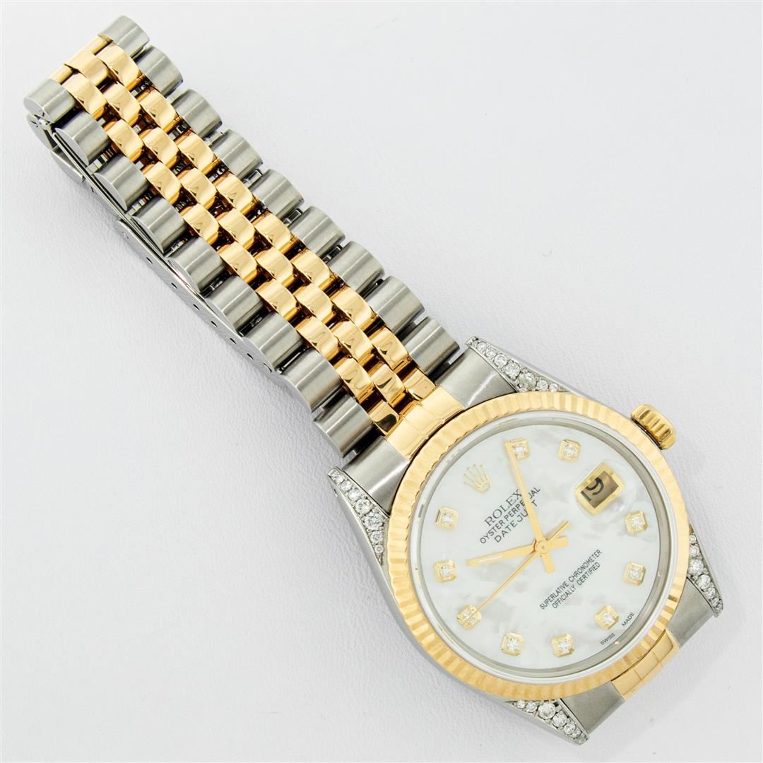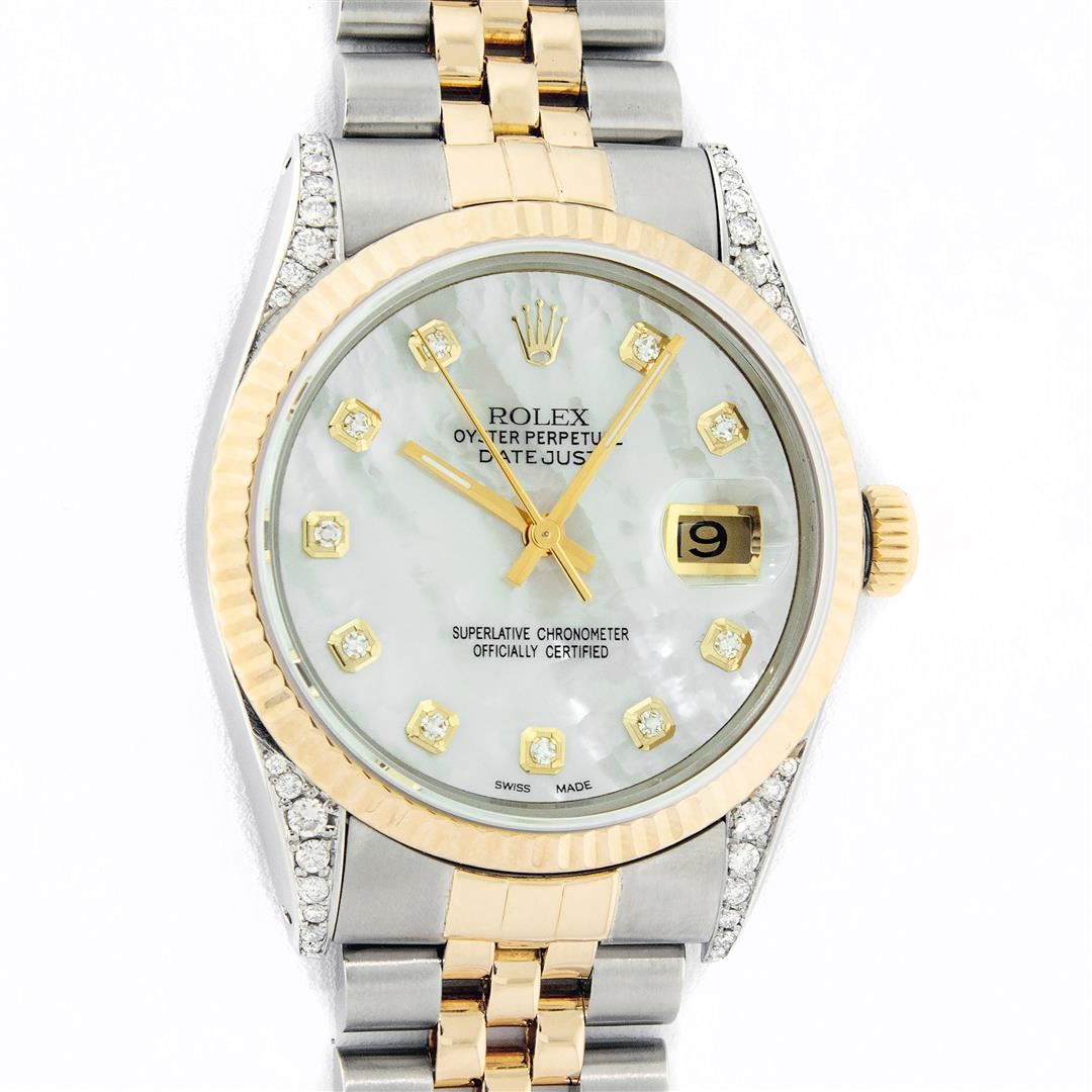 One Mens Yellow Gold & Stainless Steel Datejust Polished Bright with Satin Finish, Serviced & Electronically Tested, Stainless Steel Case: 36mm, Custom Diamond Lugs: 28 Diamonds On Lugs, Color: G to H, Clarity: SI-VS. Yellow Gold Crown, Bezel: Yellow Gold Fluted Bezel. Custom Crystal: New Scratch Resistant Acrylic Cyclops Lens. Custom Hands: New Luminecent Hands. Movement: Automatic Winding Movement. Custom Dial: Mother Of Pearl Diamond Dial, Stone Count: 10 Diamonds On Dial, Color: G to H, Clarity: VS2. Date Window: 3 O'Clock Position Date Display, Quickset, Model: Datejust. Condition: G-6 Extra Fine. Bracelet: Yellow Gold And Stainless Steel Jubilee Band. Bright Polish & Satin Finish. 7.0 Inch Length, Adjustable. Standard Clasp, With Rolex Logo. This Watch Has Been Serviced And Polished It Is Free Of All Scratches And Dents.