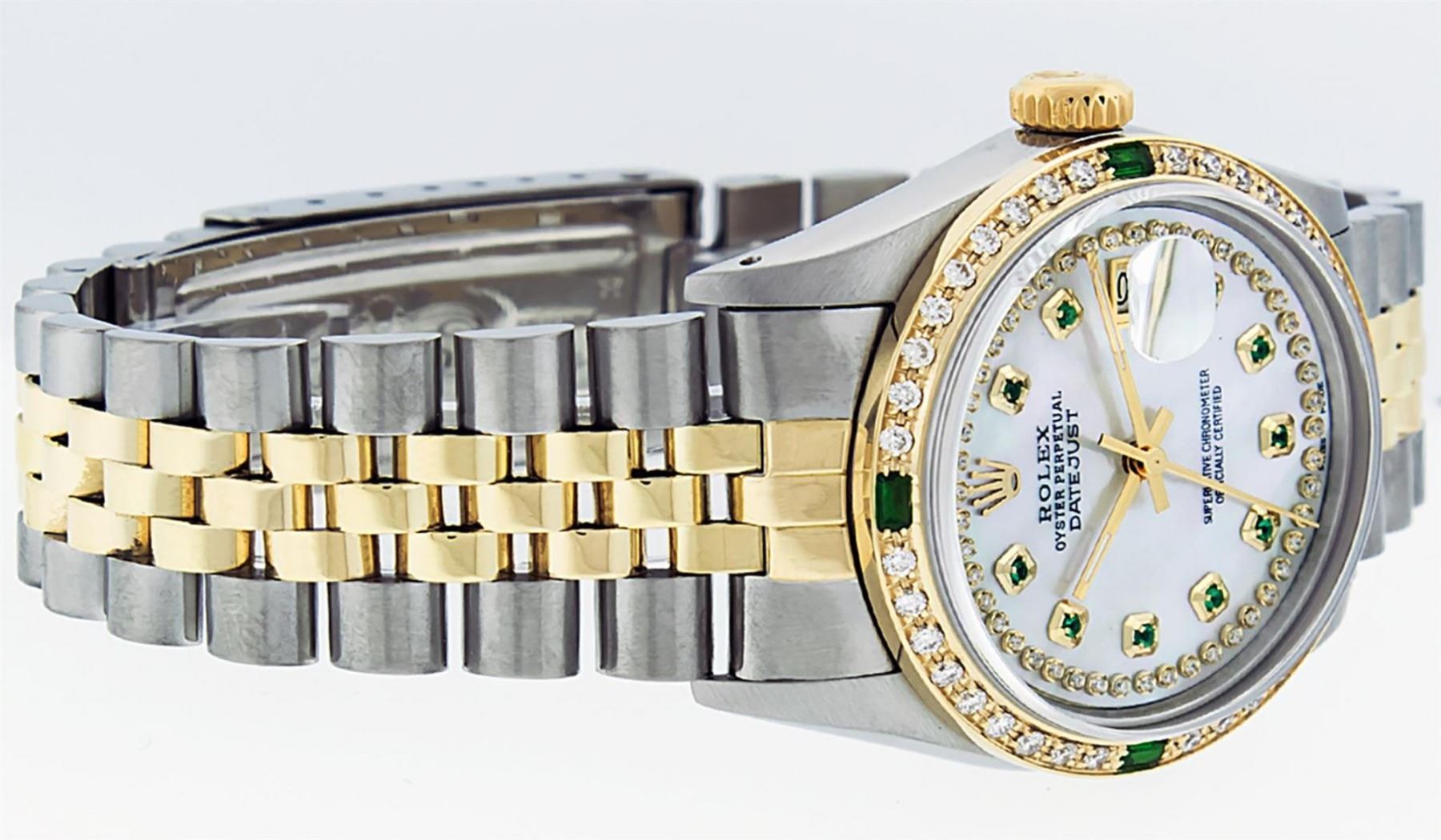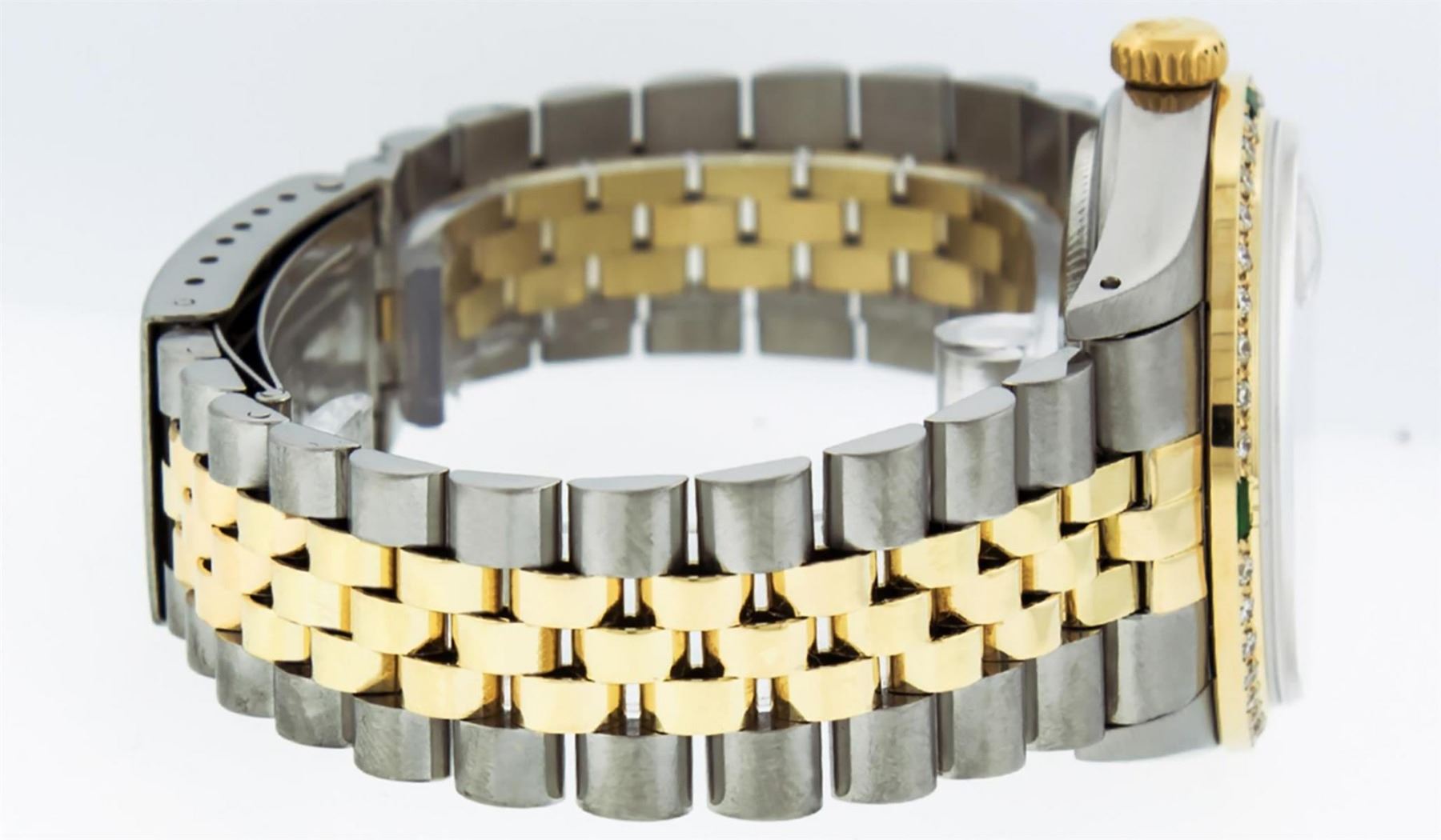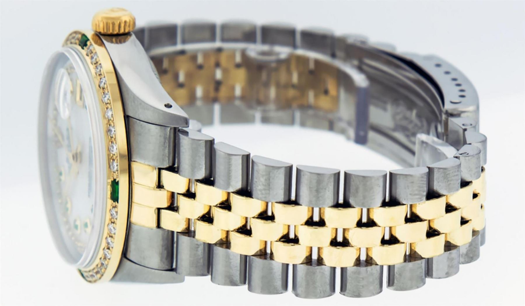 One Mens Yellow Gold Two Tone Rolex Datejust Polished, Serviced & Electronically Tested, Yellow Gold & Stainless Steel Case: 36mm, Yellow Gold Crown, Custom Bezel: 18K Yellow Gold Synthetic Emerald Beadset Diamond Bezel, Diamond Count: 36 Diamonds + 4 Synthetic Emeralds, Total Weight 1.0 Carat, Clarity: SI-VS, Color: G to H. Custom Crystal: New Synthetic Sapphire Cyclops Lens. Custom Hands: New Luminecent Hands. Movement: Automatic Winding Movement.. Custom Dial: Mother Of Pearl String Diamond Dial, Diamond Count: 48 Diamonds + 10 Emeralds, Color: G to H, Clairty: SI-VS Date Window: 3 O'Clock Position Date Display, Quickset, Model: 16013 Condition: G-6 Extra Fine. Bracelet: Two Tone Yellow Gold & Stainless Steel Jubilee. Bright Polish. 7.0 Inch Length, Adjustable. Standard Clasp, With Rolex Logo. This Watch Has Been Serviced Time Tested And Is In Excellent Condition It Is Free Of All Scratches And Dents.