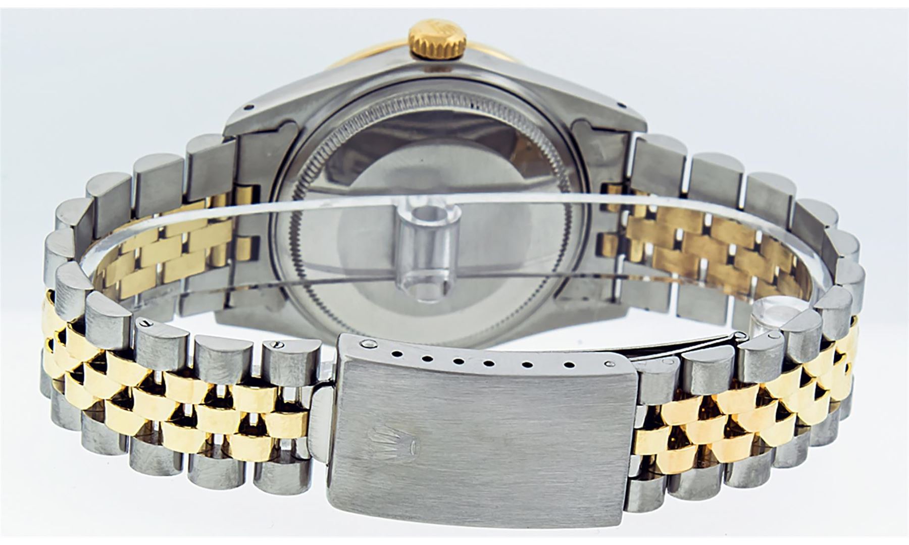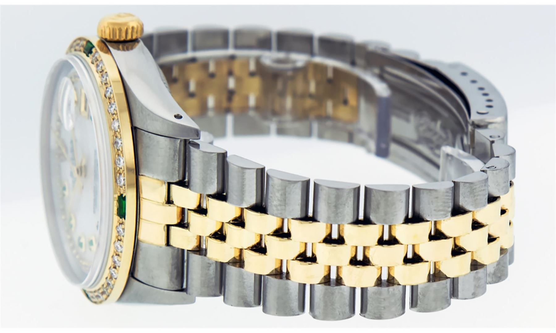 One Mens Pre Owned Yellow Gold Two Tone Rolex Datejust Polished, Serviced & Electronically Tested, Rolex Yellow Gold & Stainless Steel Case: 36mm, Rolex Yellow Gold Crown, Custom Bezel: New 18K Yellow Gold Emerald Bead set Diamond Bezel, Diamond Count: 36