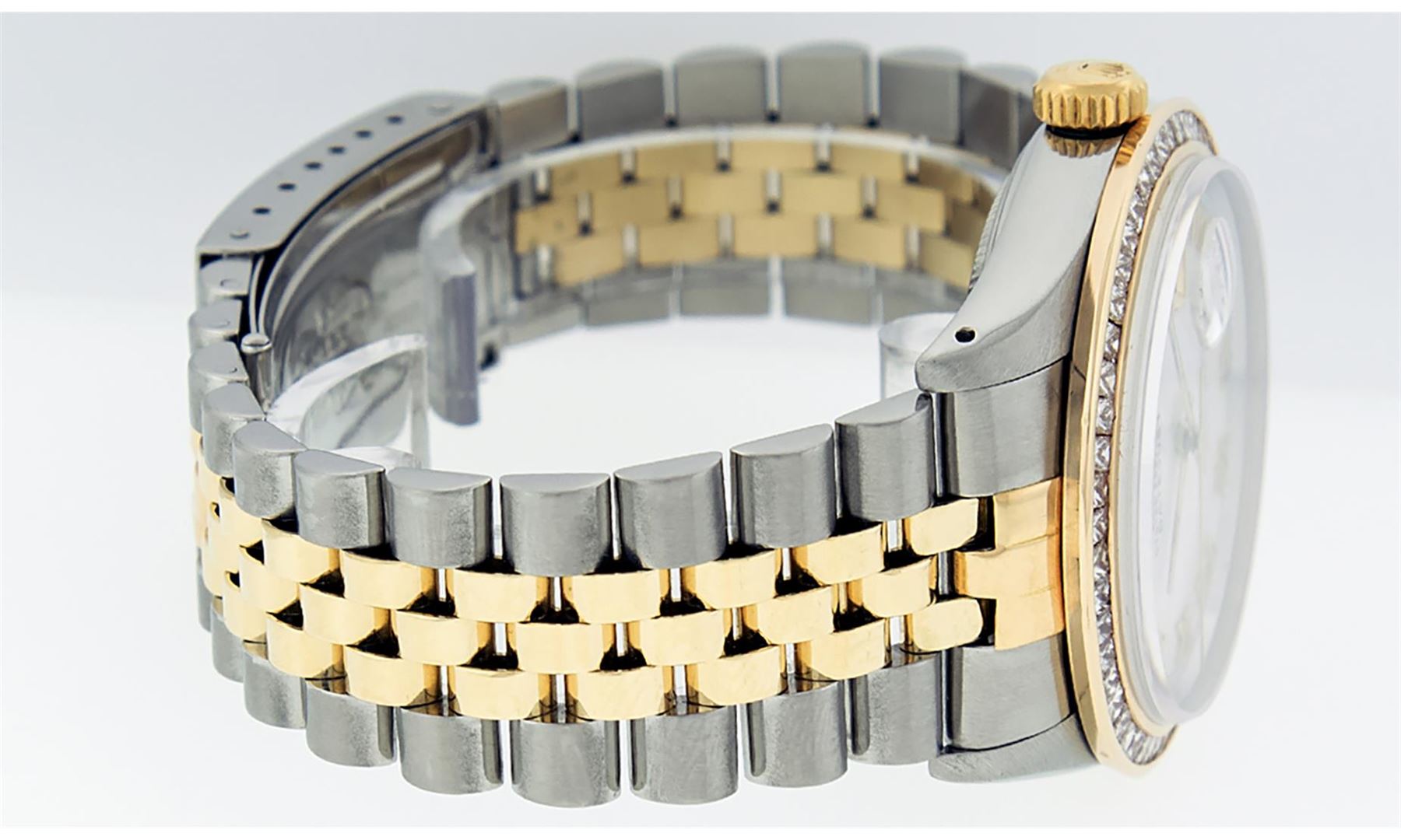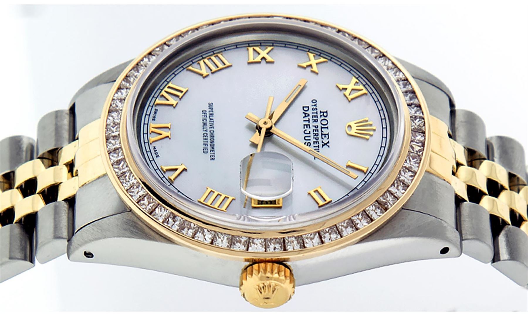 One Mens Yellow Gold Two Tone Rolex Datejust Polished Bright with Satin Finish, Serviced & Electronically Tested, Yellow Gold And Stainless Steel Case: 36mm, Yellow Gold Crown, Custom Bezel: New Yellow Gold Princess Cut Diamond Bezel, Diamond Count: 53 Diamonds, Total Weight 2.75 Carat, Clarity: SI-VS, Color: G to H. Custom Crystal: New Scratch Resistant Synthetic Sapphire Cyclops Lens. Custom Hands: New Luminecent Hands. Movement: Automatic Winding Movement. Custom Dial: Mother Of Pearl Roman Dial With Square Track. Date Window: 3 O'Clock Position Date Display, Quickset, Model: Datejust. Condition: G-6 Extra Fine. Bracelet: Yellow Gold And Stainless Steel Jubilee Band. Bright Polish & Satin Finish. 7.0 Inch Length, Adjustable. Standard Clasp, With Rolex Logo. This Watch Has Been Serviced and Polished And It Is Free Of All Dents And Scratches And Has Been Time Tested.