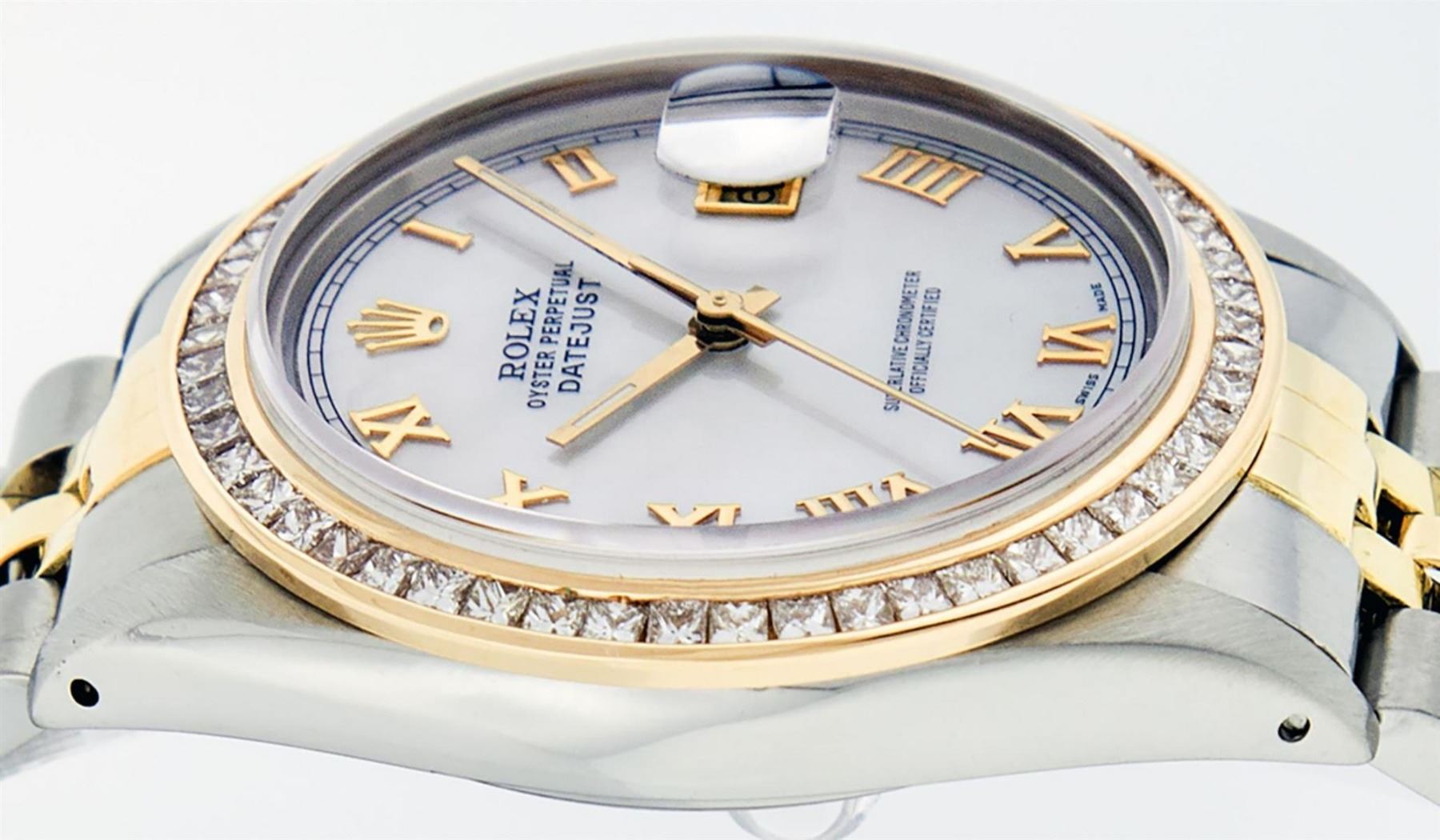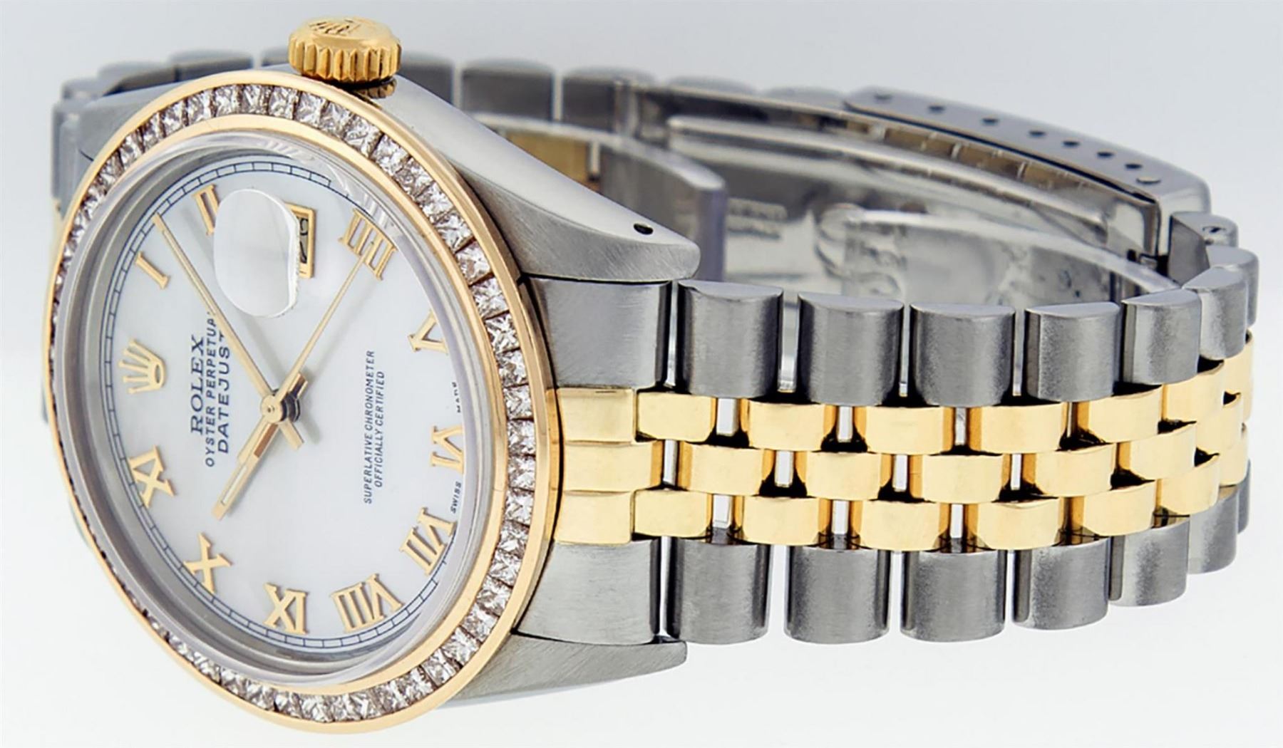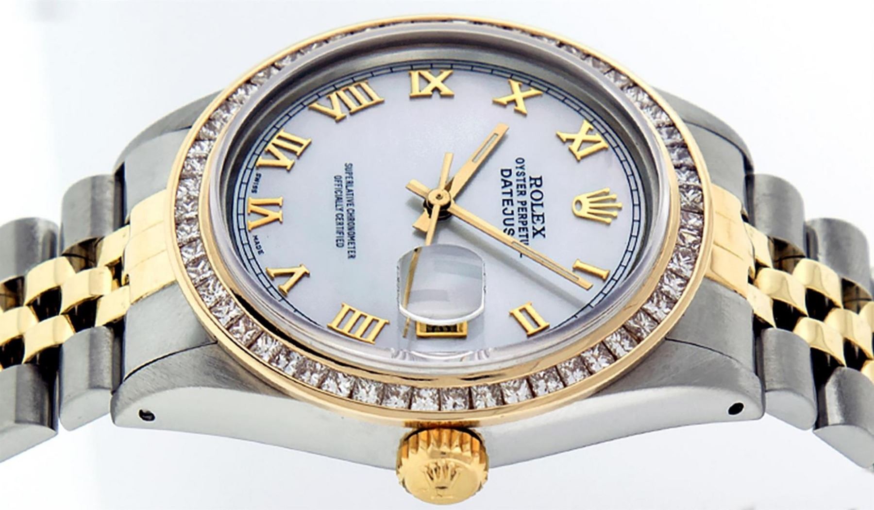 One Mens Yellow Gold Two Tone Rolex Datejust Polished Bright with Satin Finish, Serviced & Electronically Tested, Yellow Gold And Stainless Steel Case: 36mm, Yellow Gold Crown, Custom Bezel: New Yellow Gold Princess Cut Diamond Bezel, Diamond Count: 53 Diamonds, Total Weight 2.75 Carat, Clarity: SI-VS, Color: G to H. Custom Crystal: New Scratch Resistant Synthetic Sapphire Cyclops Lens. Custom Hands: New Luminecent Hands. Movement: Automatic Winding Movement. Custom Dial: Mother Of Pearl Roman Dial With Square Track. Date Window: 3 O'Clock Position Date Display, Quickset, Model: Datejust. Condition: G-6 Extra Fine. Bracelet: Yellow Gold And Stainless Steel Jubilee Band. Bright Polish & Satin Finish. 7.0 Inch Length, Adjustable. Standard Clasp, With Rolex Logo. This Watch Has Been Serviced and Polished And It Is Free Of All Dents And Scratches And Has Been Time Tested.