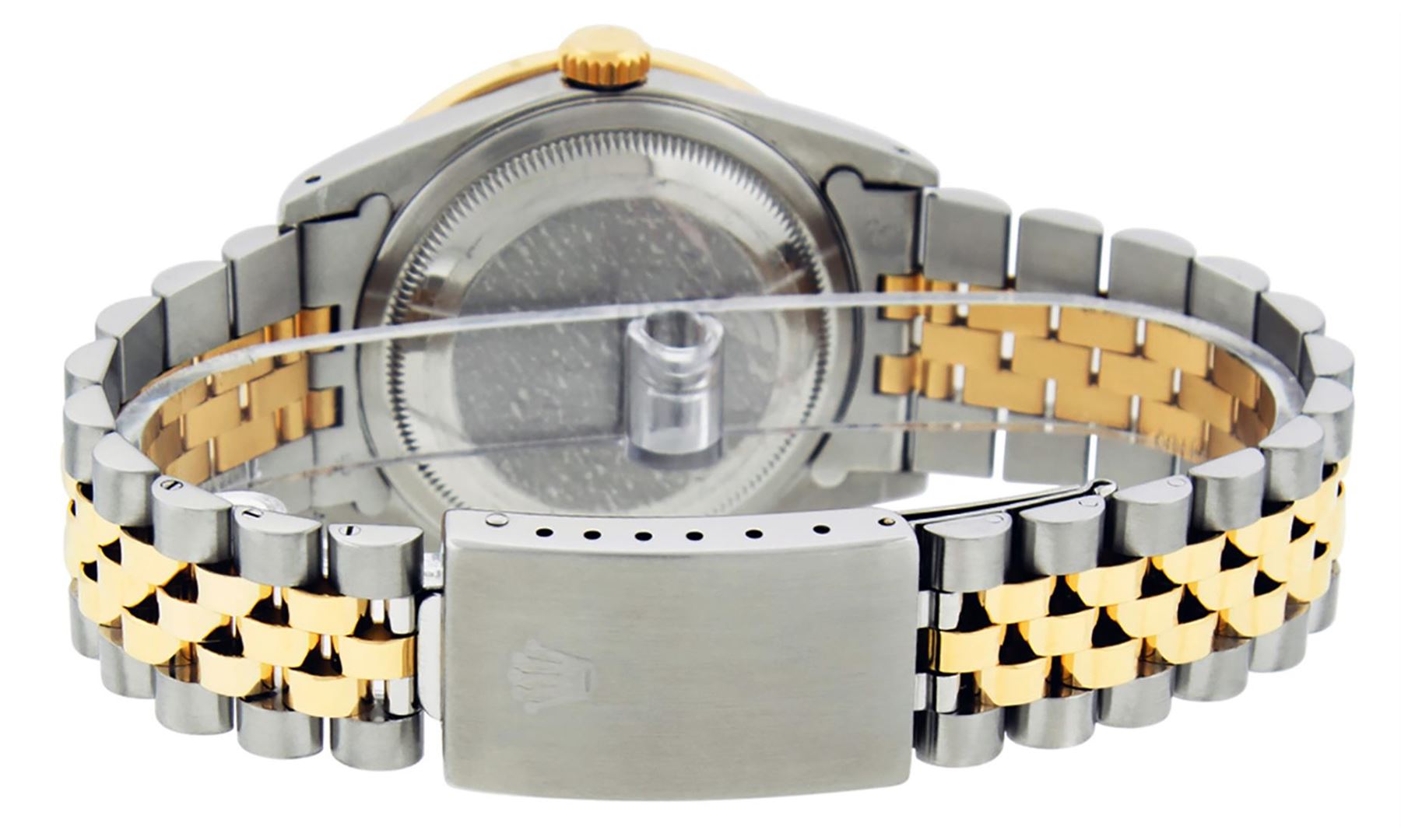 One Mens Yellow Gold & Stainless Steel Two Tone Rolex Datejust Polished Bright with Satin Finish, Serviced & Electronically Tested, Yellow Gold And Stainless Steel Case: 36mm, Yellow Gold Crown, Custom Bezel: New Yellow Gold Princess Cut Diamond Bezel, Diamond Count: 53 Diamonds, Total Weight 2.75 Carat, Clarity: SI-VS, Color: G to H. Custom Crystal: New Scratch Resistant Synthetic Sapphire Cyclops Lens. Custom Hands: New Luminecent Hands. Movement: Automatic Winding Movement. Custom Dial: Black String Diamond Dial, Diamond Count: 58 Diamond in Dial, Dial Color: G To H In Color, Clarity: VS2. Date Window: 3 O'Clock Position Date Display, Quickset, Model: Datejust. Condition: G-6 Extra Fine. Bracelet: Yellow Gold And Stainless Steel Jubilee. Bright Polish & Satin Finish. 7.0 Inch Length, Adjustable. Standard Clasp, With Rolex Logo. This Watch Has Been Serviced and Polished And It Is Free Of All Dents And Scratches And Has Been Time Tested.