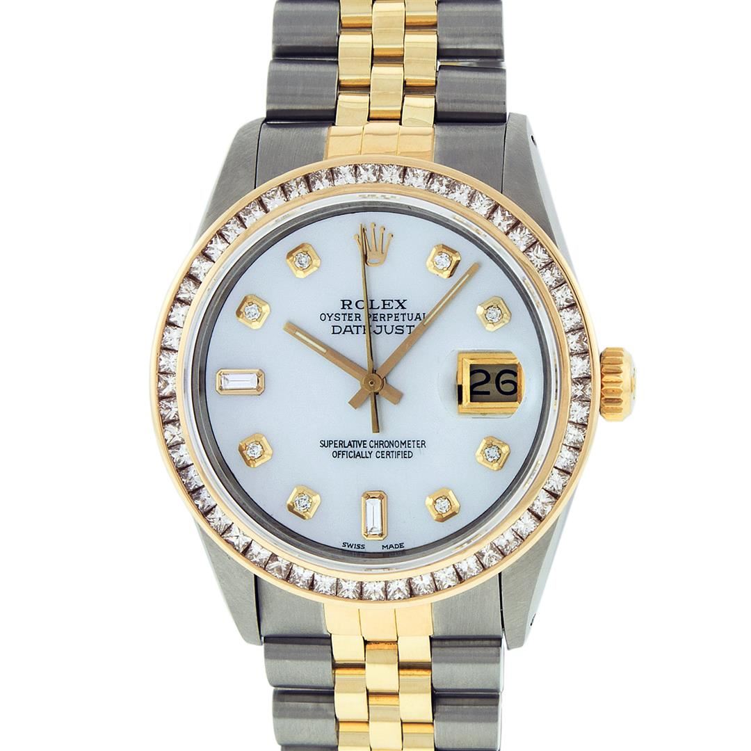 One Mens Pre Owned Yellow Gold Two Tone Rolex Datejust Polished Bright with Satin Finish, Serviced & Electronically Tested, Yellow Gold And Stainless Steel Case: 36mm, Yellow Gold Crown, Custom Bezel: New Yellow Gold Princess Cut Diamond Bezel, Diamond Count: 53 Diamonds In Bezel, Total Weight 2.75 Carat, Clarity: SI-VS, Color: G to H. Custom Crystal: New Sapphire With Date Window. Custom Hands: New Luminescent Hands. Rolex Movement: Automatic Winding Movement. Custom Dial: Mother Of Pearl 8 + 2 Diamond Dial, Diamond Count: 8 + 2 Baguette Diamonds in Dial, Dial Color: G To H In Color, Clarity: VS2. Date Window: 3 O'clock Position Date Display, Quickset, Model: Datejust. Condition: G-6 Extra Fine. Rolex Bracelet: Yellow Gold And Stainless Steel Jubilee Band. Bright Polish & Satin Finish. 7.0 Inch Length, Adjustable. Standard Clasp, With Rolex Logo. This Watch Has Been Serviced and Polished And It Is Free Of All Dents And Scratches And Has Been Time Tested.