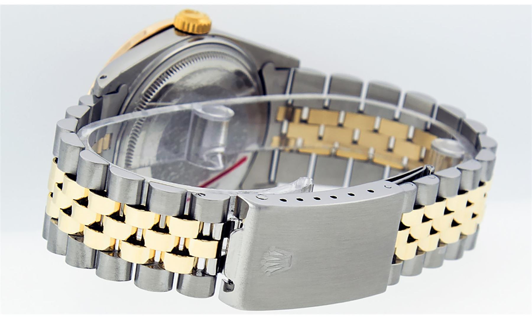 One Mens Pre Owned Yellow Gold Two Tone Rolex Datejust Polished Bright with Satin Finish, Serviced & Electronically Tested, Yellow Gold And Stainless Steel Case: 36mm, Yellow Gold Crown, Custom Bezel: New Yellow Gold Princess Cut Diamond Bezel, Diamond Count: 53 Diamonds In Bezel, Total Weight 2.75 Carat, Clarity: SI-VS, Color: G to H. Custom Crystal: New Sapphire With Date Window. Custom Hands: New Luminescent Hands. Rolex Movement: Automatic Winding Movement. Custom Dial: Mother Of Pearl 8 + 2 Diamond Dial, Diamond Count: 8 + 2 Baguette Diamonds in Dial, Dial Color: G To H In Color, Clarity: VS2. Date Window: 3 O'clock Position Date Display, Quickset, Model: Datejust. Condition: G-6 Extra Fine. Rolex Bracelet: Yellow Gold And Stainless Steel Jubilee Band. Bright Polish & Satin Finish. 7.0 Inch Length, Adjustable. Standard Clasp, With Rolex Logo. This Watch Has Been Serviced and Polished And It Is Free Of All Dents And Scratches And Has Been Time Tested.