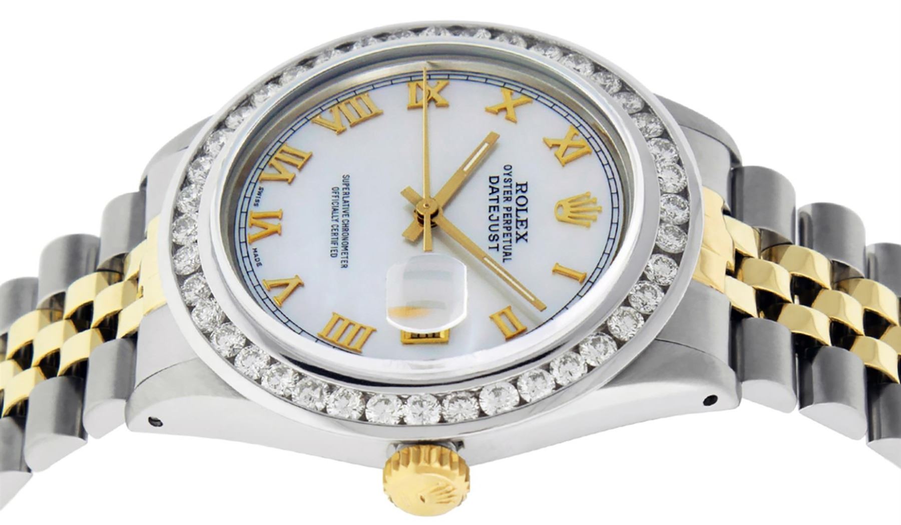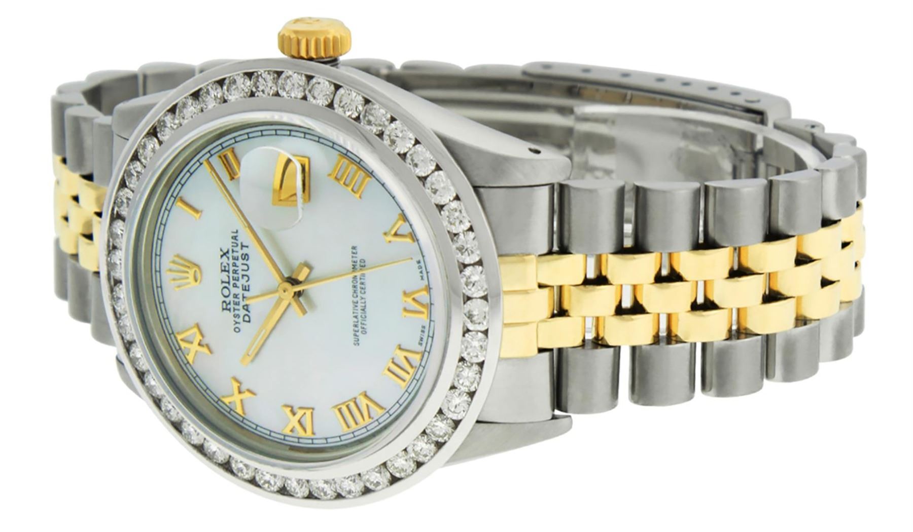 One Mens Pre Owned Yellow Gold and Stainless Steel Rolex Datejust Polished Bright with Satin Finish, Serviced & Electronically Tested, Rolex Stainless Steel Case: 36mm, Rolex Yellow Gold Crown, Custom Bezel: New 18K White Gold 3ct Channel Set Diamond Bezel, Diamond Count: 40 Diamonds, Total Weight 3.00 Carat, Clarity: SI-VS, Color: G to H. Custom Crystal: New Sapphire Magnified Lens. Custom Hands: New Luminecent Hands. Rolex Movement: Automatic Winding Movement. Rolex Dial: Refinished White Roman Dial With Square Track. Date Window: 3 O'Clock Position Date Display, Quickset, Model: Datejust Condition: G-6 Extra Fine. Rolex Bracelet: Yellow Gold And Stainless Steel Jubilee Band. Bright Polish & Satin Finish. 7.0 Inch Length, Adjustable. Standard Clasp, With Rolex Logo. This Watch Has Been Serviced And Polished It Is Free Of All Scratches And Dents.