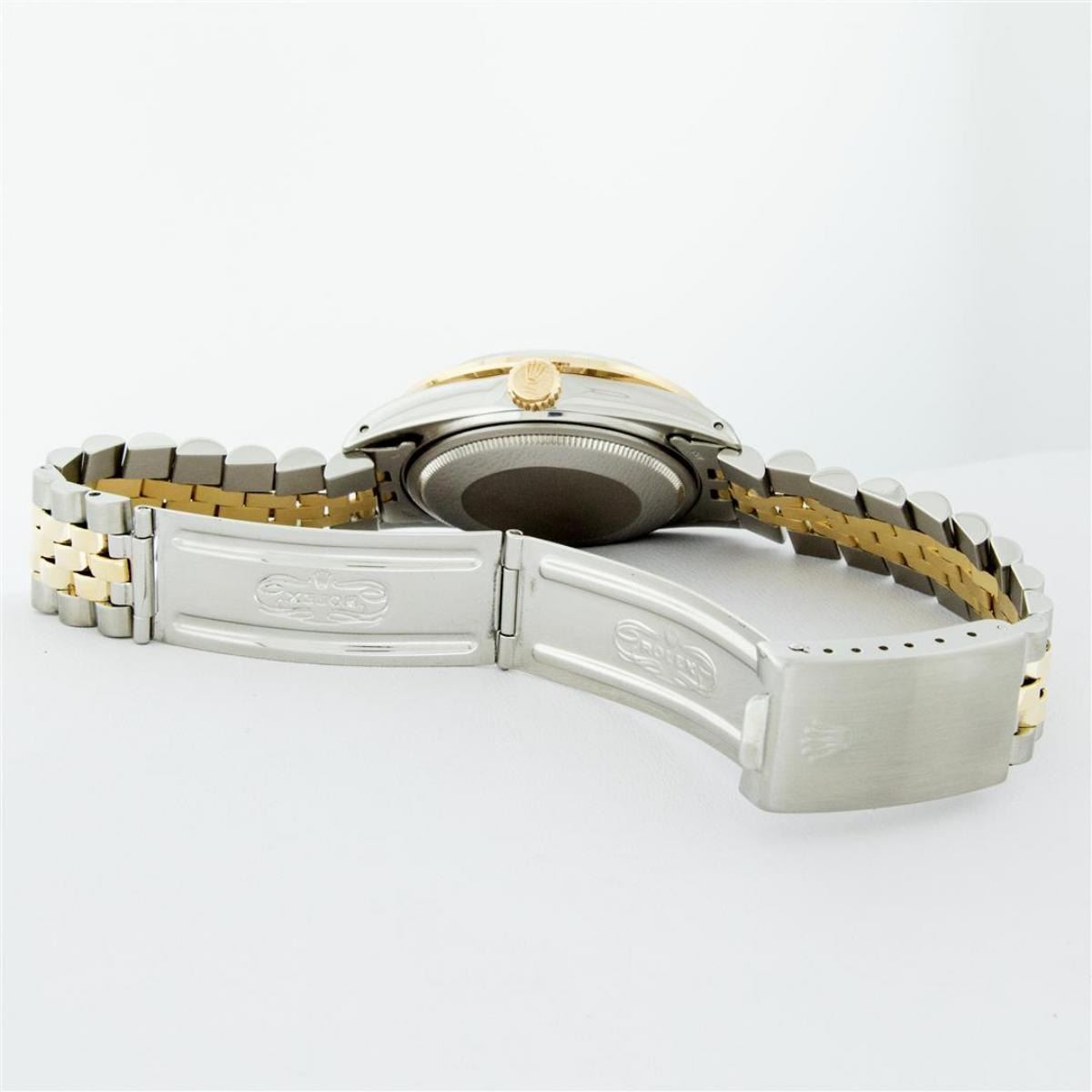 One Mens Yellow Gold Rolex Datejust Polished Bright with Satin Finish, Serviced & Electronically Tested, Stainless Steel Case: 36mm, Yellow Gold Crown, Custom Bezel: New 18K Yellow Gold Pyramid Diamond Bezel, Diamond Count: 24 Diamonds, Total Weight .75 Carat, Clarity: SI-VS, Color: G to H. Custom Crystal: New Scratch Resistant Synthetic Sapphire Cyclops Lens. Custom Hands: New Luminecent Hands. Movement: Automatic Winding Movement . Custom Dial: Mother Of Pearl With Sqaure Track. Date Window: 3 O'Clock Position Date Display, Quickset, Model: Datejust. Condition: G-6 Extra Fine. Bracelet: Yellow Gold And Stainless Steel Jubilee Band. Bright Polish & Satin Finish. 7.0 Inch Length, Adjustable. Standard Clasp, With Rolex Logo. This Watch Has Been Serviced And Polished It Is Free Of All Scratches And Dents.